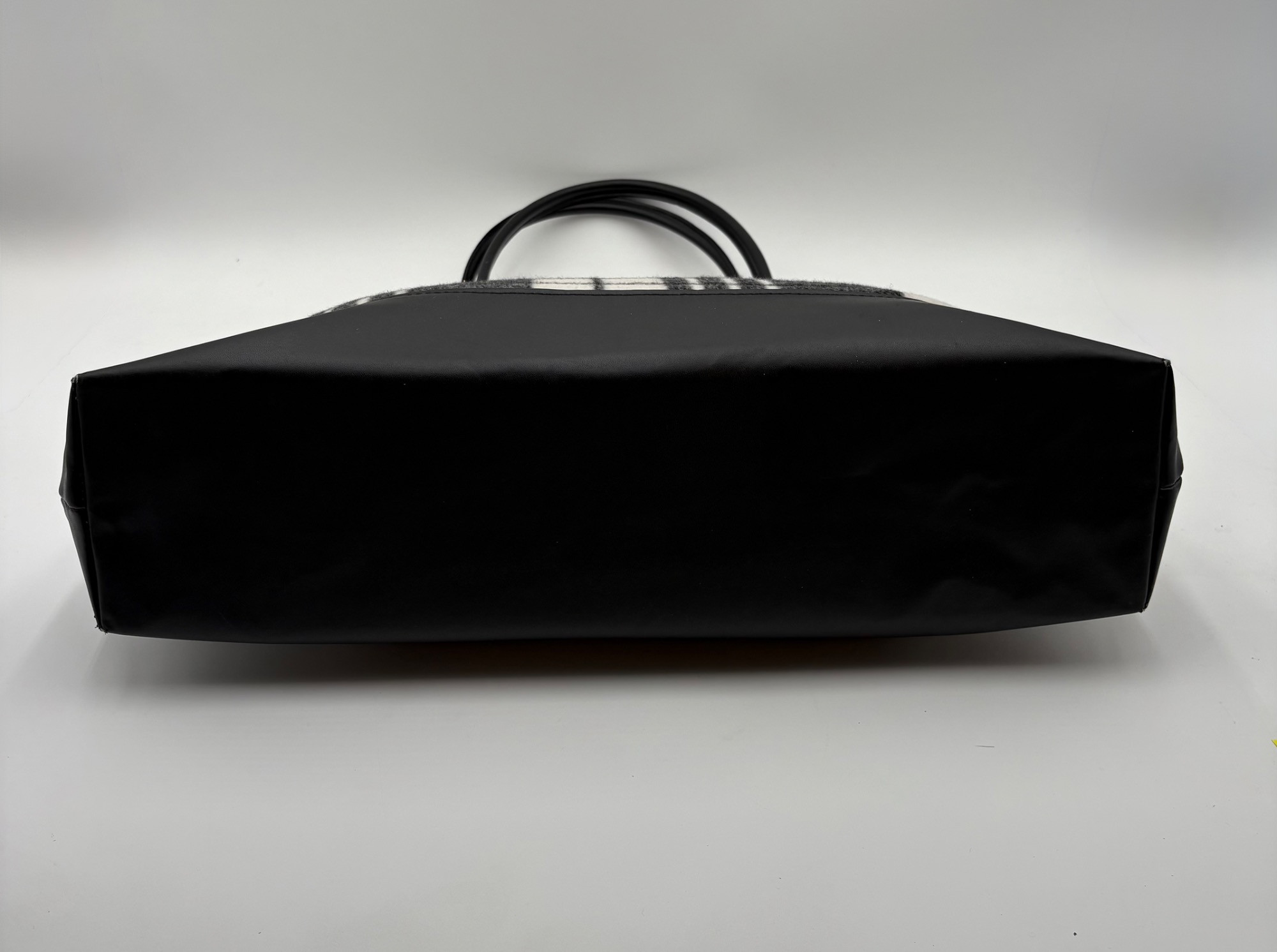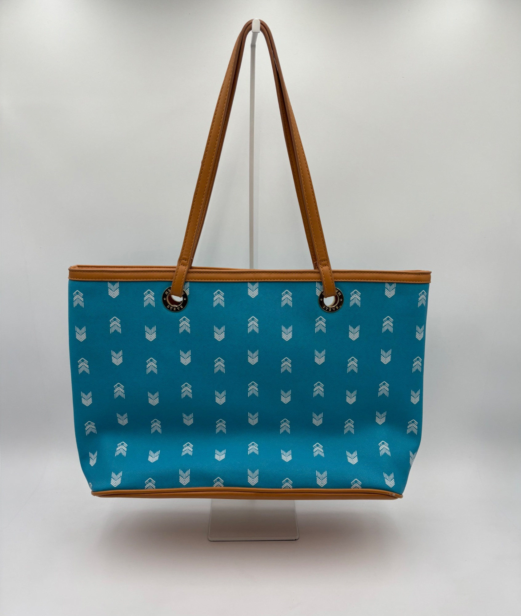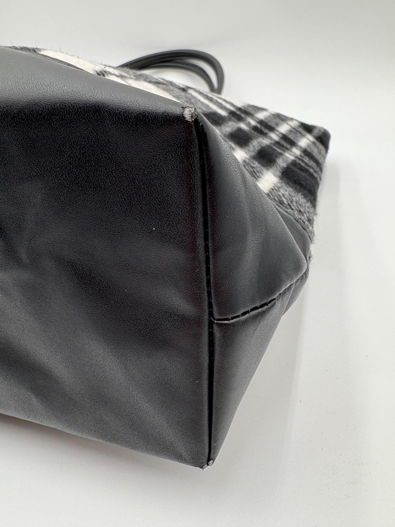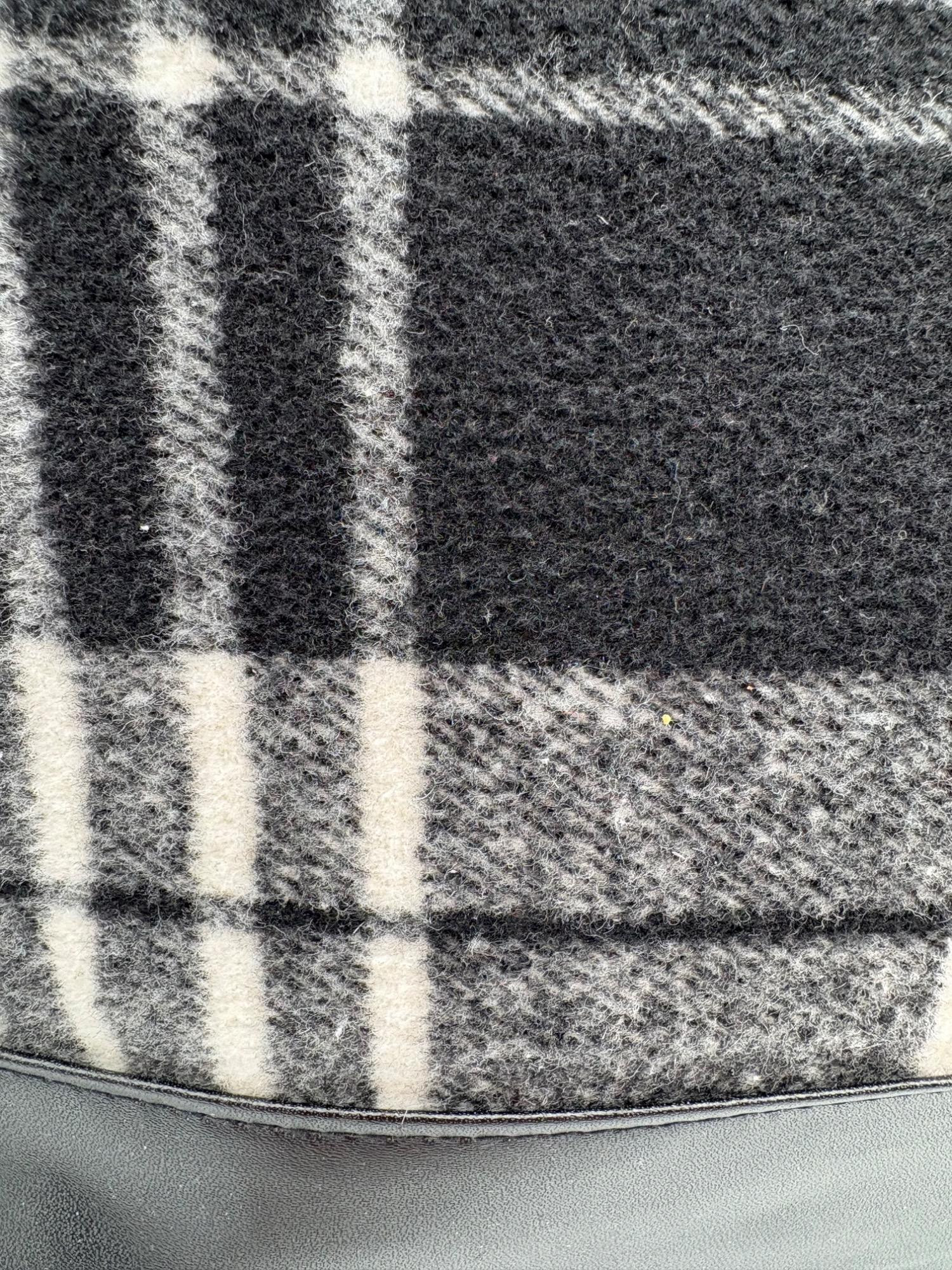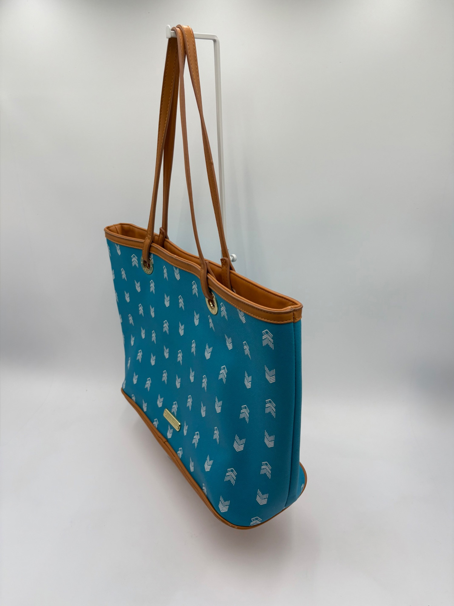 Pair of totes in good condition from Steve Madden & DSW. Madden tote in turquoise & white vinyl with viny brown trim/bottom, gold hardware, magnetic top closure, herringbone fabric lining, interior zip/slide pockets, and metal logo plate on exterior. Bag is used, but shows little wear except for 2 spots on lower edge - see last 2 photos of this bag. DSW black & white flannel tote with vinyl straps/bottom, magnetic top closure, and single zip pocket in black fabric interior lining. In good used condition with some wear flaws at lower corners & straps. See last 3 photos of this bag. Madden bag measures 12" H x 16" W with 9" drop from top of straps to top center of bag. DSW bag measures 13" H x 17.5" W with 11" drop from top of straps to top center of bag.