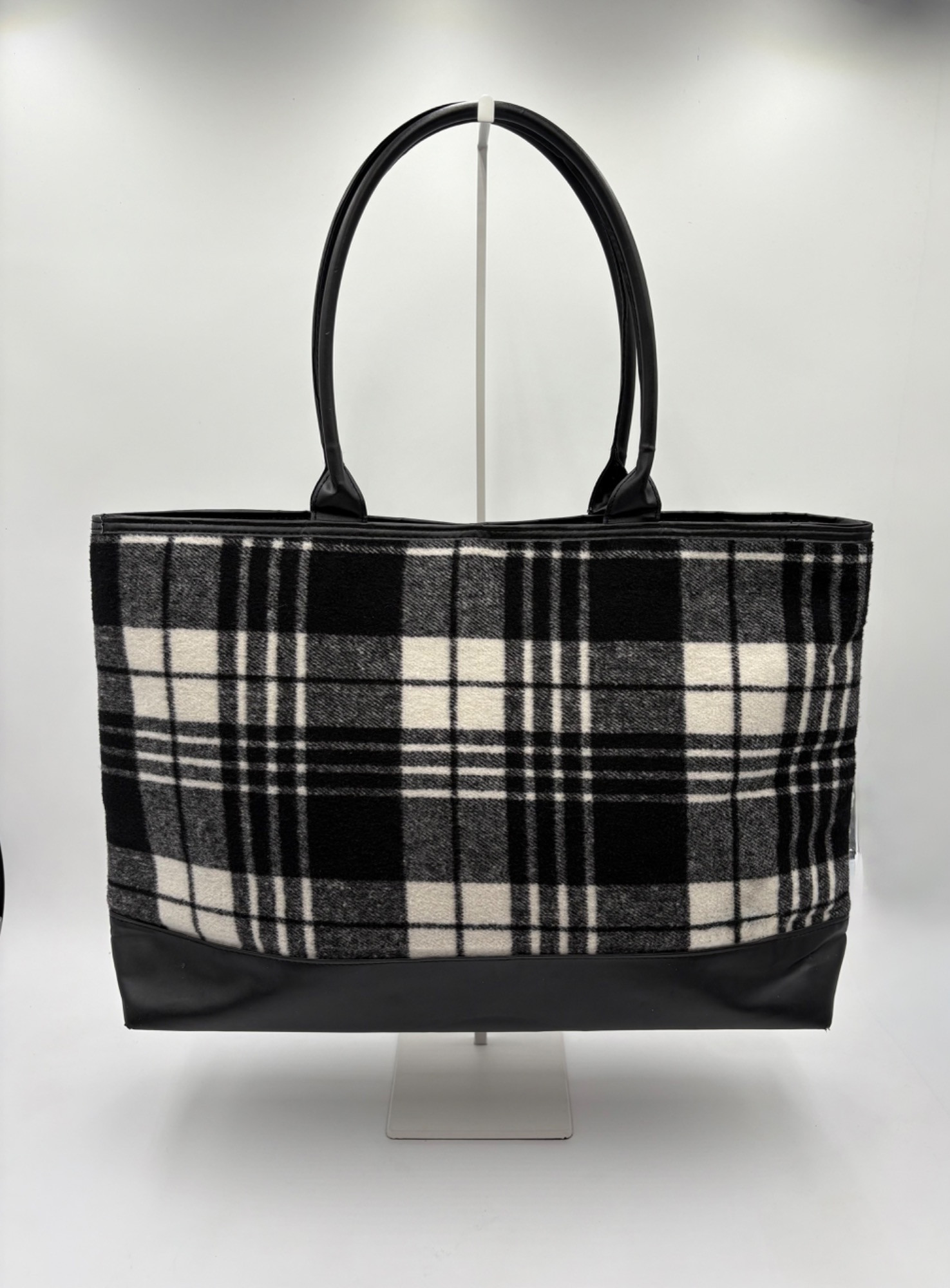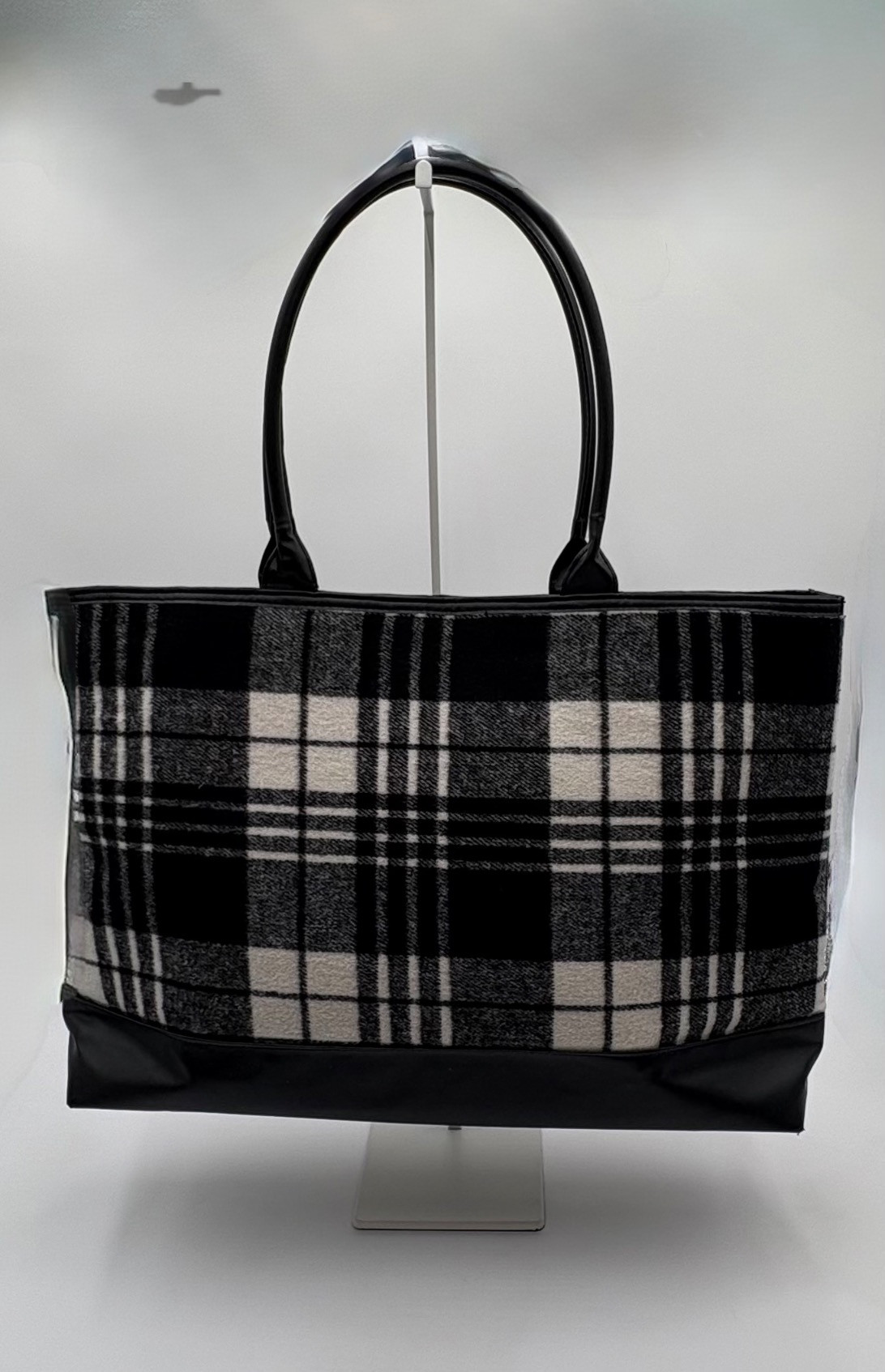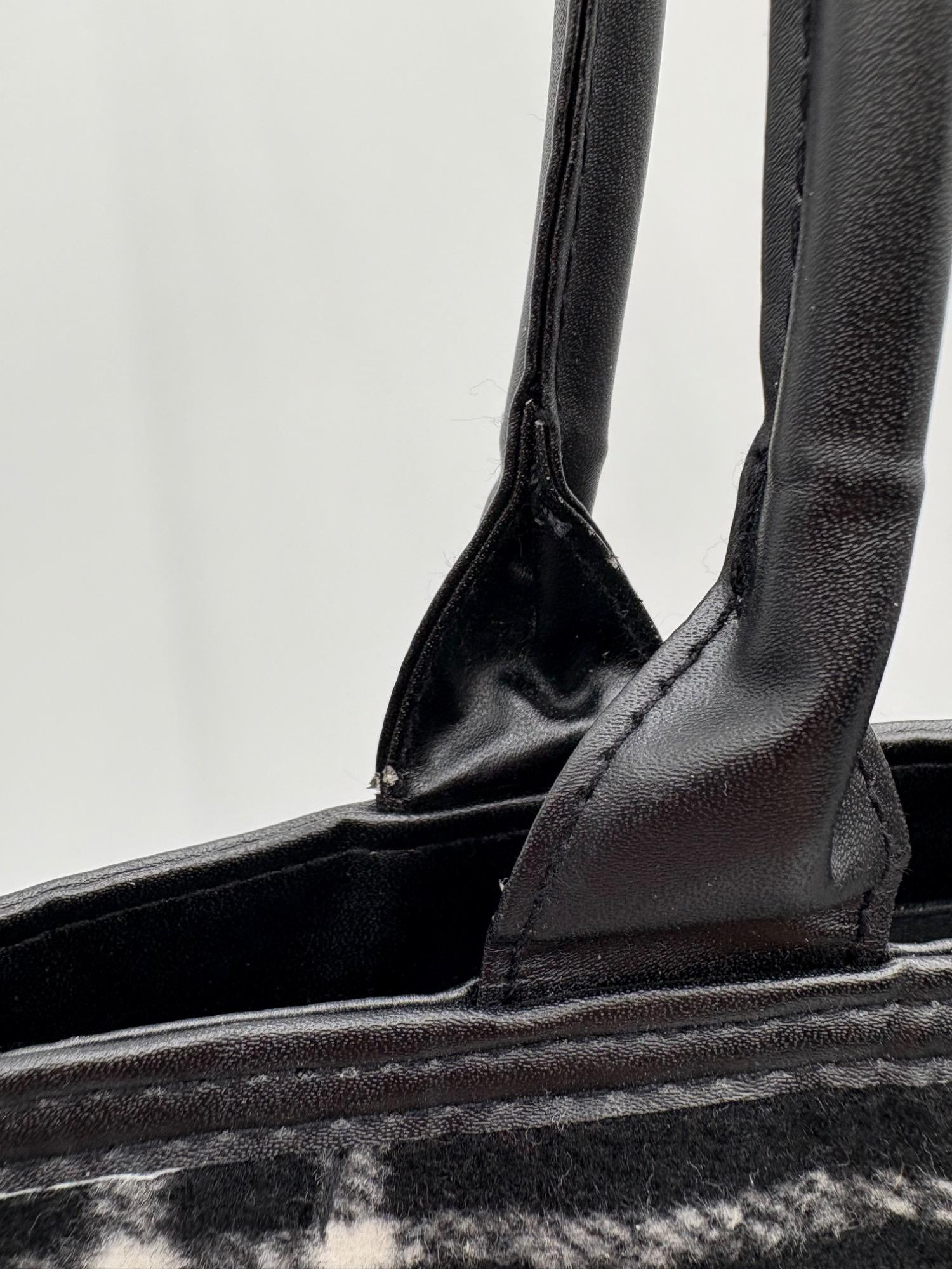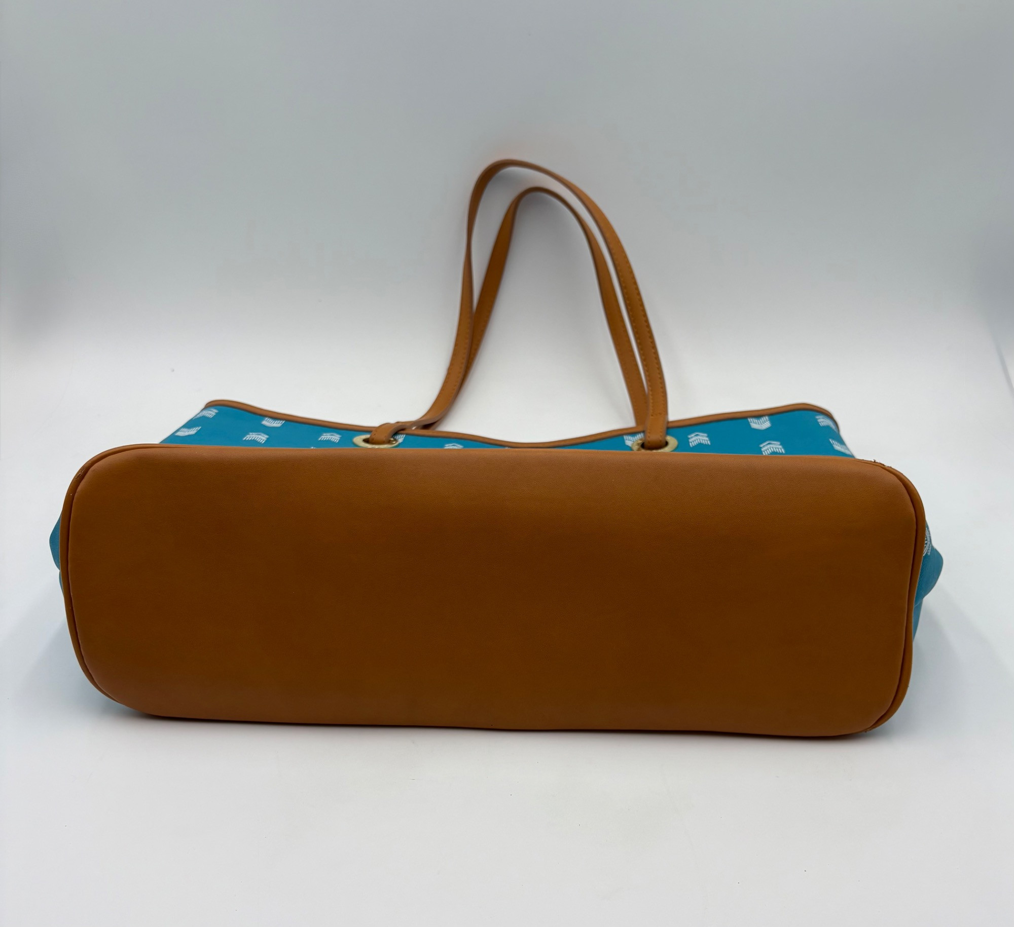 Pair of totes in good condition from Steve Madden & DSW. Madden tote in turquoise & white vinyl with viny brown trim/bottom, gold hardware, magnetic top closure, herringbone fabric lining, interior zip/slide pockets, and metal logo plate on exterior. Bag is used, but shows little wear except for 2 spots on lower edge - see last 2 photos of this bag. DSW black & white flannel tote with vinyl straps/bottom, magnetic top closure, and single zip pocket in black fabric interior lining. In good used condition with some wear flaws at lower corners & straps. See last 3 photos of this bag. Madden bag measures 12" H x 16" W with 9" drop from top of straps to top center of bag. DSW bag measures 13" H x 17.5" W with 11" drop from top of straps to top center of bag.