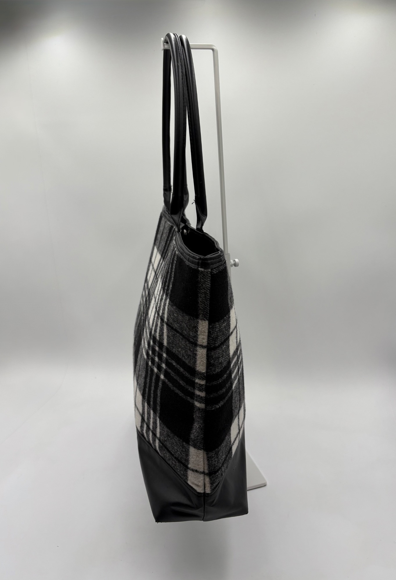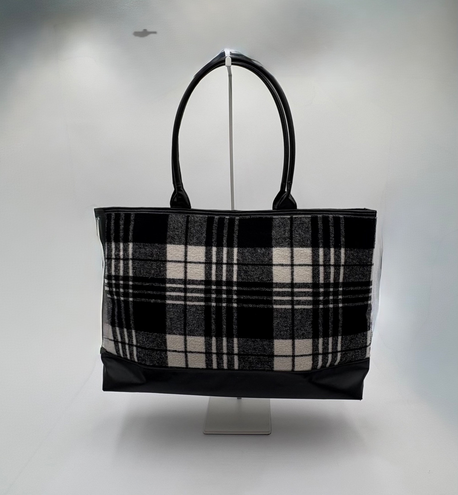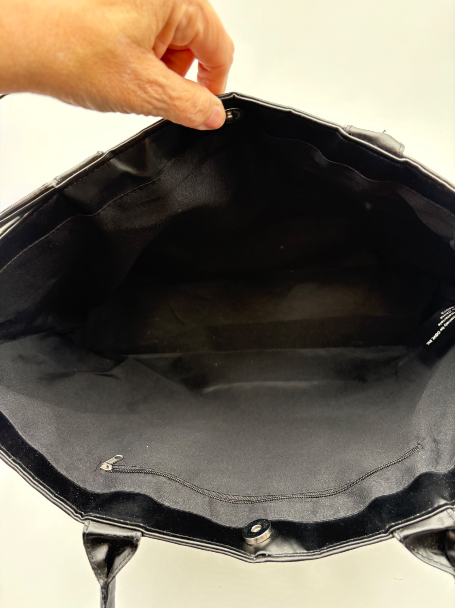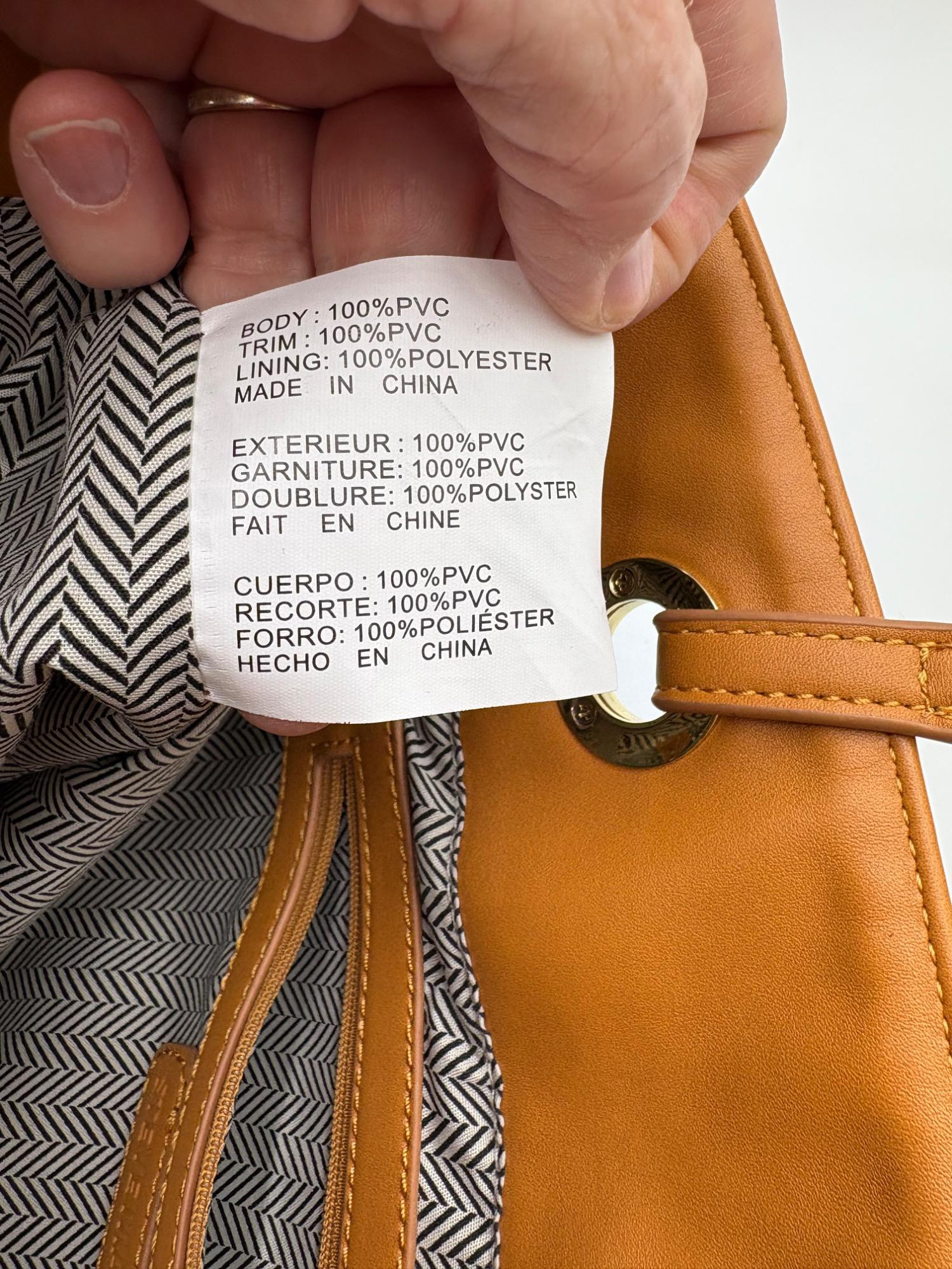 Pair of totes in good condition from Steve Madden & DSW. Madden tote in turquoise & white vinyl with viny brown trim/bottom, gold hardware, magnetic top closure, herringbone fabric lining, interior zip/slide pockets, and metal logo plate on exterior. Bag is used, but shows little wear except for 2 spots on lower edge - see last 2 photos of this bag. DSW black & white flannel tote with vinyl straps/bottom, magnetic top closure, and single zip pocket in black fabric interior lining. In good used condition with some wear flaws at lower corners & straps. See last 3 photos of this bag. Madden bag measures 12" H x 16" W with 9" drop from top of straps to top center of bag. DSW bag measures 13" H x 17.5" W with 11" drop from top of straps to top center of bag.