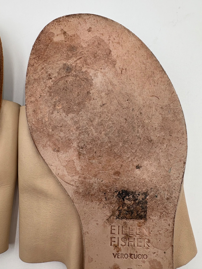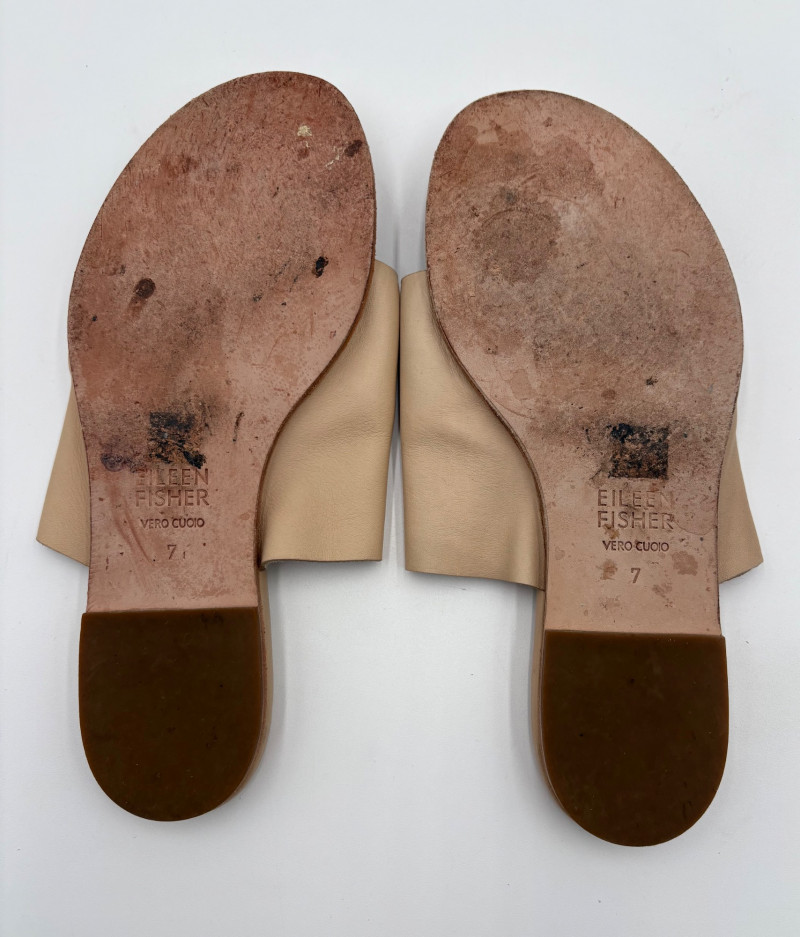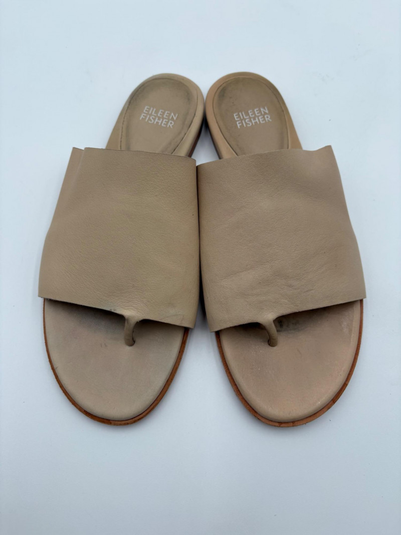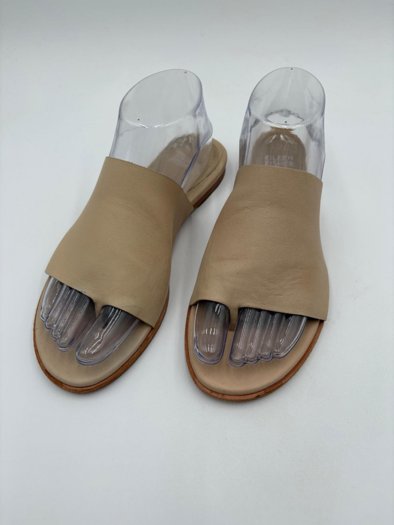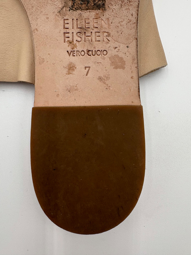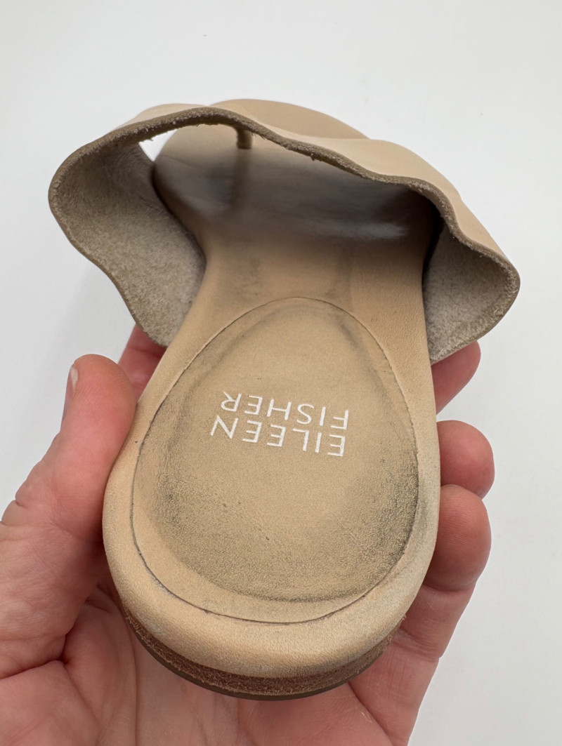 Beige flip-flop style sandals from Eileen Fisher. Natural color leather soles with colored leather, insole, and upper. Extra padding on heel. In good used condition with some wear on soles, but look almost new when on. Size 7