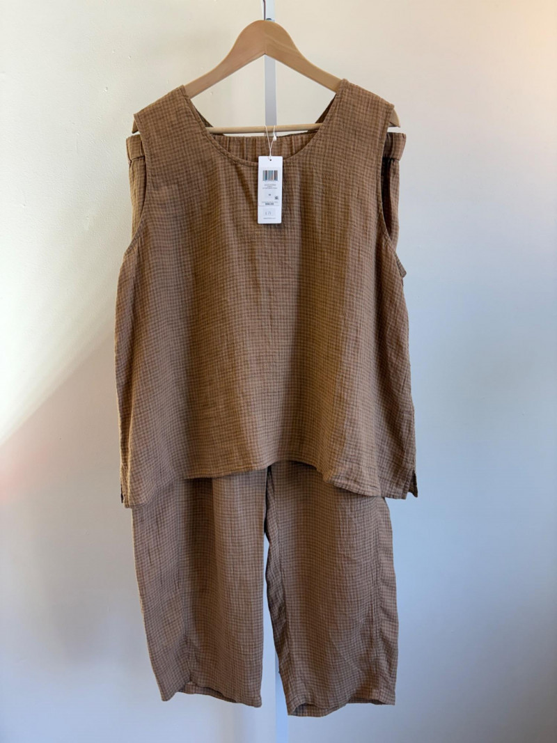 Two piece casual linen set in brown & tan check from Eileen Fisher. Sleeveless shell top has scoop neck and split hem. New with tag. 100% organic linen. Measures 24" pit to pit and 21.5" from back neckline to back hemline. Size tag says 1X. Pants in the same fabric with elasticated waistband, two small front pleats, and front set-in pockets. Back of pants have unusual construction with seam running along the back of each bun down to the bottom of the leg - probably better shaping through this tailoring technique. We believe these may be new, but there is no hang tag. Measure 18.5" side to side at waist with 26" inseam. Size tag says XL.