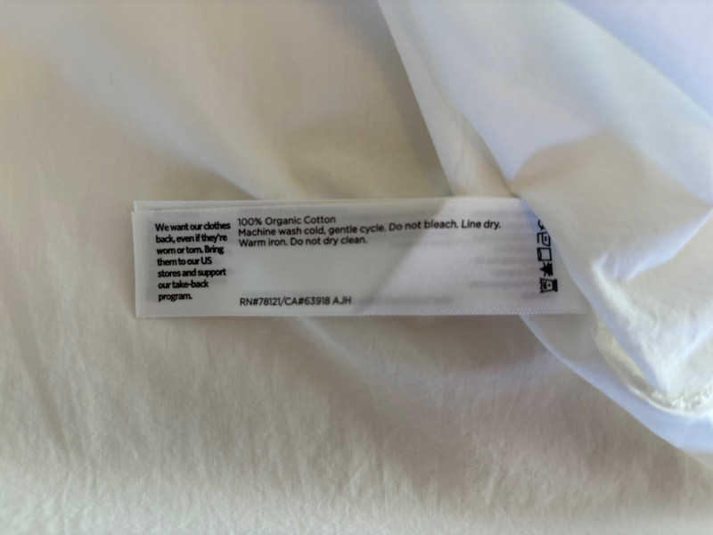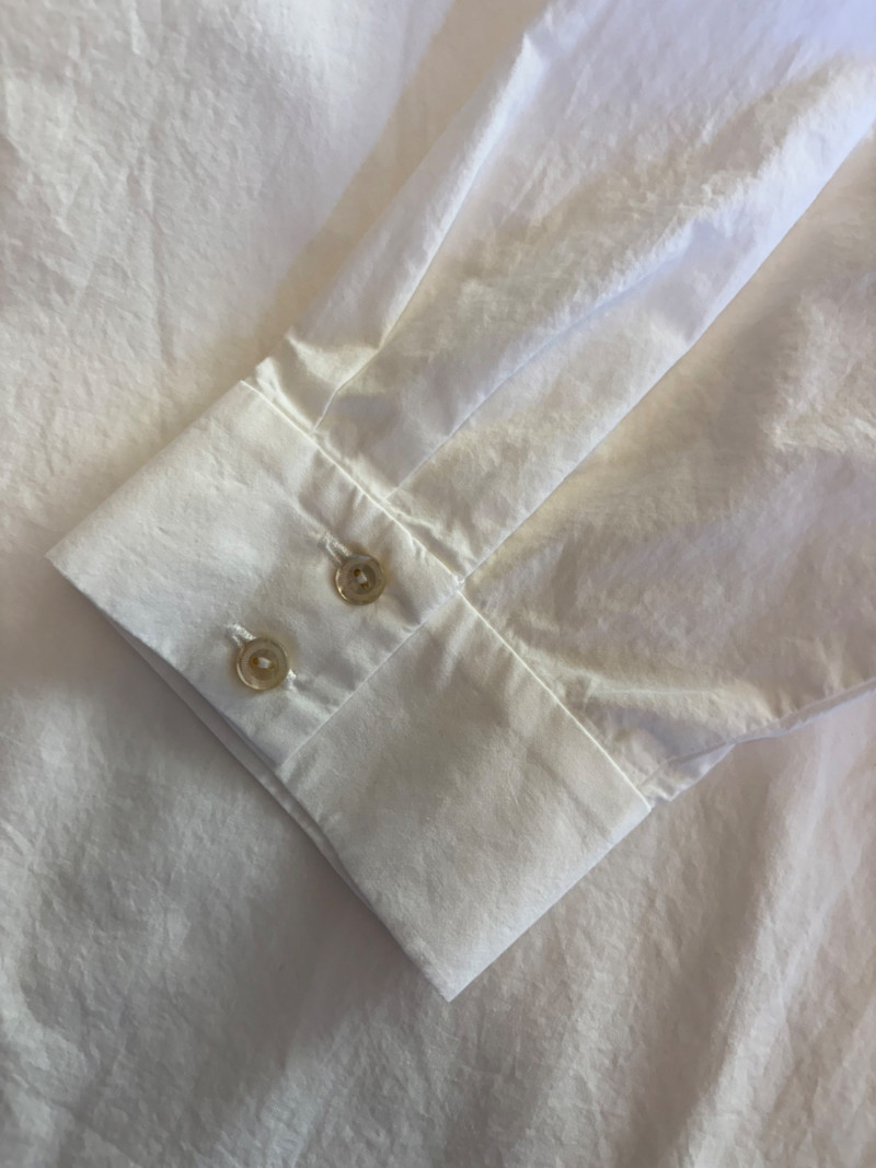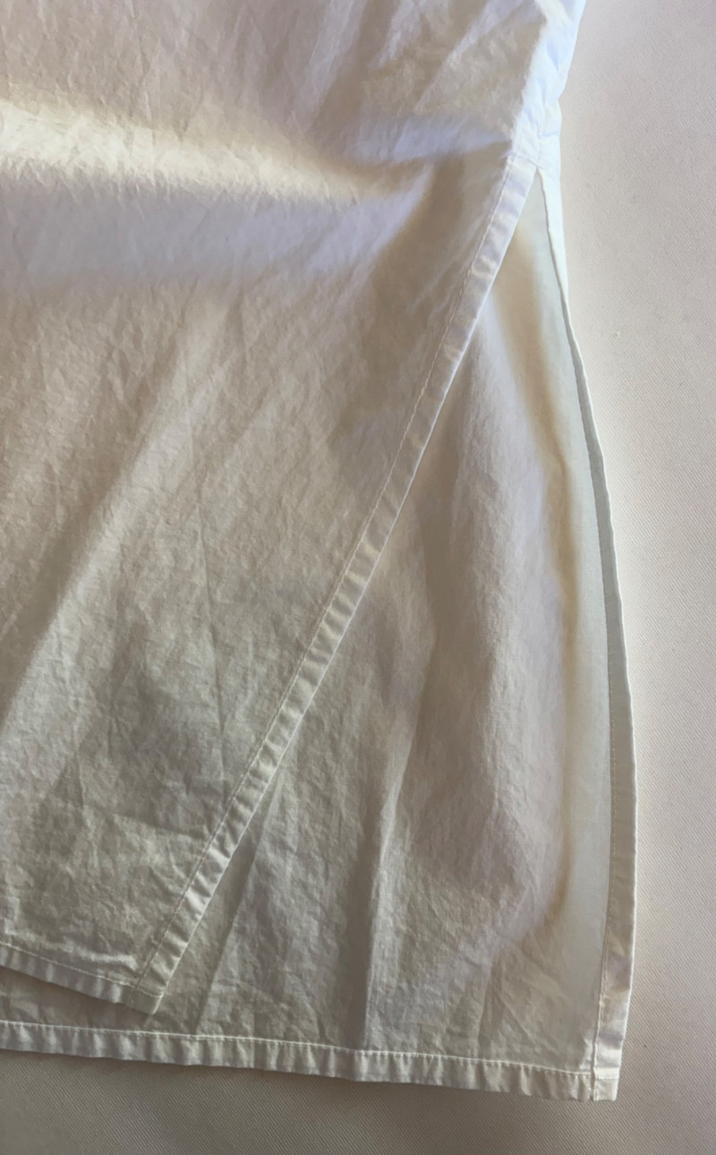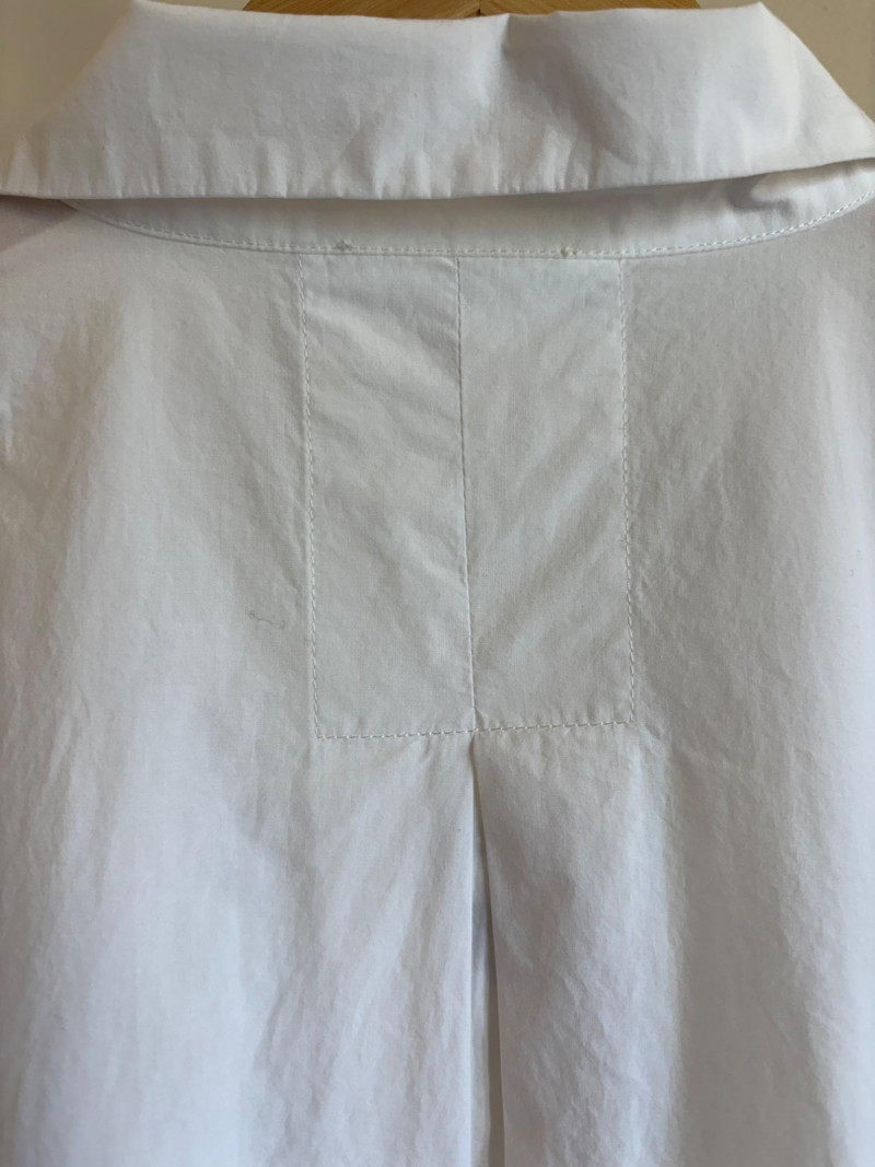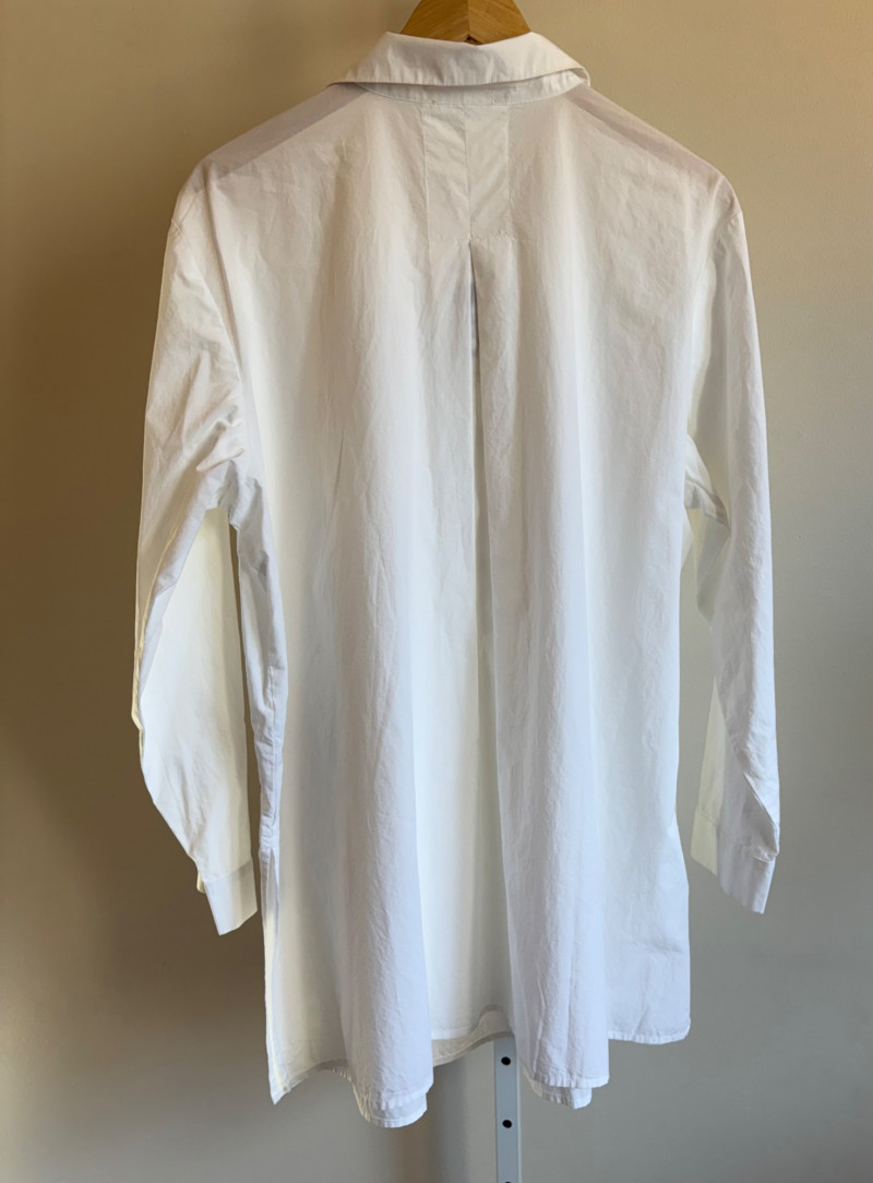 Classic tunic/shirt in white with poplin weave. Pleated lap front opening, two-button cuff closures, and centered back pleat along with split hem. New with tag. 100% organic cotton. Measures 25" pit to pit and 31" from center back neck seam to back hemline. Size tag says XL.
