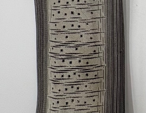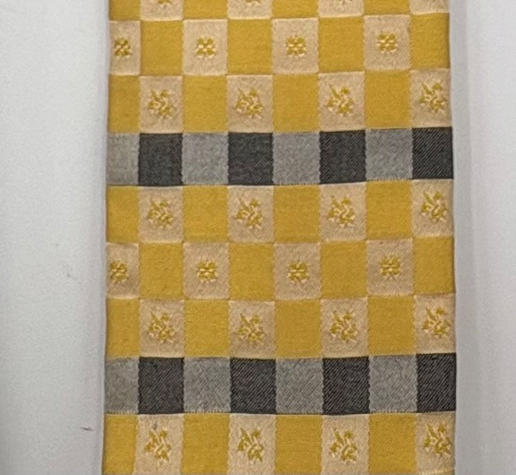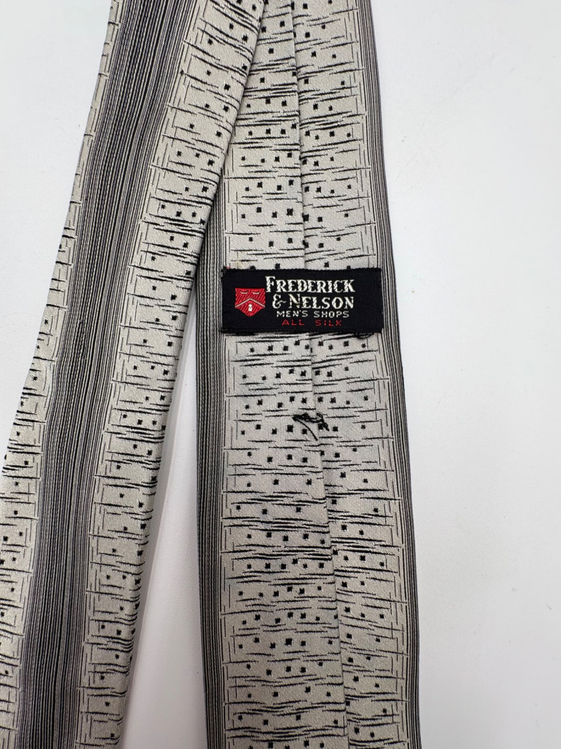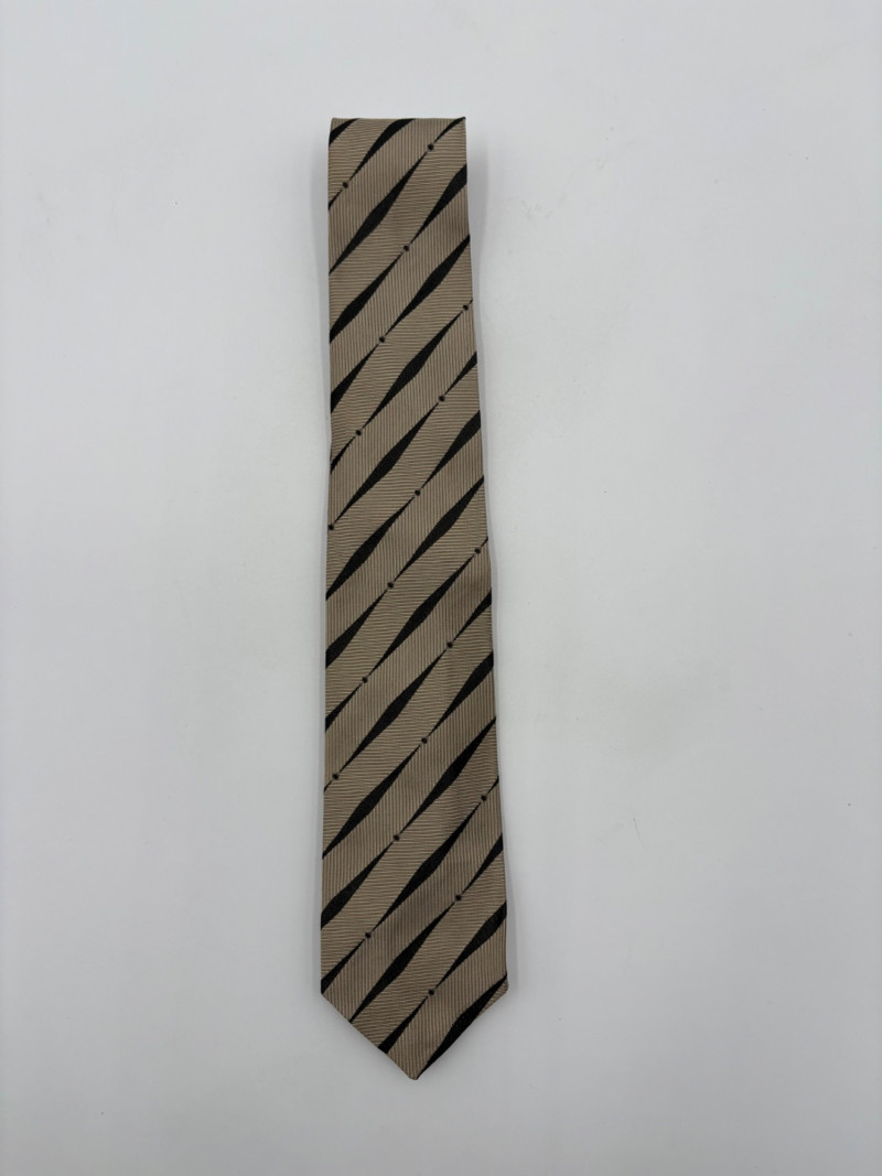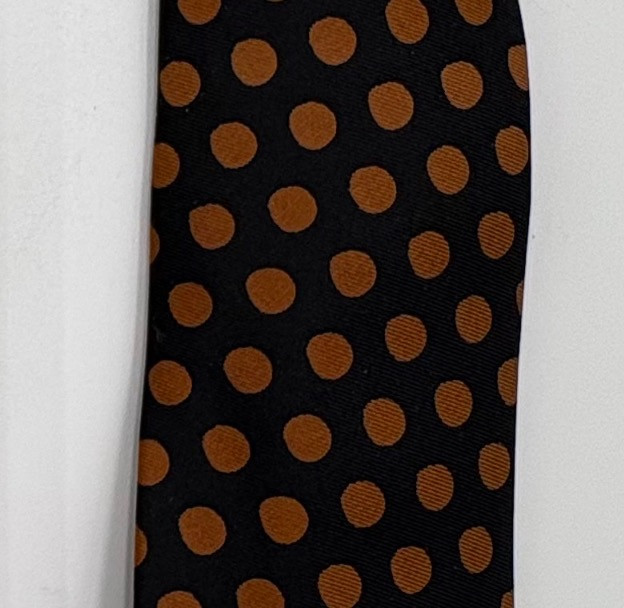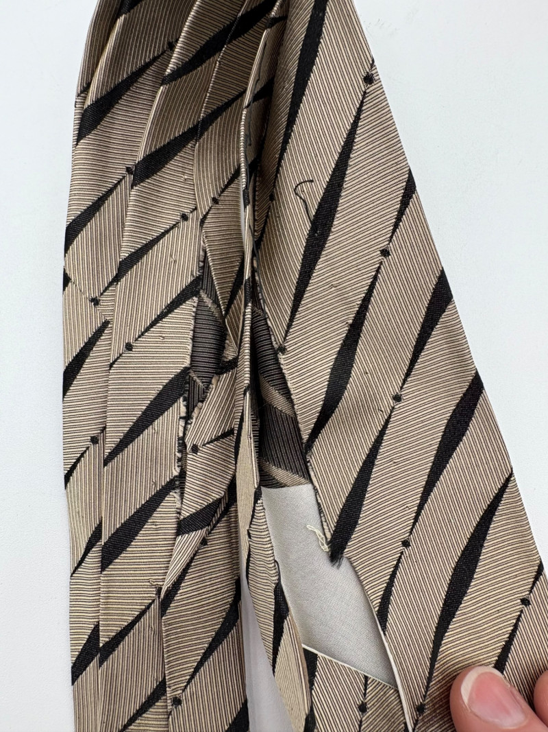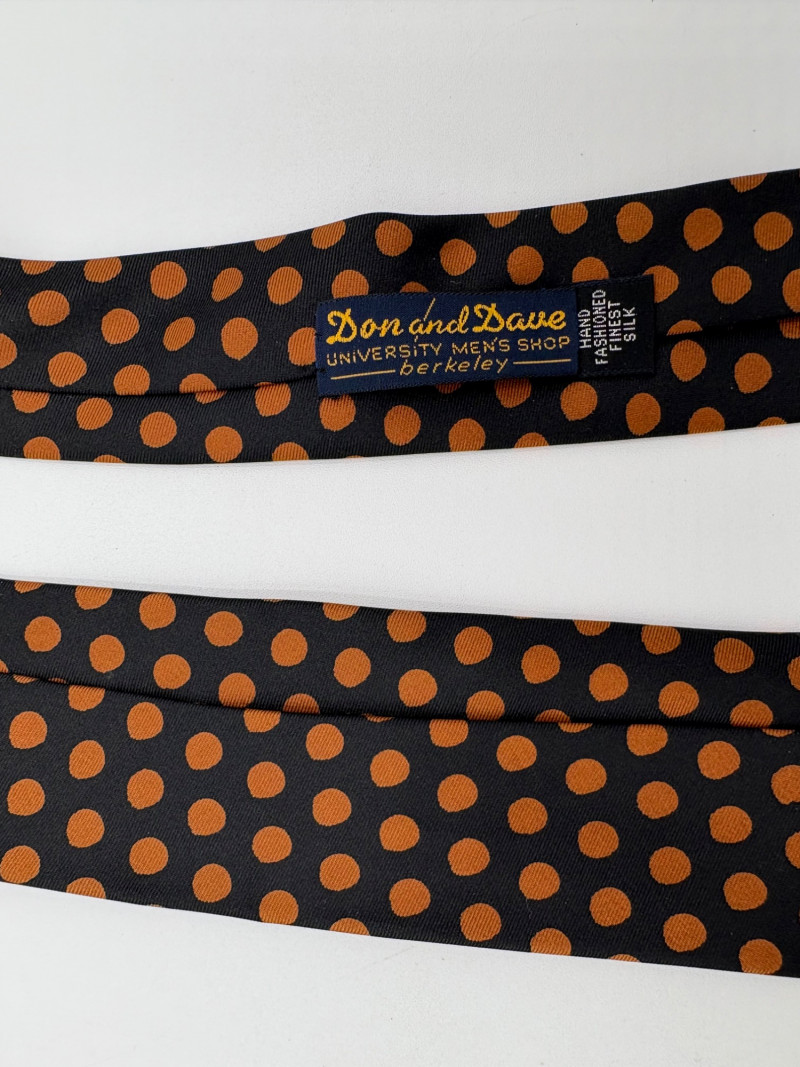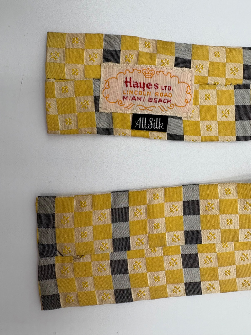 3 gorgeous vintage neckties out of luxurious fabrics for a softened menswear look with traditional shirts. Wonderful look when paired a flowing pair of feminine pants. Grey, yellow, black, and cream check tie from Hayes Ltd. of Miami Beach. Squared off end in 100% silk. In excellent condition. Measures 26". Brown polka dots on midnight blue background tie from Dan and Dave of Berkeley. Pointed end in 100% silk. In excellent condition. Measures 26". Silver & black asymmetric funky print tie from Frederick & Nelson. In excellent condition. Pointed end in 100% silk. Measures 27". BONUS: Black & gold geometric textured tie from unknown maker. Pointed end in what appears to be silk. Please note the the center seam needs so be whipstitched back together in several places. - see last photo. Measures 26".