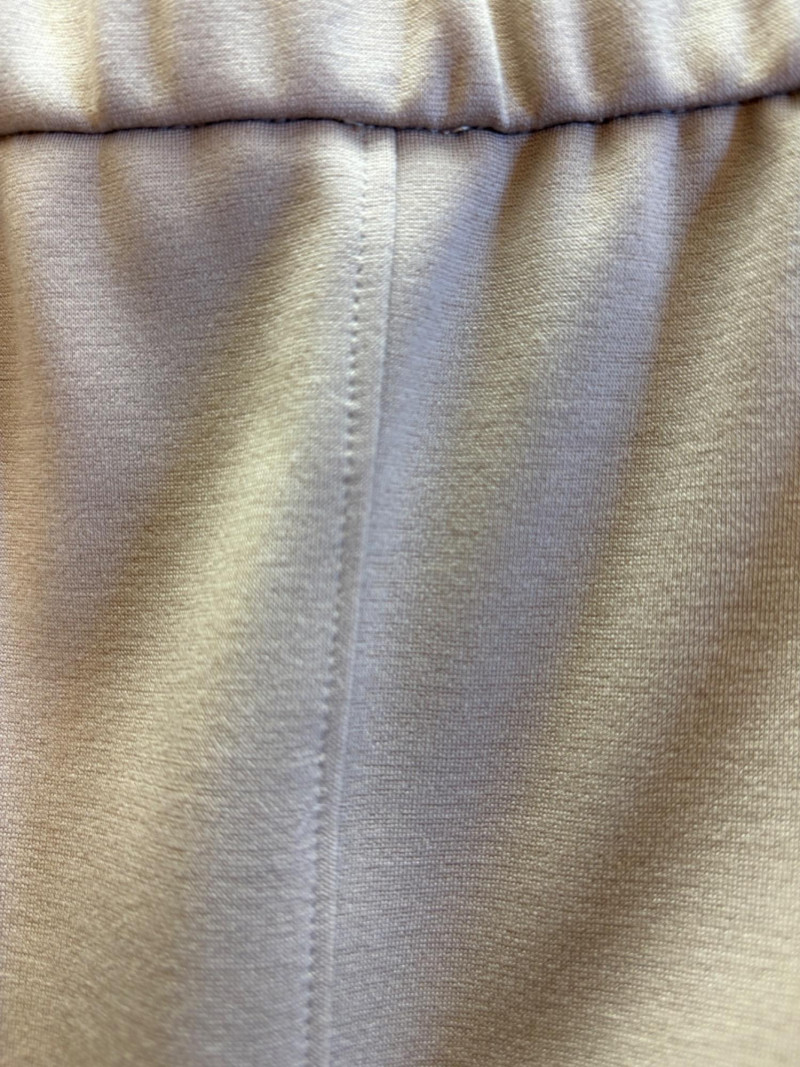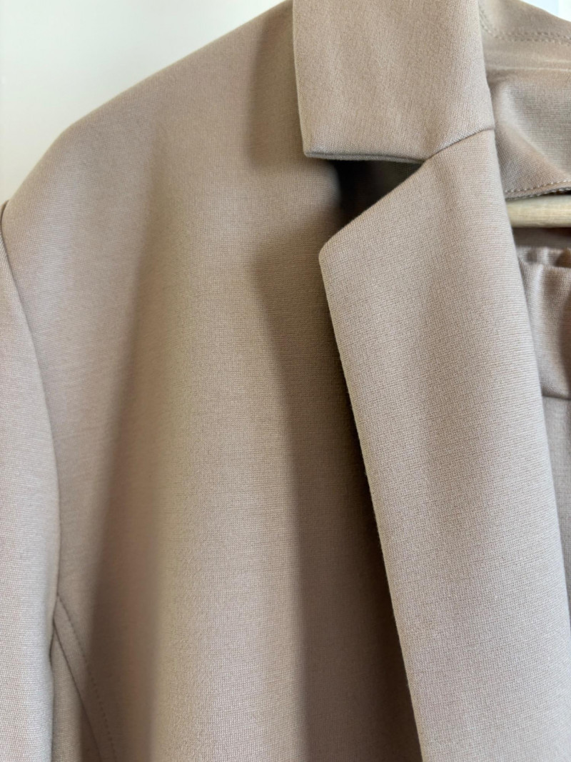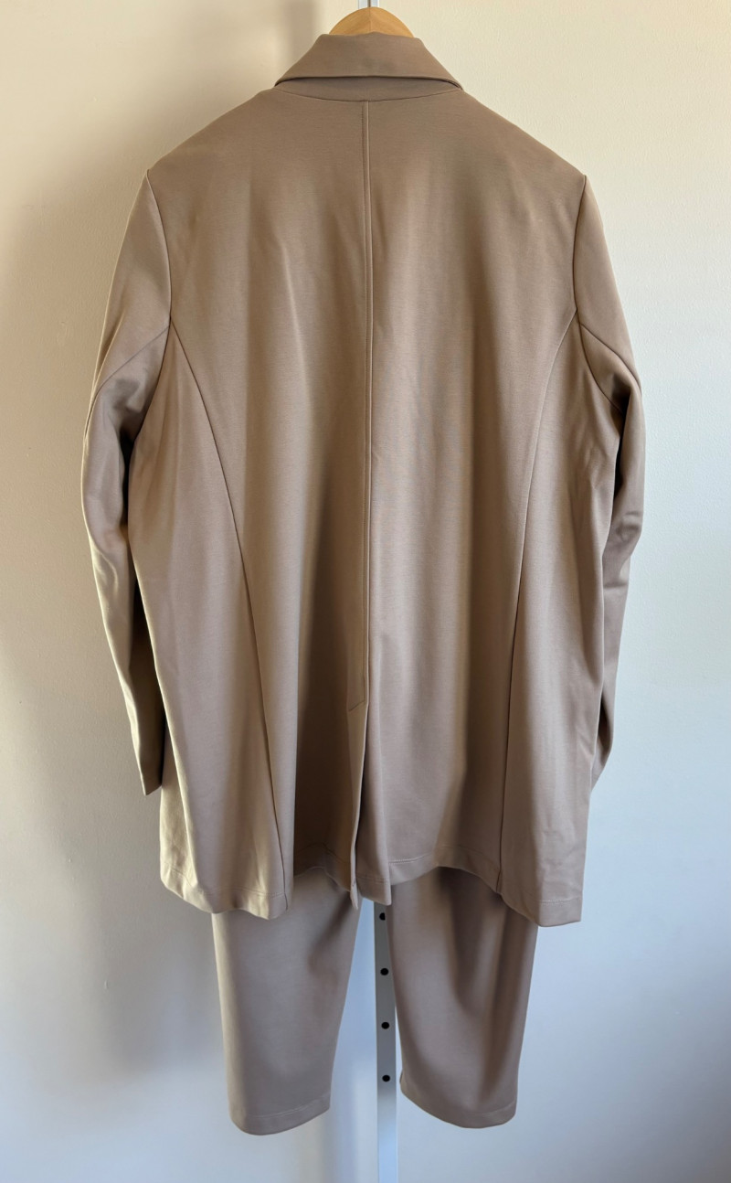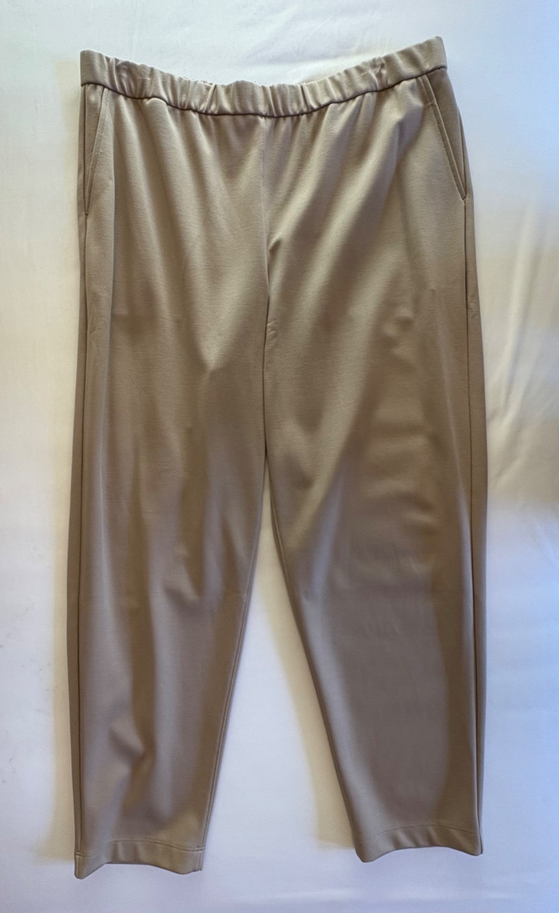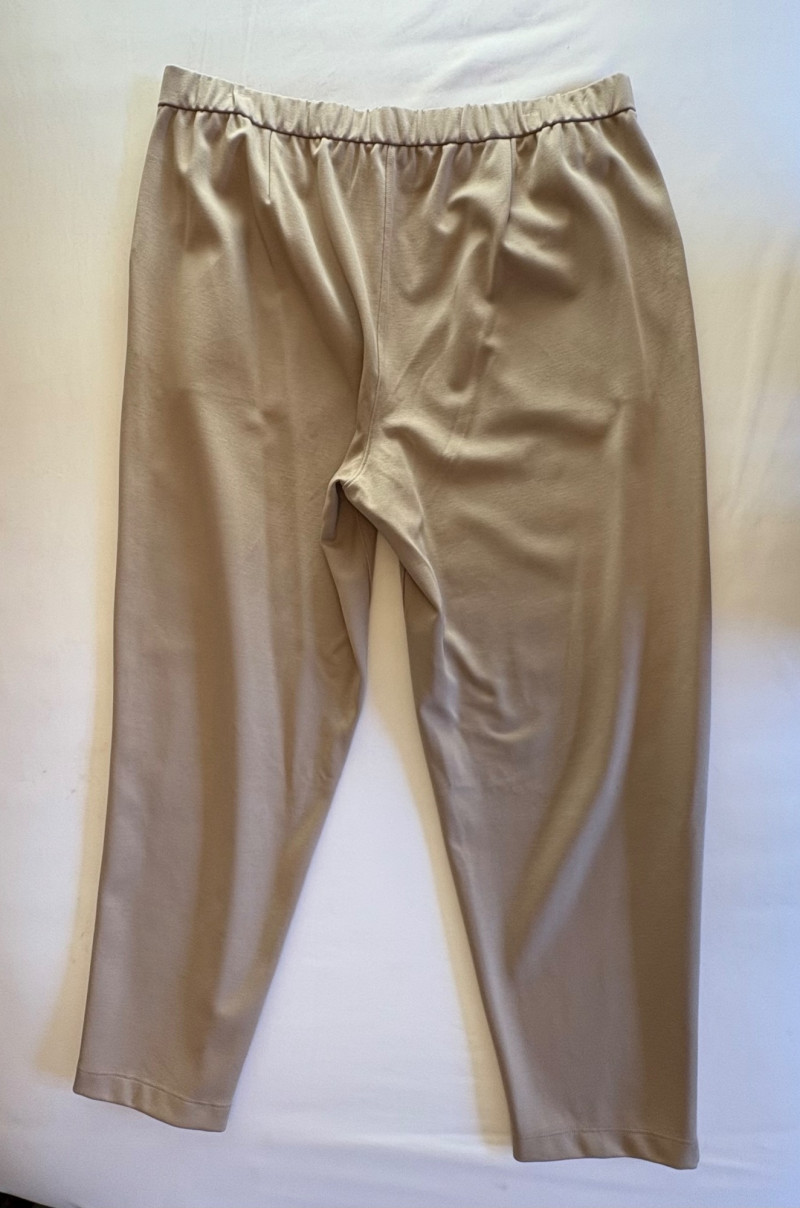 Gorgeous neutral travel suit out of Tencel ponte which doesn’t wrinkle, stretches, and travels extremely well. We believe the whole suit is new although the sales tag is missing from the pants. Thigh-length jacket has deep side front in-seam pockets, back vent, and classic notched collar. It does not fasten closed but falls nicely given the weight of the fabric. Facing is wider than normal extending to the arm scythe which helps the knit keep its shape better. New with tag. 71% Lyocell with 19% nylon and 10% spandex. Jacket measures 24" pit to pit and 31" from center back neck seam to back hemline. Size tag says XL. Matching pants are in the same heavy ponte material with set-in front pockets, flat elasticated waistband, darted rear waistband, and top-stitched inseam. Appear never to have been worn.* They measure 19" at waist side to side with 27" inseam. Size tag says XL. *Pants have been kept on a clip hanger & have imprint on waistband - see last photo - should come out with wash/steam.