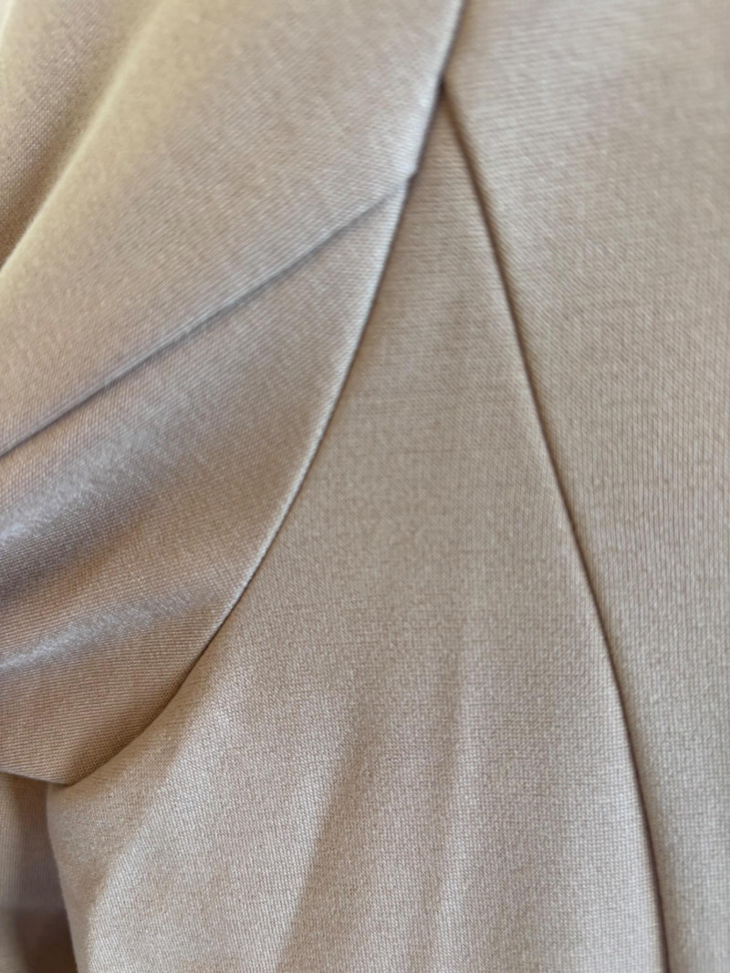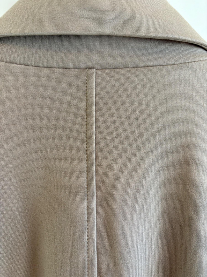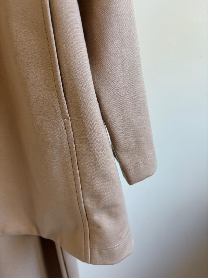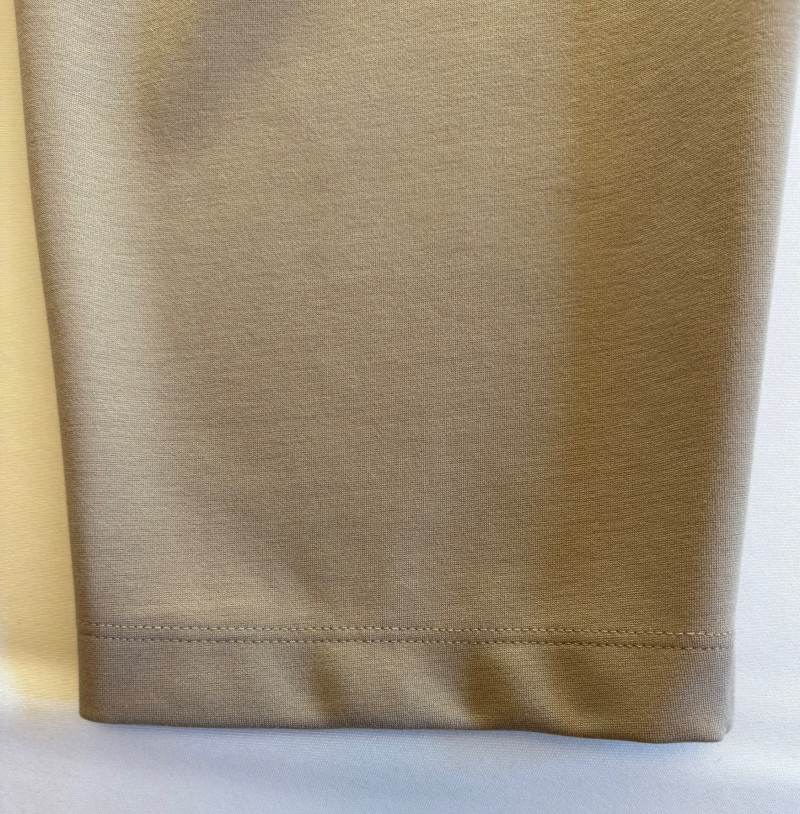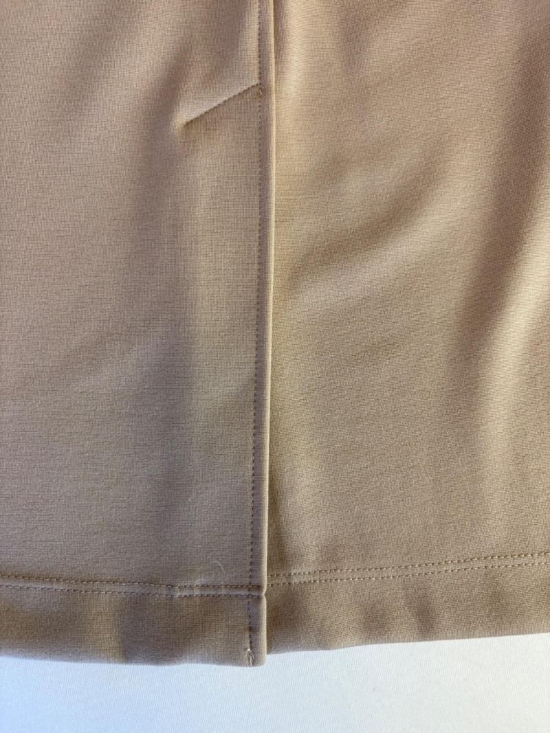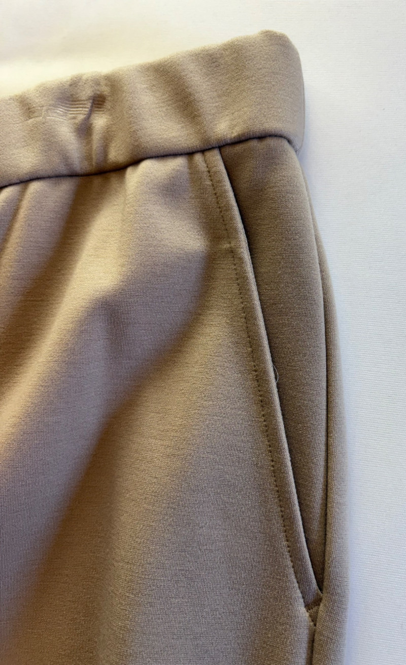 Gorgeous neutral travel suit out of Tencel ponte which doesn’t wrinkle, stretches, and travels extremely well. We believe the whole suit is new although the sales tag is missing from the pants. Thigh-length jacket has deep side front in-seam pockets, back vent, and classic notched collar. It does not fasten closed but falls nicely given the weight of the fabric. Facing is wider than normal extending to the arm scythe which helps the knit keep its shape better. New with tag. 71% Lyocell with 19% nylon and 10% spandex. Jacket measures 24" pit to pit and 31" from center back neck seam to back hemline. Size tag says XL. Matching pants are in the same heavy ponte material with set-in front pockets, flat elasticated waistband, darted rear waistband, and top-stitched inseam. Appear never to have been worn.* They measure 19" at waist side to side with 27" inseam. Size tag says XL. *Pants have been kept on a clip hanger & have imprint on waistband - see last photo - should come out with wash/steam.