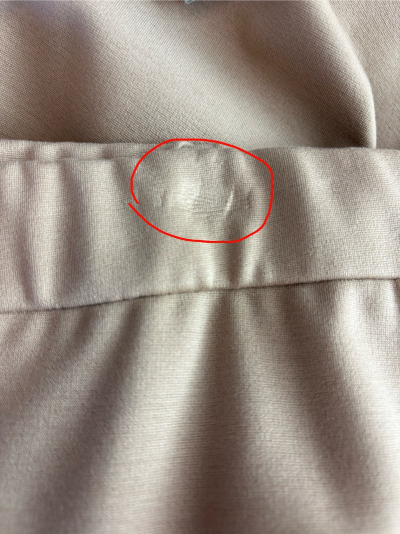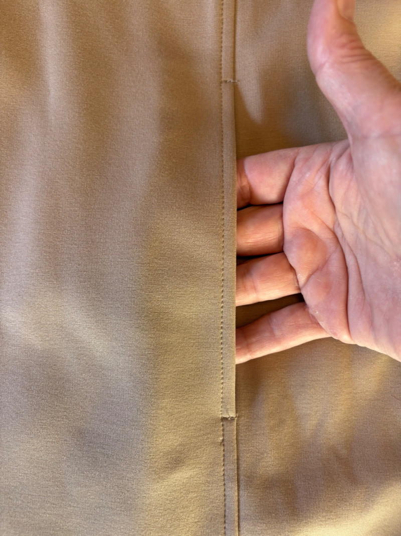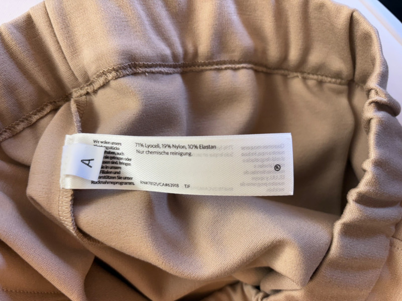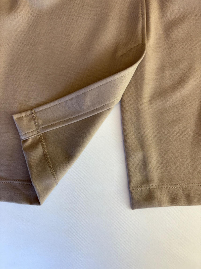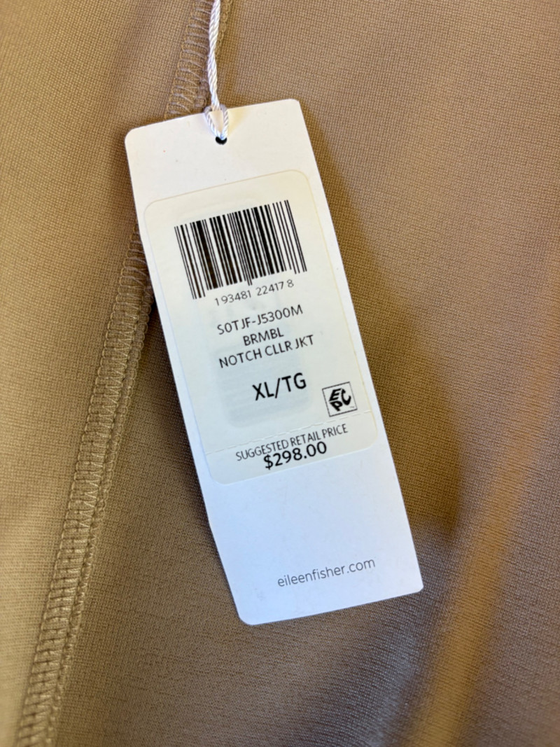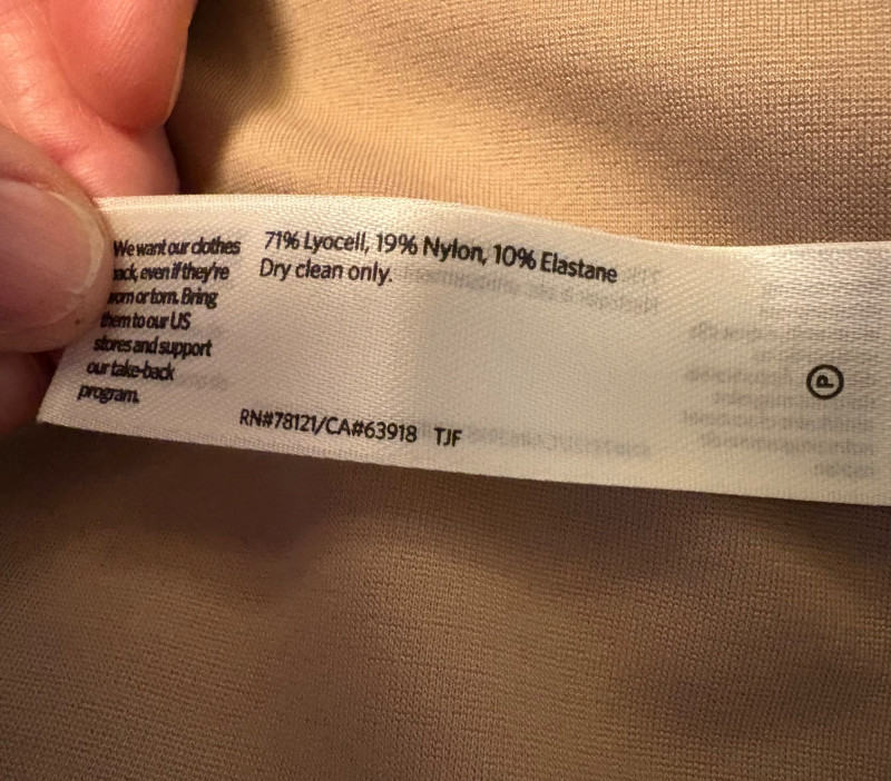 Gorgeous neutral travel suit out of Tencel ponte which doesn’t wrinkle, stretches, and travels extremely well. We believe the whole suit is new although the sales tag is missing from the pants. Thigh-length jacket has deep side front in-seam pockets, back vent, and classic notched collar. It does not fasten closed but falls nicely given the weight of the fabric. Facing is wider than normal extending to the arm scythe which helps the knit keep its shape better. New with tag. 71% Lyocell with 19% nylon and 10% spandex. Jacket measures 24" pit to pit and 31" from center back neck seam to back hemline. Size tag says XL. Matching pants are in the same heavy ponte material with set-in front pockets, flat elasticated waistband, darted rear waistband, and top-stitched inseam. Appear never to have been worn.* They measure 19" at waist side to side with 27" inseam. Size tag says XL. *Pants have been kept on a clip hanger & have imprint on waistband - see last photo - should come out with wash/steam.