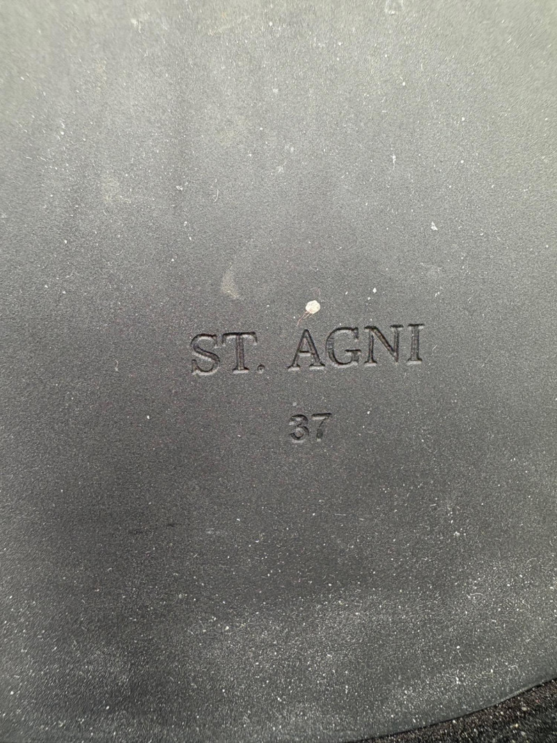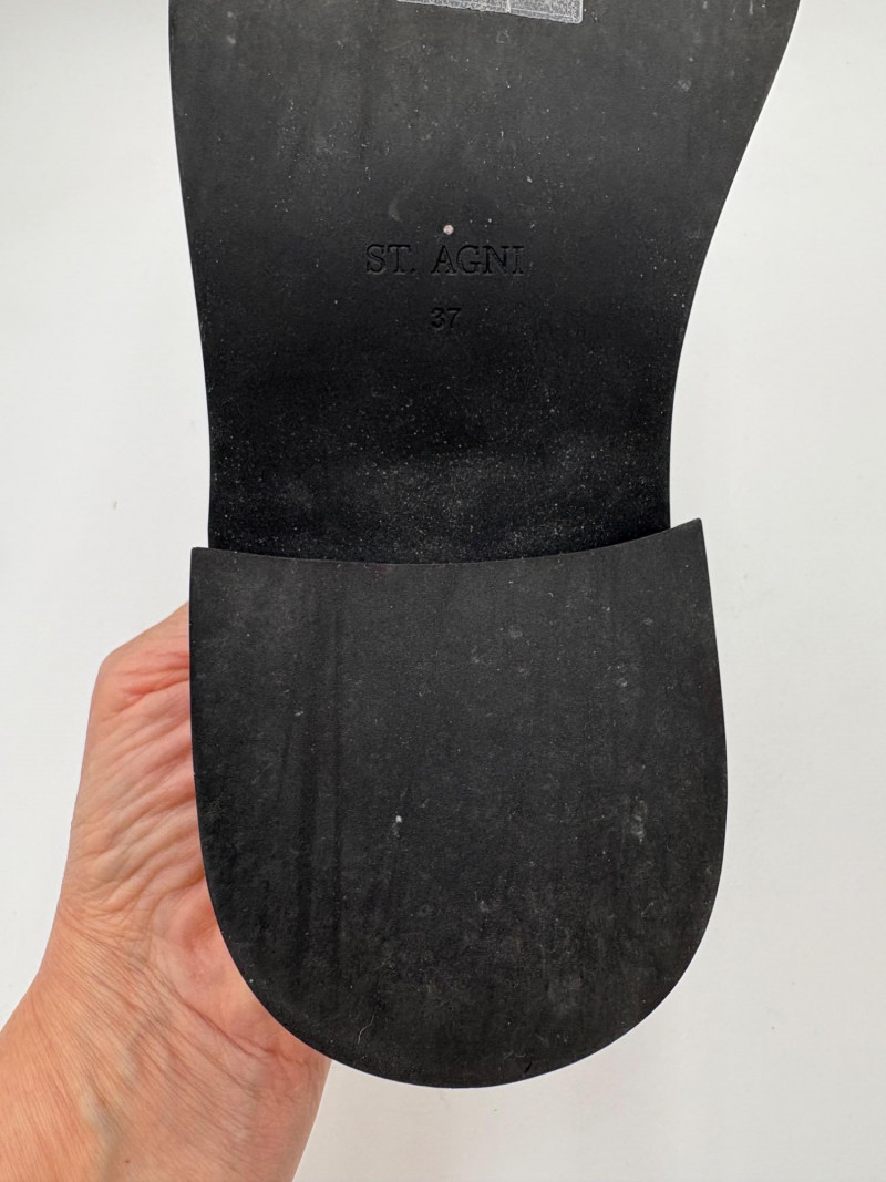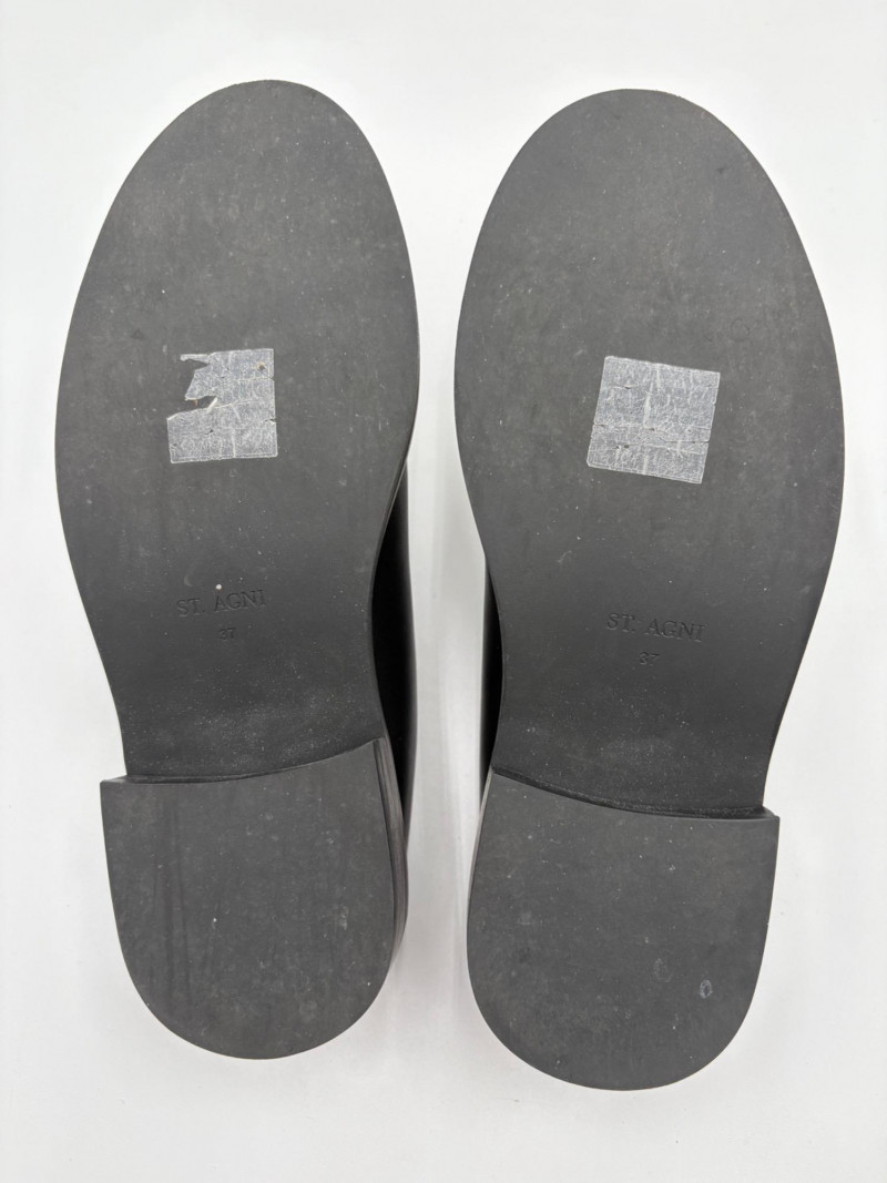 Hefty black slides from Australian company Saint Agni. Smooth black leather uppers with thick black sole and black stacked low heel. Non-slip rubber bottom sole. In excellent condition - appear virtually unused on the uppers. Size 37 European (approximately 7 to 7.5 American)