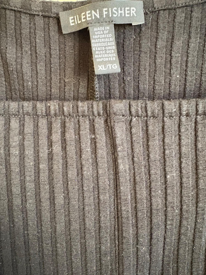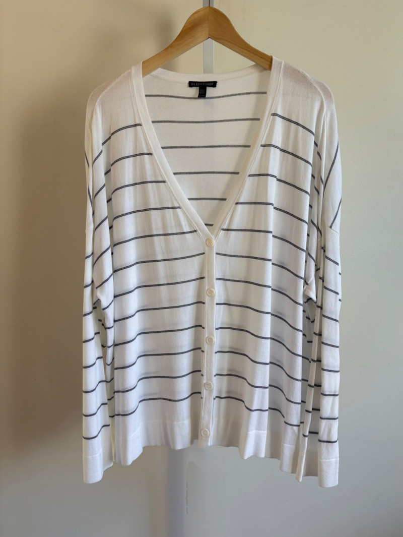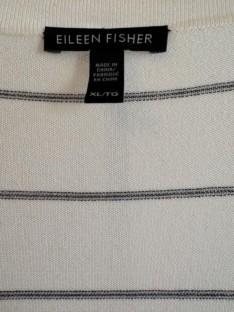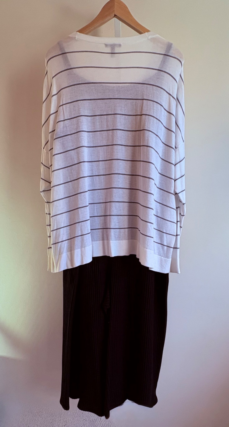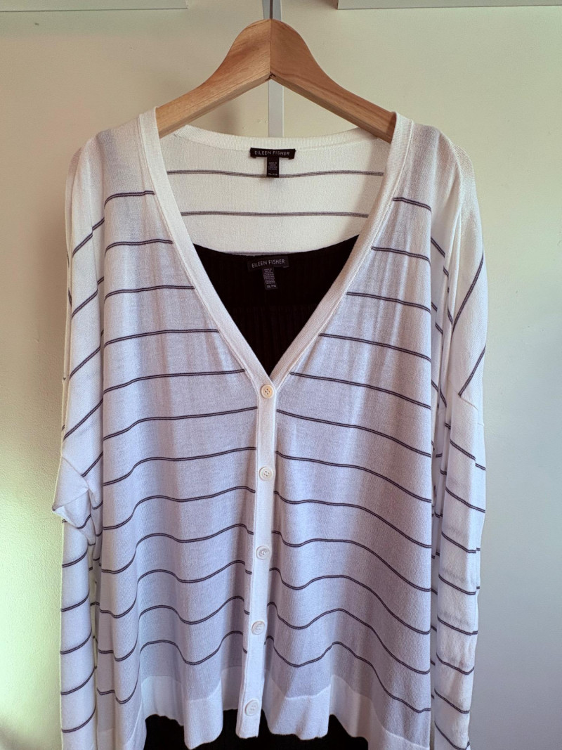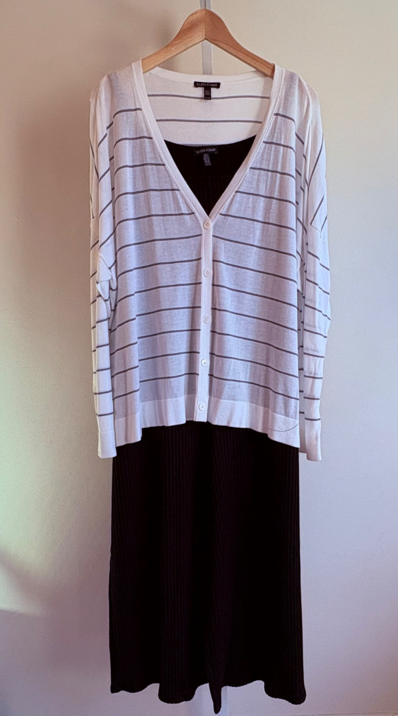 Great duo for a summer or spring night out from Eileen Fisher. Black knit jumpsuit in smooth rib pattern. High squared front panel with slender straps over the shoulders, straight-cut line, and cropped legs. The knit is heavy but not thick; it hangs beautifully. 90% Tencel with 10% spandex. In excellent condition. Measures 21.5" pit to pit and 33" from top of shoulder straps to crotch. 33" inseam. Size tag says XL. Soft white cardigan has narrow black horizontal pinstripes, button front closure, and fine ribbed neckline, cuffs, and hemline with a split hem. In excellent condition. 84% Tencel with 16% nylon. Measures 28" pit to pit and 26.5" from back neckline to bottom back hemline. Size tax says XL.