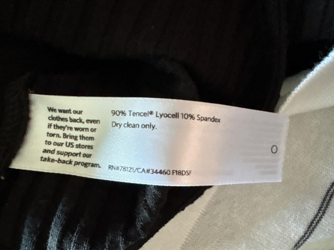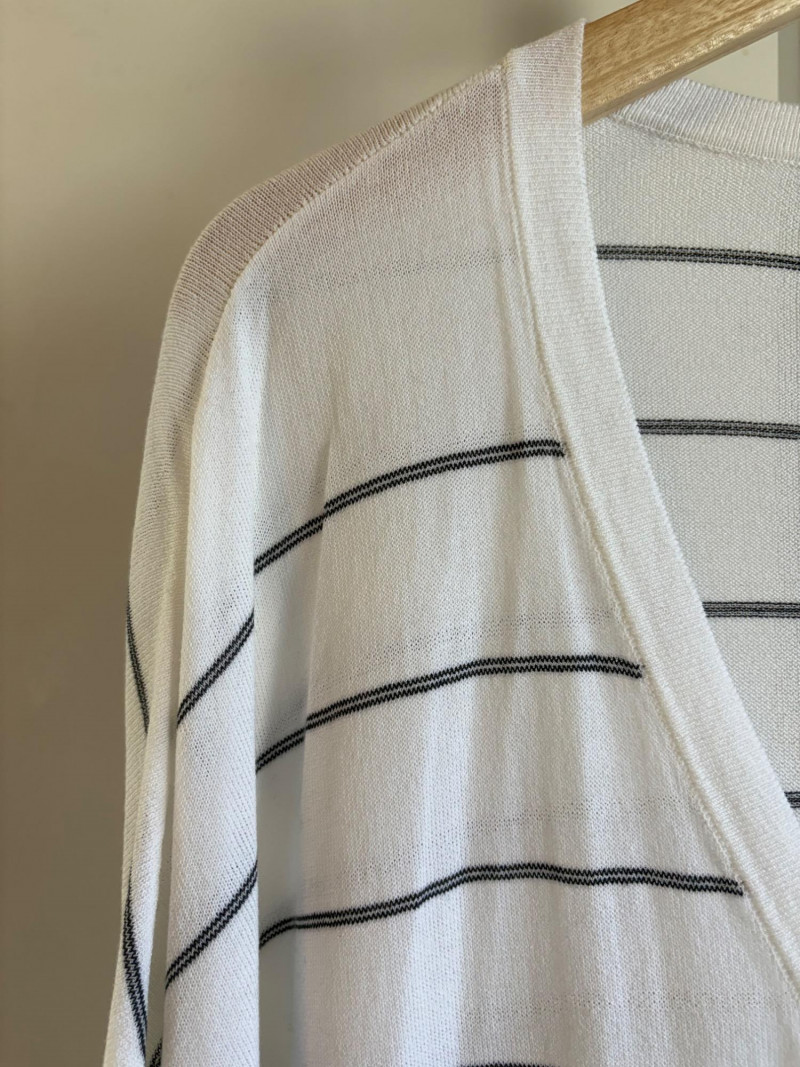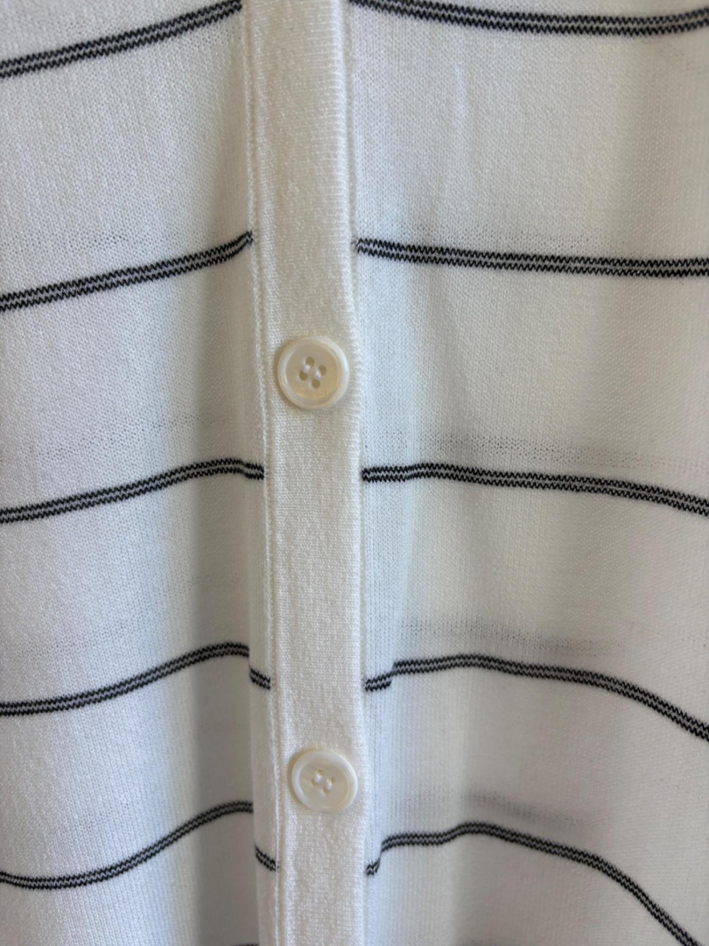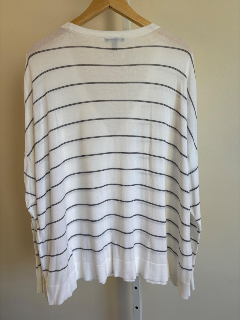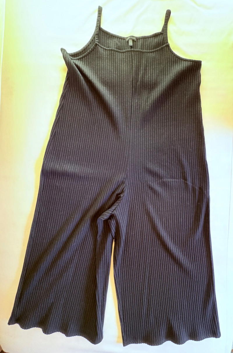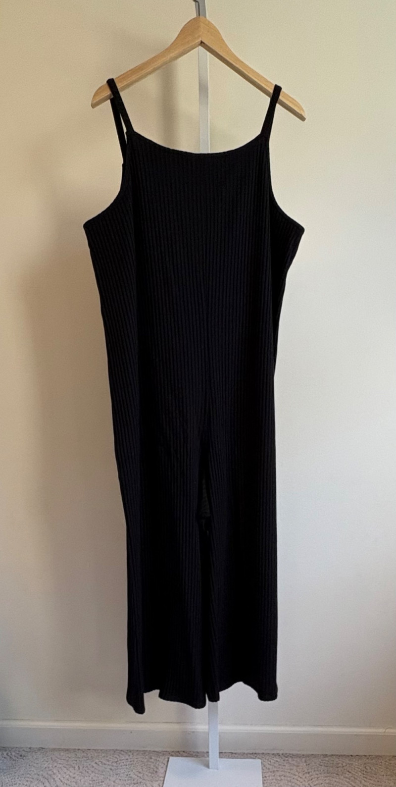 Great duo for a summer or spring night out from Eileen Fisher. Black knit jumpsuit in smooth rib pattern. High squared front panel with slender straps over the shoulders, straight-cut line, and cropped legs. The knit is heavy but not thick; it hangs beautifully. 90% Tencel with 10% spandex. In excellent condition. Measures 21.5" pit to pit and 33" from top of shoulder straps to crotch. 33" inseam. Size tag says XL. Soft white cardigan has narrow black horizontal pinstripes, button front closure, and fine ribbed neckline, cuffs, and hemline with a split hem. In excellent condition. 84% Tencel with 16% nylon. Measures 28" pit to pit and 26.5" from back neckline to bottom back hemline. Size tax says XL.