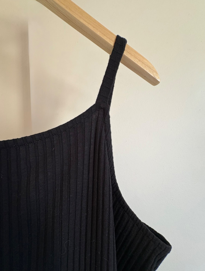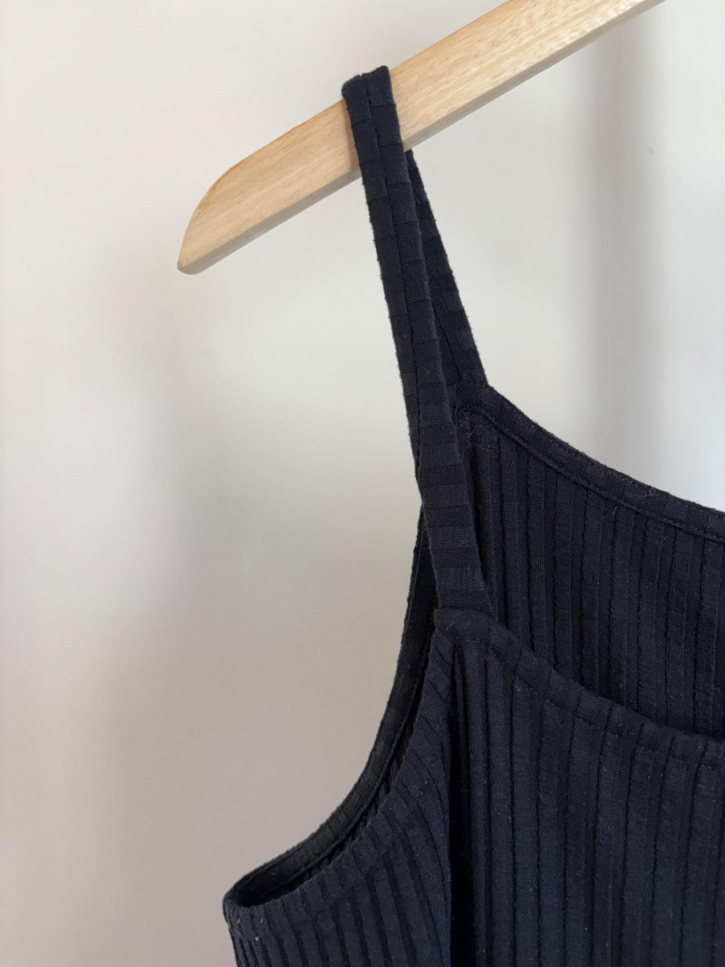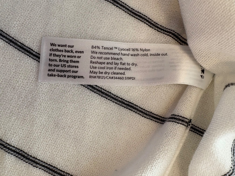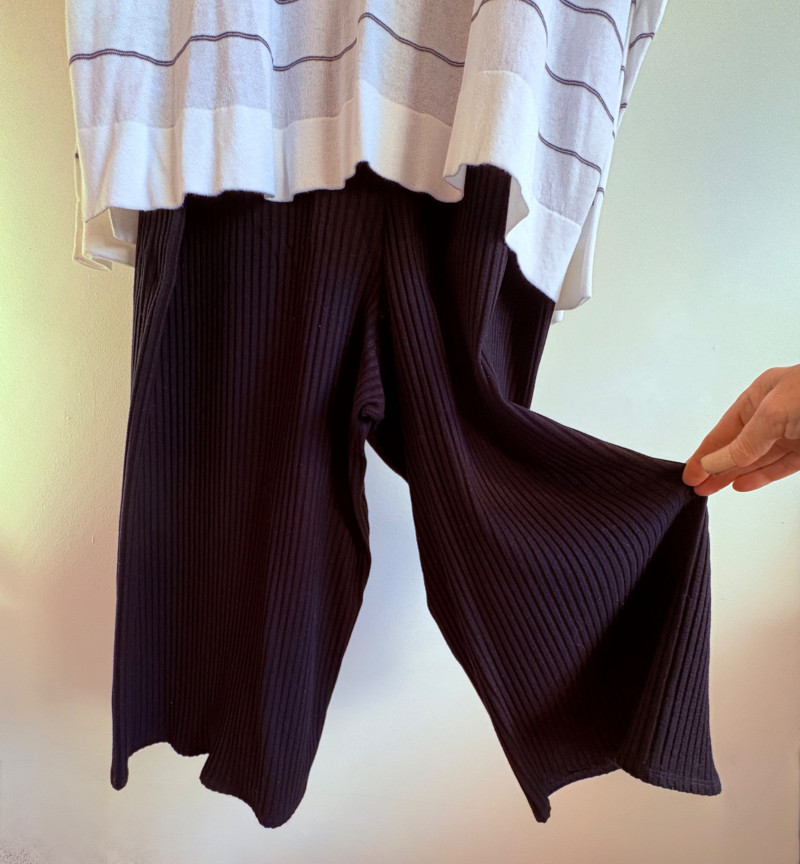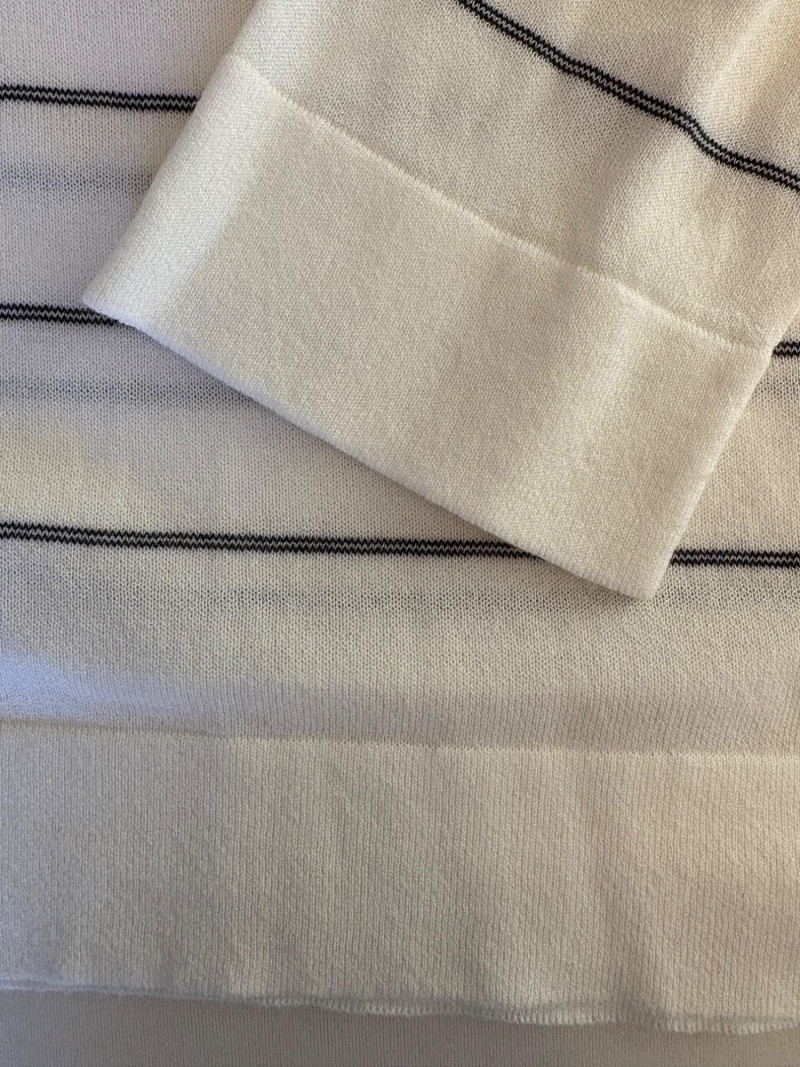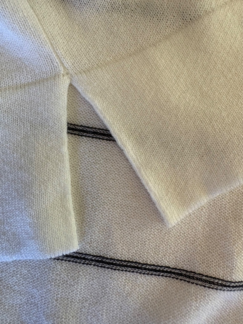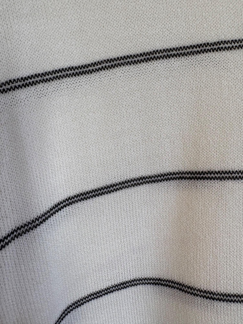 Great duo for a summer or spring night out from Eileen Fisher. Black knit jumpsuit in smooth rib pattern. High squared front panel with slender straps over the shoulders, straight-cut line, and cropped legs. The knit is heavy but not thick; it hangs beautifully. 90% Tencel with 10% spandex. In excellent condition. Measures 21.5" pit to pit and 33" from top of shoulder straps to crotch. 33" inseam. Size tag says XL. Soft white cardigan has narrow black horizontal pinstripes, button front closure, and fine ribbed neckline, cuffs, and hemline with a split hem. In excellent condition. 84% Tencel with 16% nylon. Measures 28" pit to pit and 26.5" from back neckline to bottom back hemline. Size tax says XL.