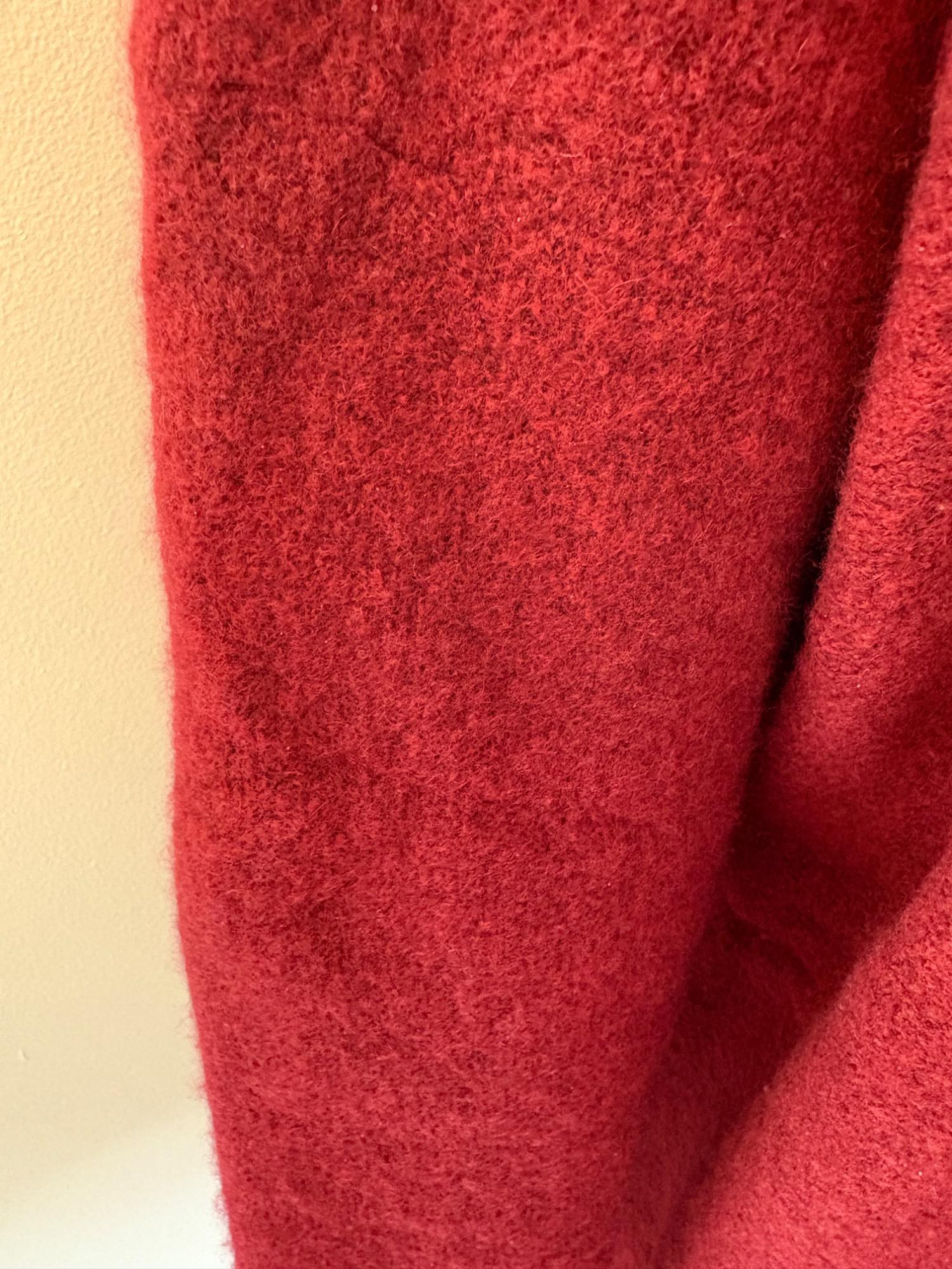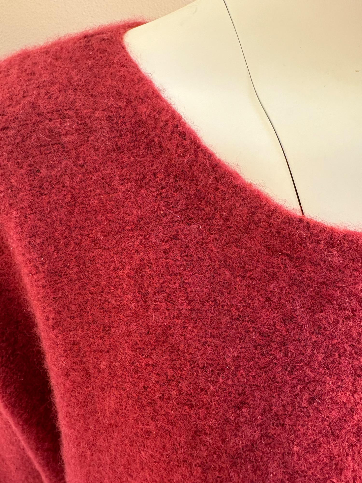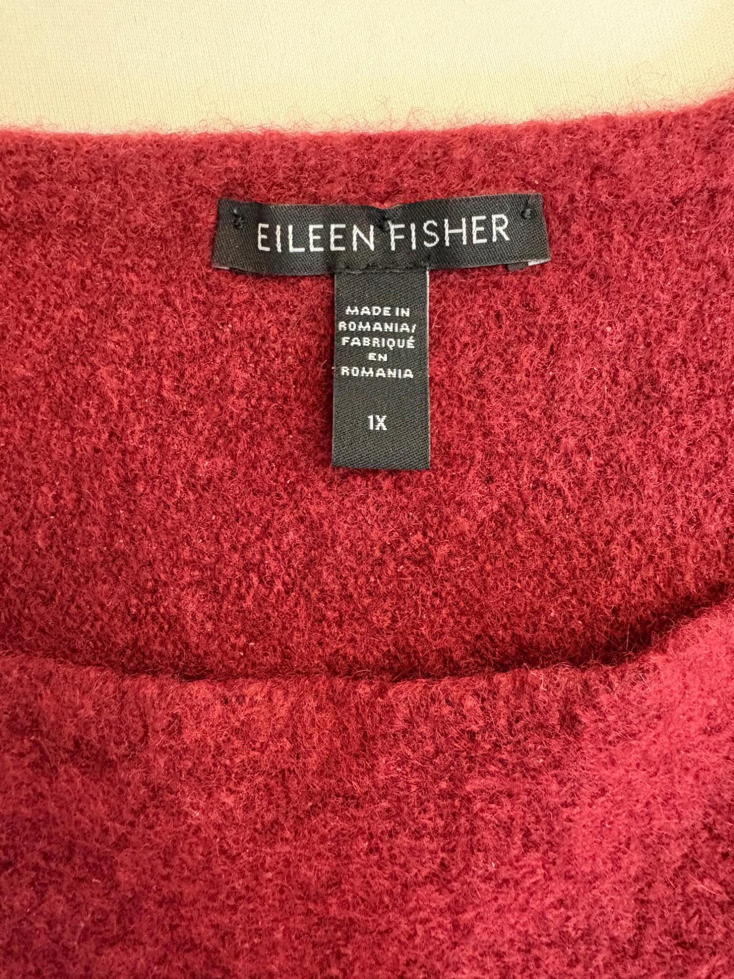 Heavyweight red cashmere sweater from Eileen Fisher has crewneck, dropped shoulder seams, and straight-cut body. In excellent condition. 72% cashmere, 17% silk, 10% nylon, and 1% elastane. (Blending silk with with cashmere reduces cashmere’s tendency stretch out of shape without affecting its soft hand or significantly reducing its insulating properties.) Measures 27" pit to pit and 25" from center back neck seam to back hemline. Size tag says 1X.