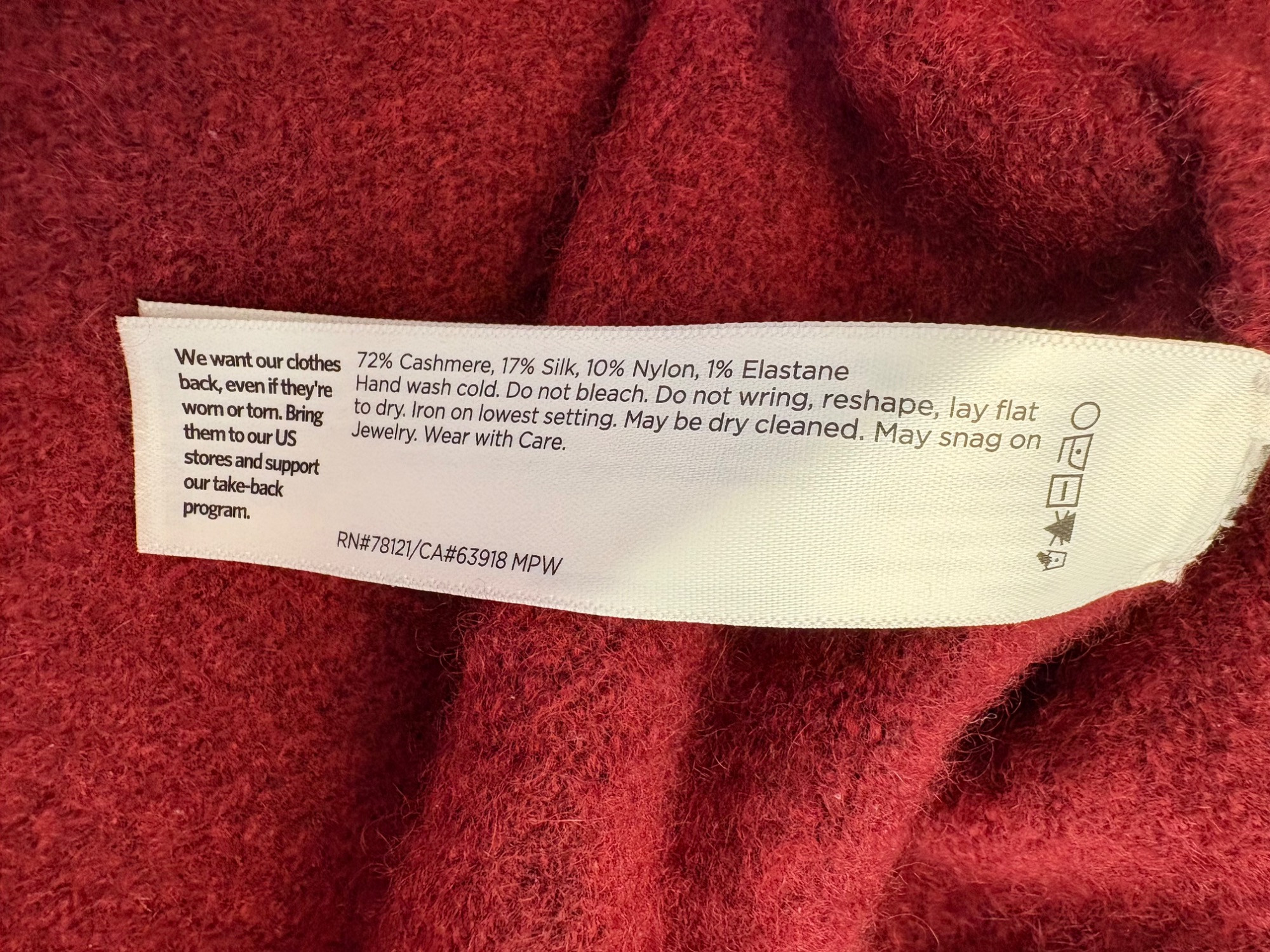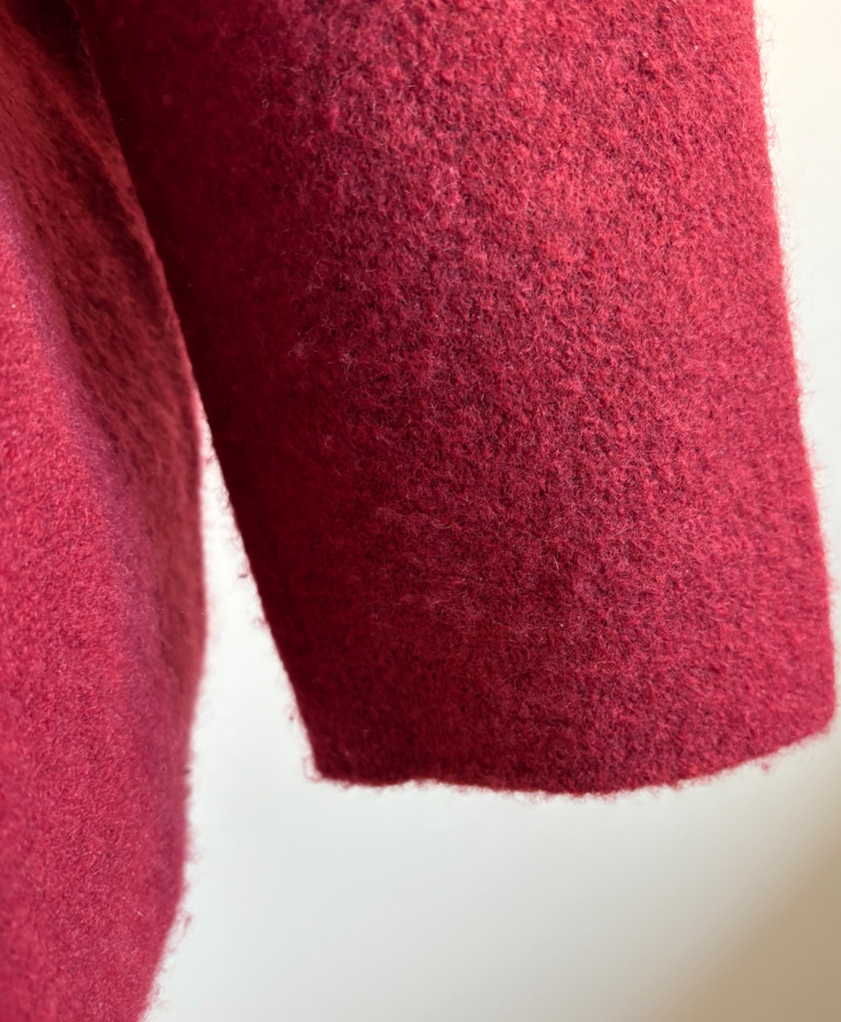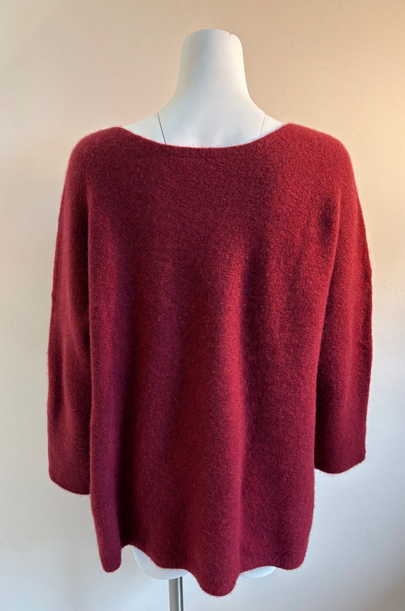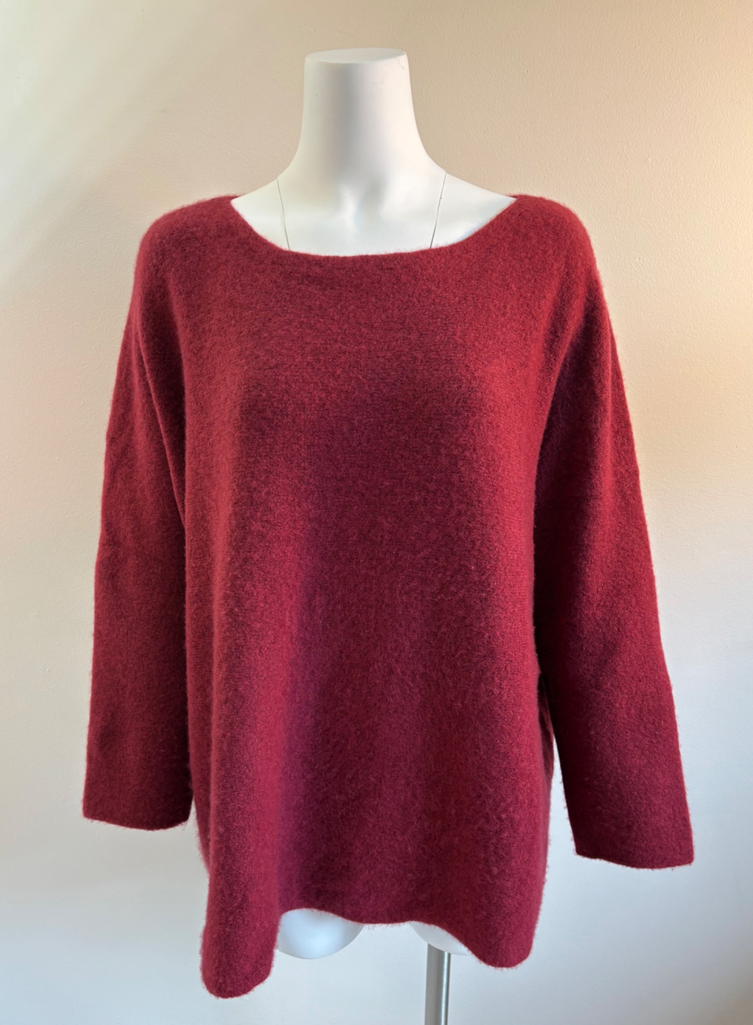 Heavyweight red cashmere sweater from Eileen Fisher has crewneck, dropped shoulder seams, and straight-cut body. In excellent condition. 72% cashmere, 17% silk, 10% nylon, and 1% elastane. (Blending silk with with cashmere reduces cashmere’s tendency stretch out of shape without affecting its soft hand or significantly reducing its insulating properties.) Measures 27" pit to pit and 25" from center back neck seam to back hemline. Size tag says 1X.
