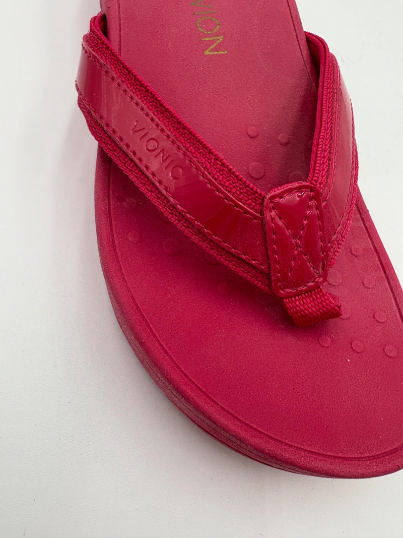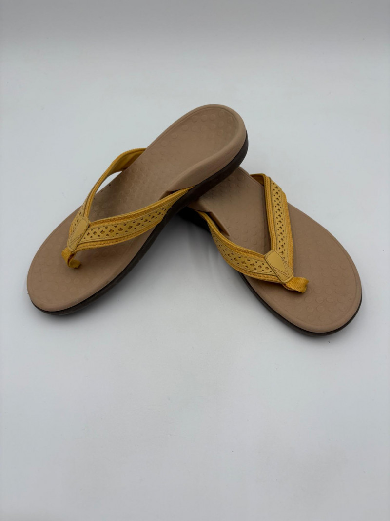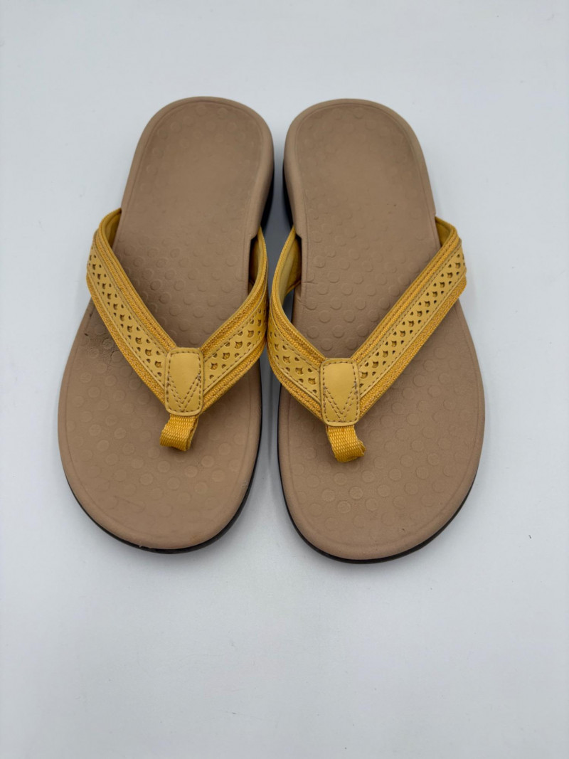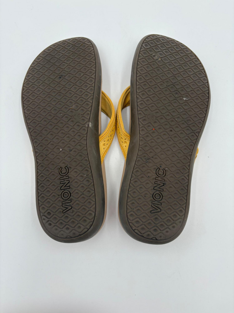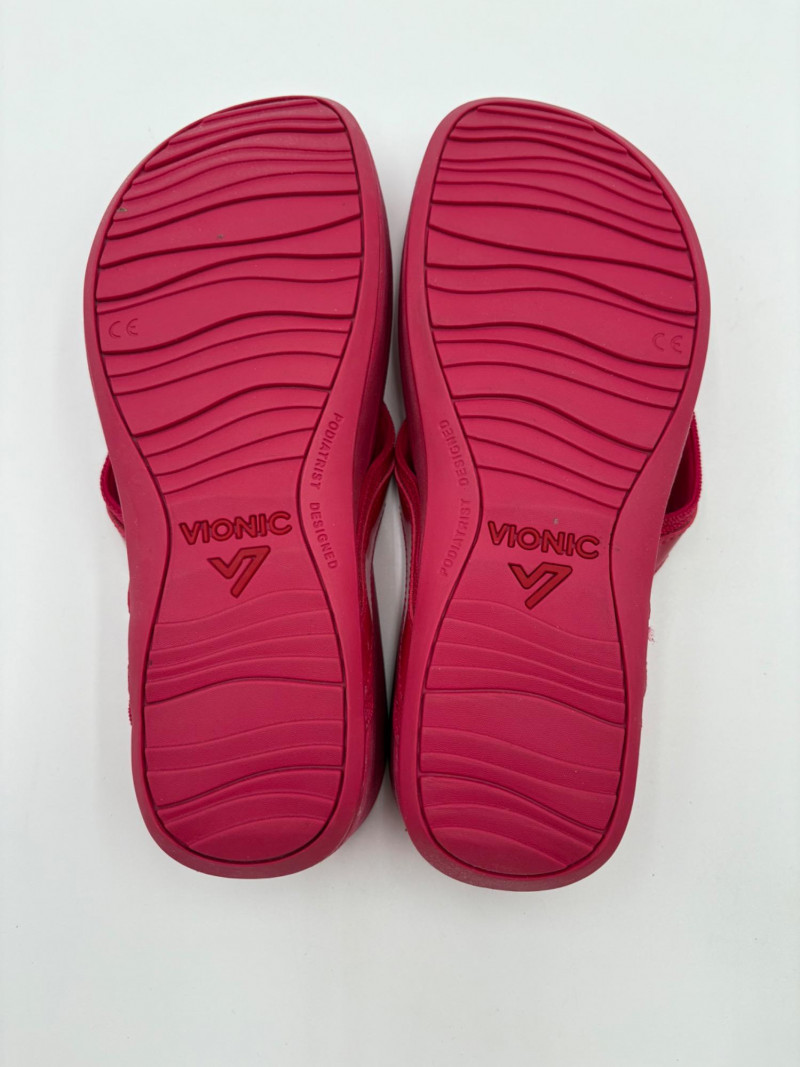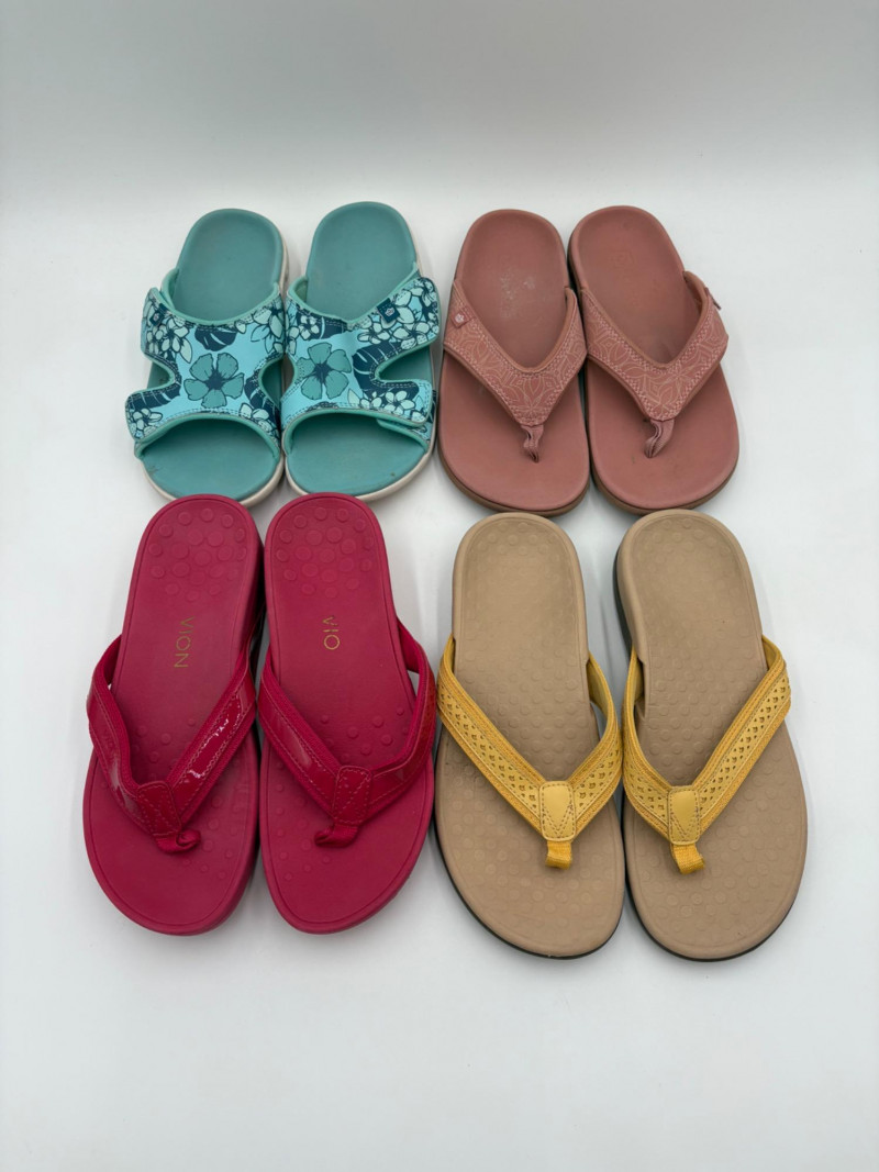 4 pairs of comfortable flip-flops ready for use at the pool, beach, or just around the house in warm weather. Fuchsia Vionic pair with 1" platform & 2" heel. In very good used condition. Size 7. Pale pink Spenco pair with with webbing straps topped with floral pattern. In good used condition. Size 7. Yellow Vionic pair with cutout patterning on webbing straps. In good used condition. Size 7. Blue floral Spenco pair has 2 Velcro closures on each shoe. In used condition. Size 7.