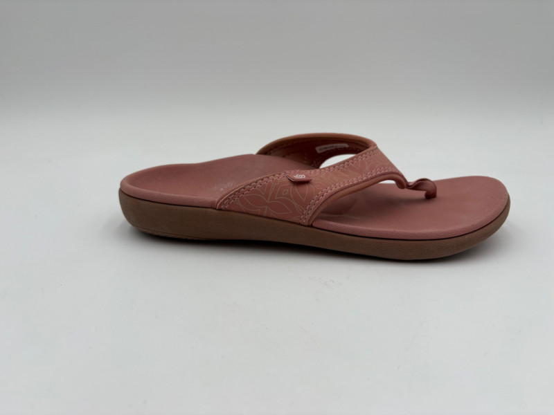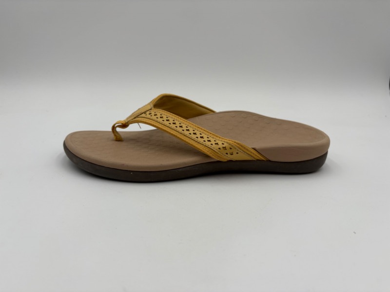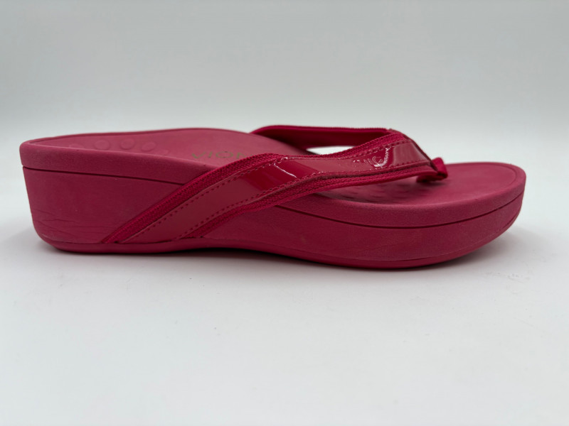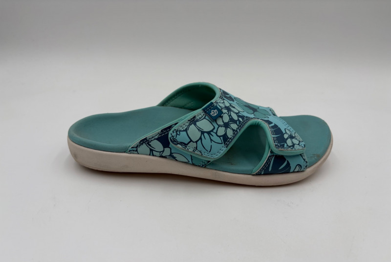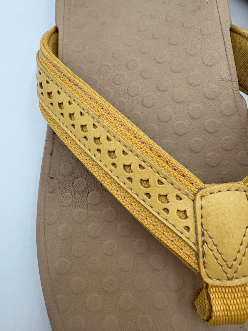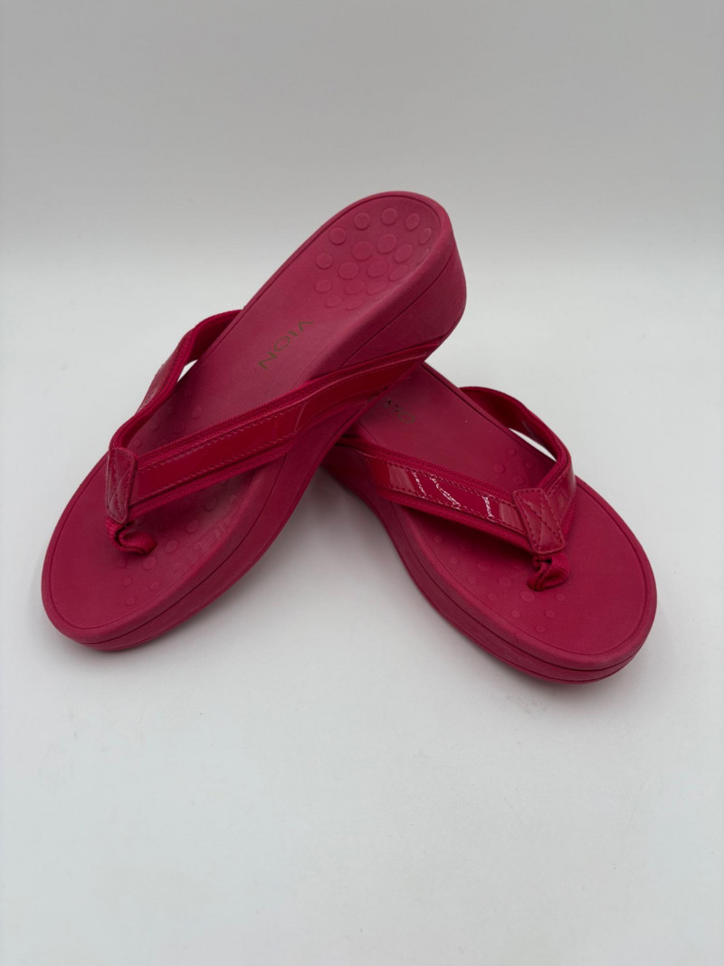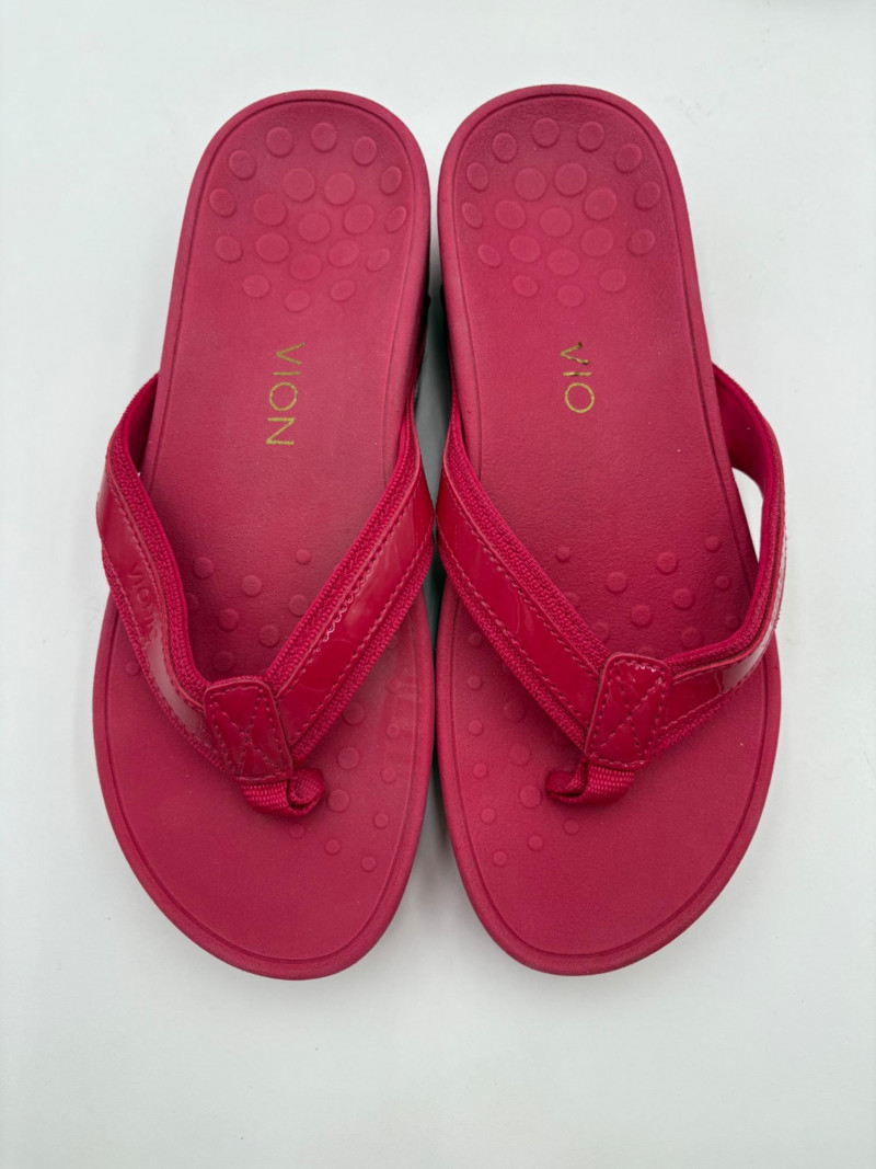 4 pairs of comfortable flip-flops ready for use at the pool, beach, or just around the house in warm weather. Fuchsia Vionic pair with 1" platform & 2" heel. In very good used condition. Size 7. Pale pink Spenco pair with with webbing straps topped with floral pattern. In good used condition. Size 7. Yellow Vionic pair with cutout patterning on webbing straps. In good used condition. Size 7. Blue floral Spenco pair has 2 Velcro closures on each shoe. In used condition. Size 7.