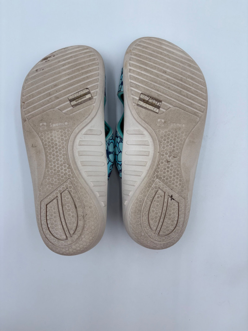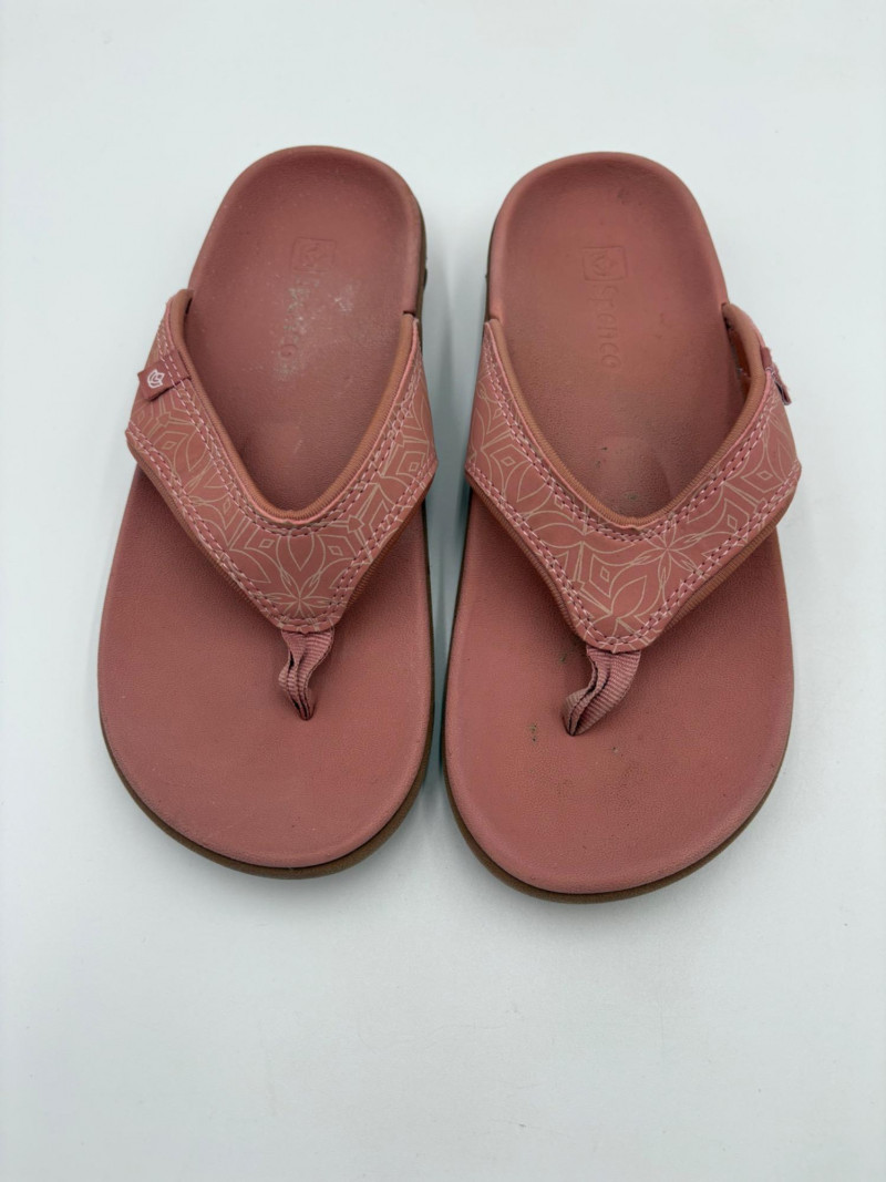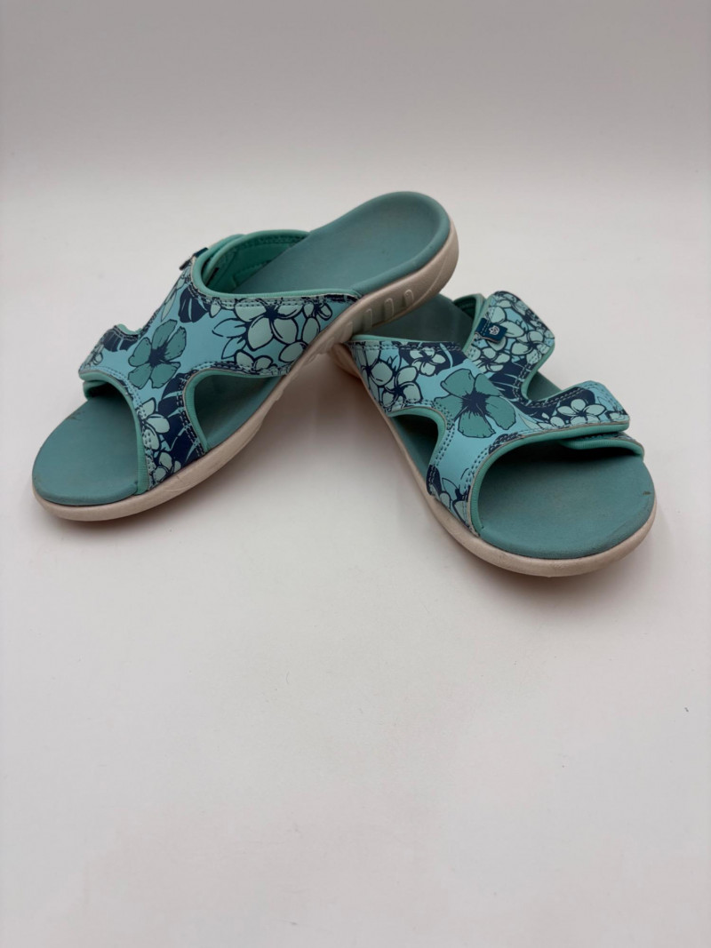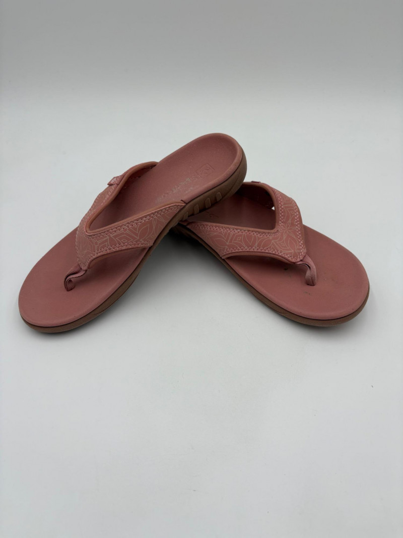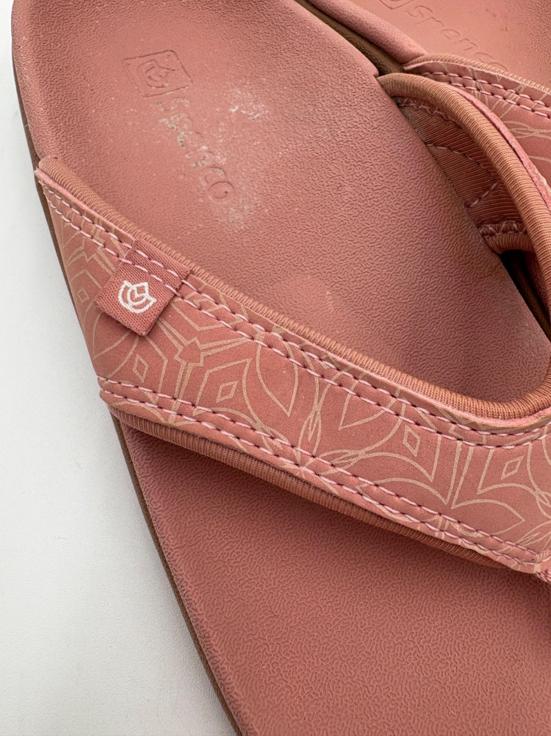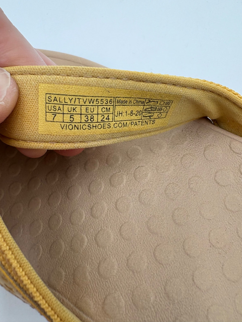 4 pairs of comfortable flip-flops ready for use at the pool, beach, or just around the house in warm weather. Fuchsia Vionic pair with 1" platform & 2" heel. In very good used condition. Size 7. Pale pink Spenco pair with with webbing straps topped with floral pattern. In good used condition. Size 7. Yellow Vionic pair with cutout patterning on webbing straps. In good used condition. Size 7. Blue floral Spenco pair has 2 Velcro closures on each shoe. In used condition. Size 7.