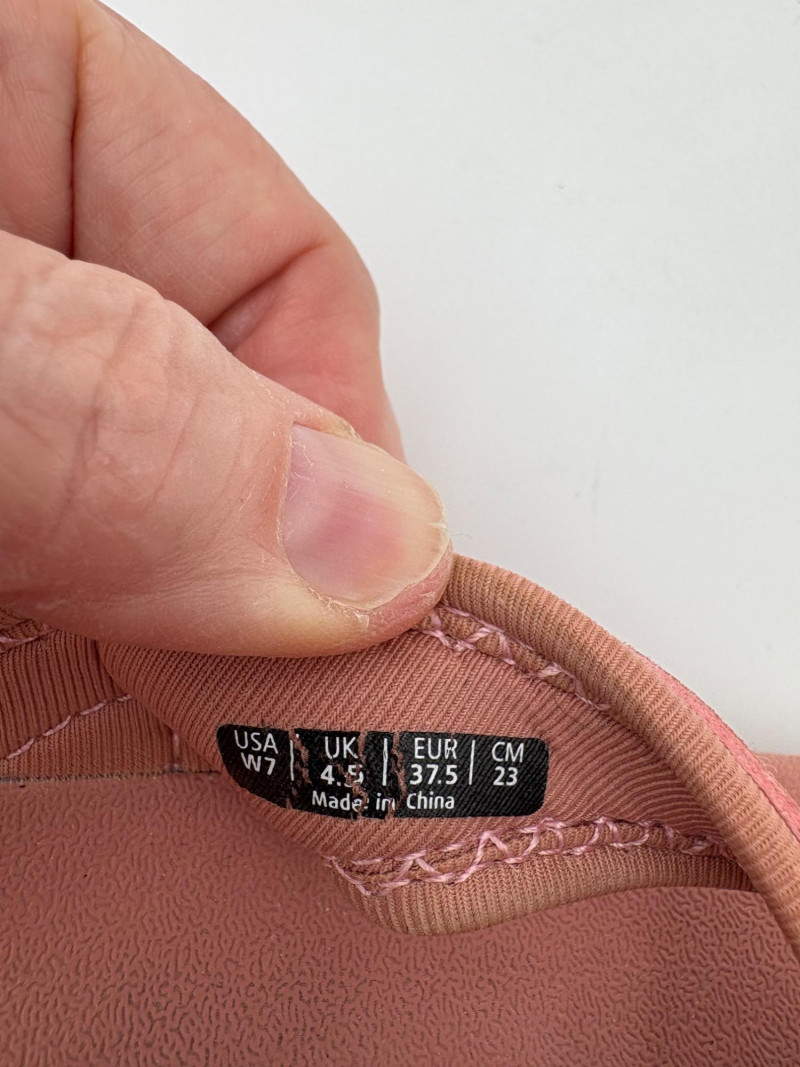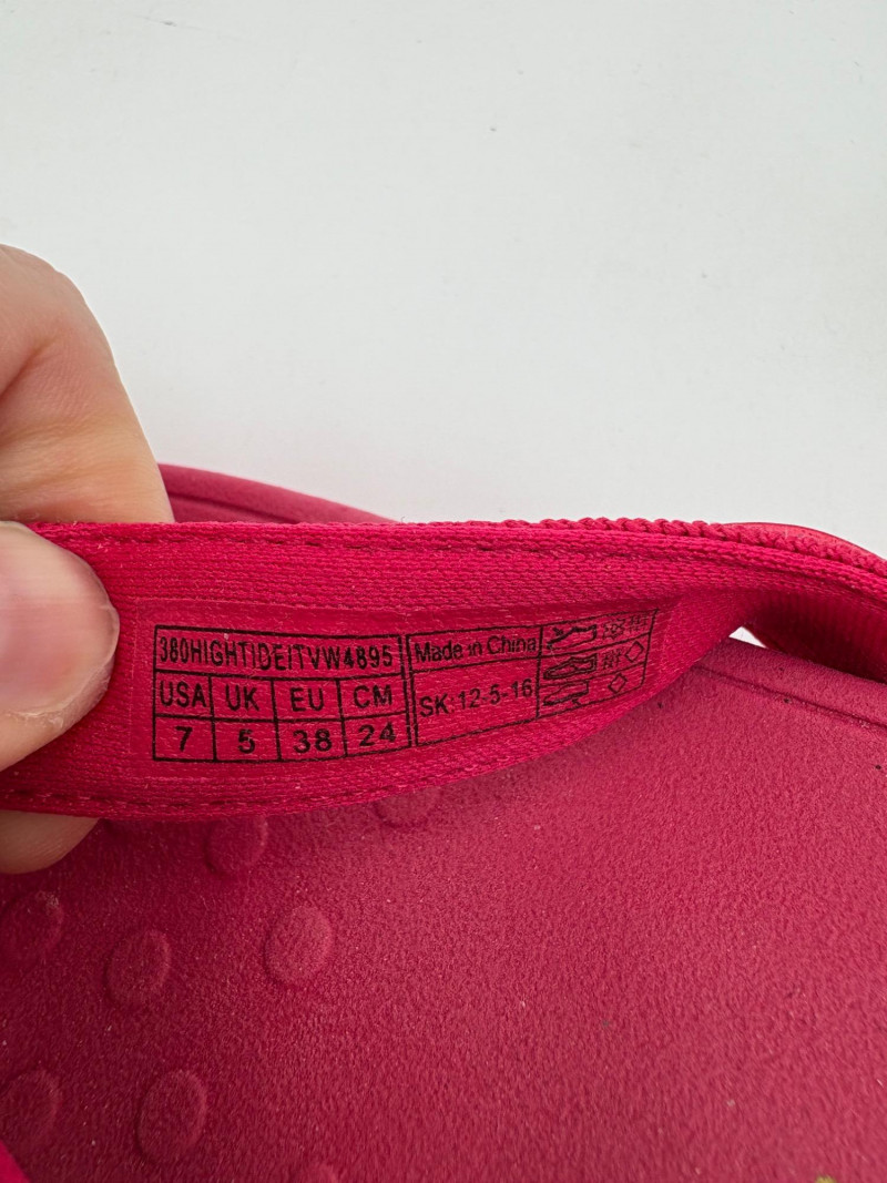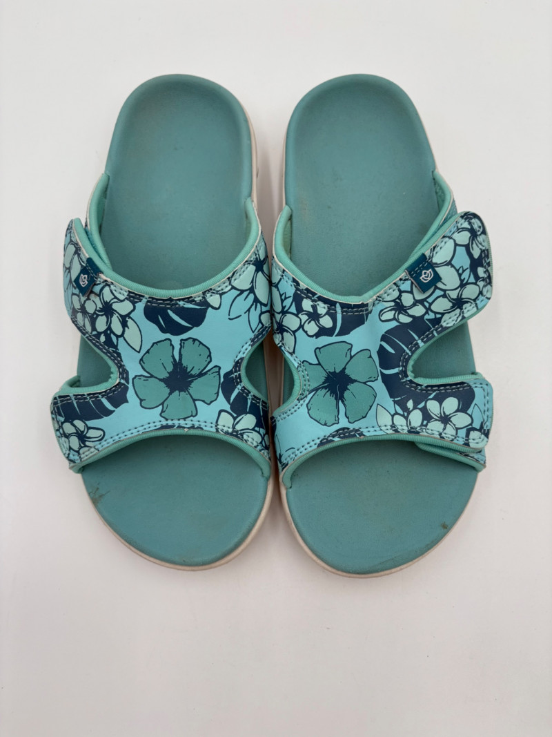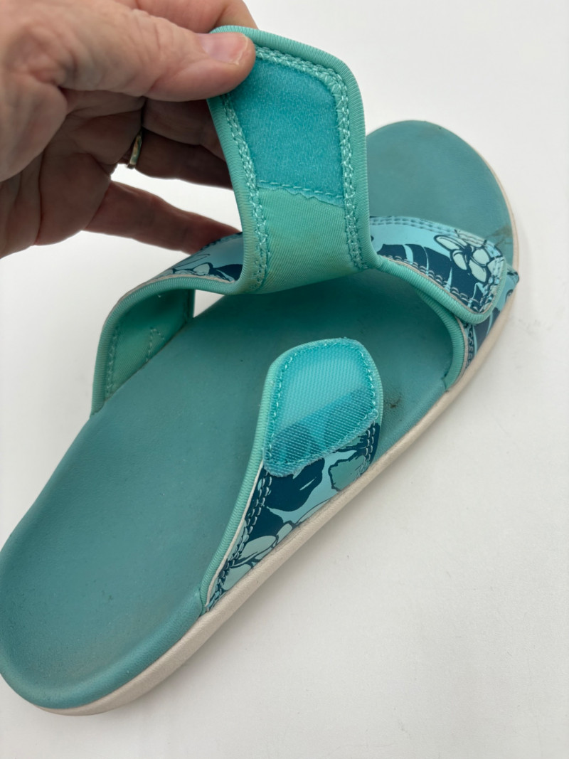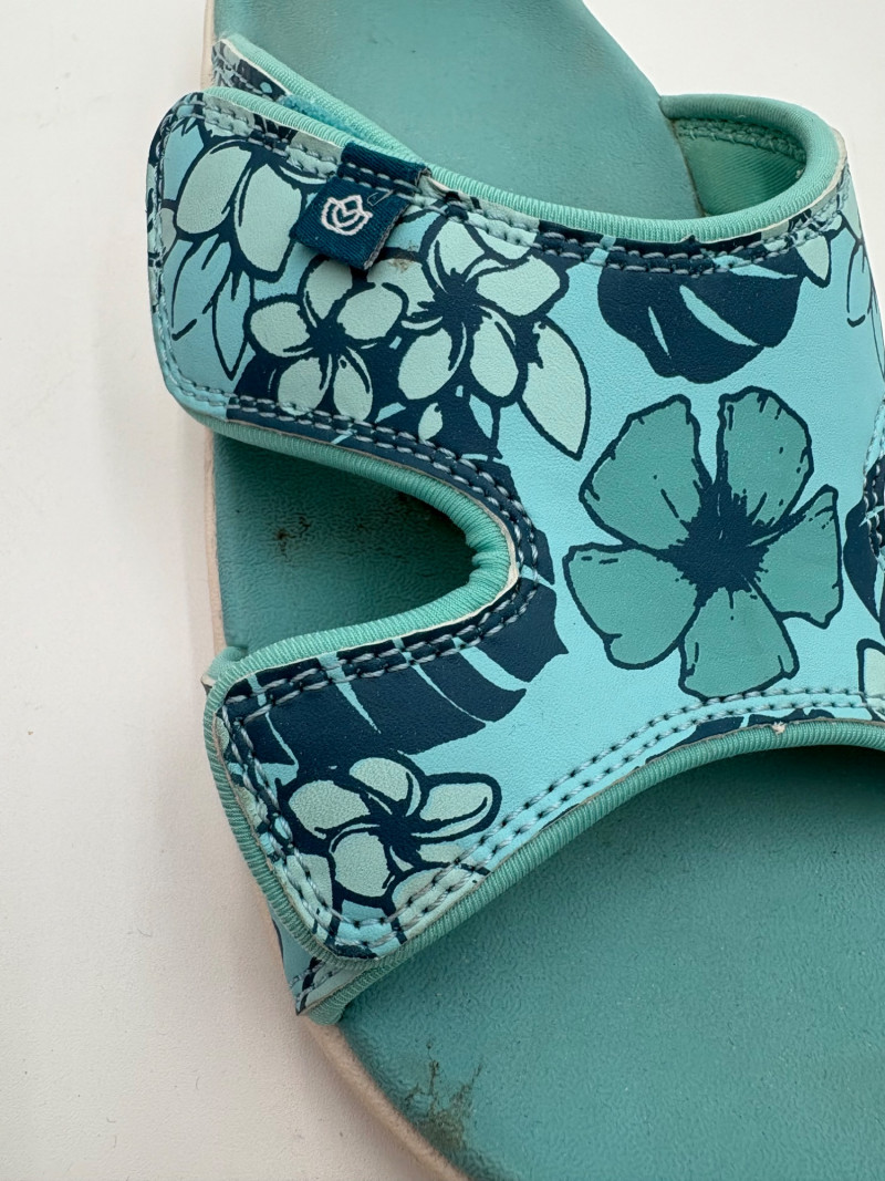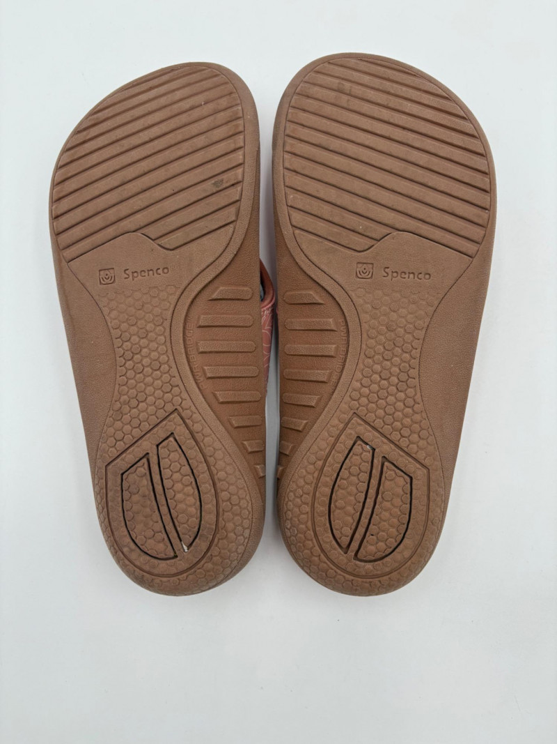 4 pairs of comfortable flip-flops ready for use at the pool, beach, or just around the house in warm weather. Fuchsia Vionic pair with 1" platform & 2" heel. In very good used condition. Size 7. Pale pink Spenco pair with with webbing straps topped with floral pattern. In good used condition. Size 7. Yellow Vionic pair with cutout patterning on webbing straps. In good used condition. Size 7. Blue floral Spenco pair has 2 Velcro closures on each shoe. In used condition. Size 7.