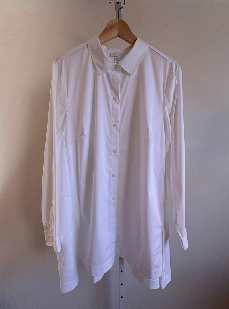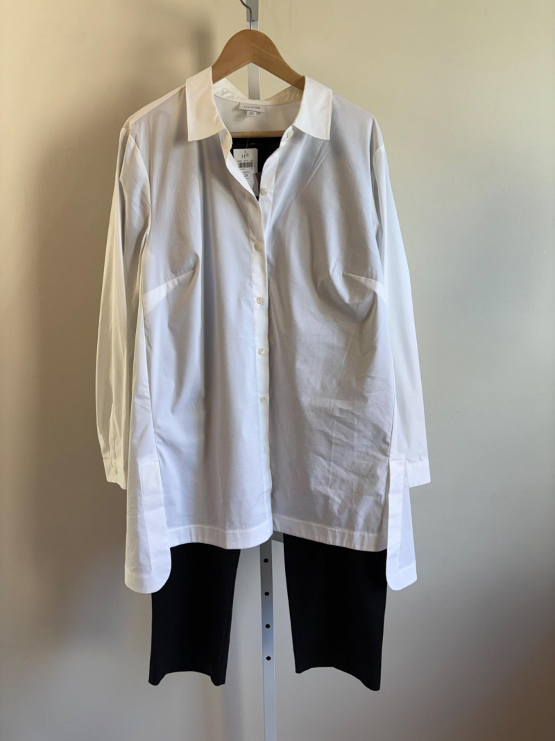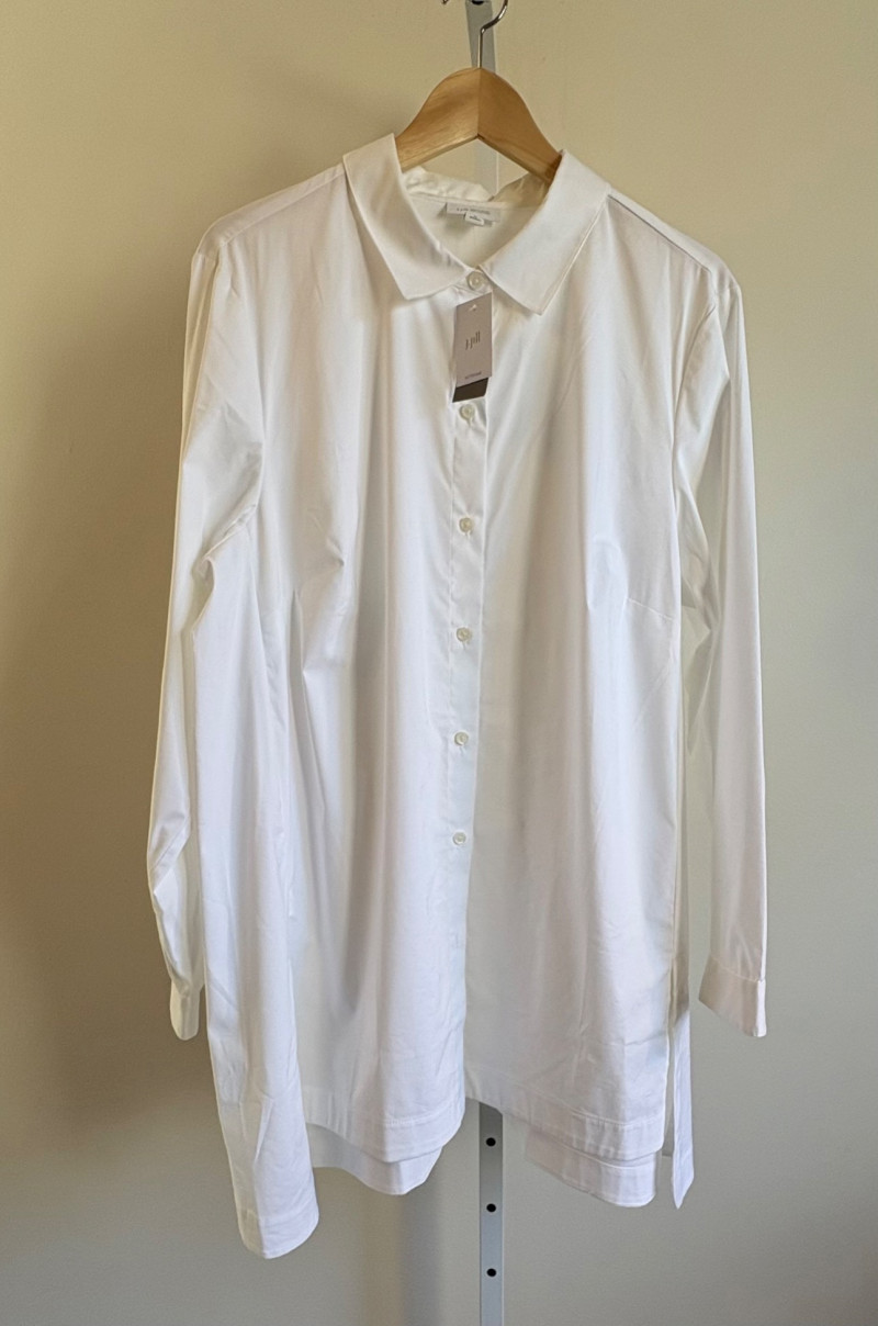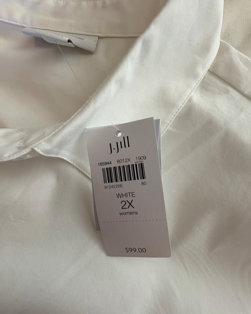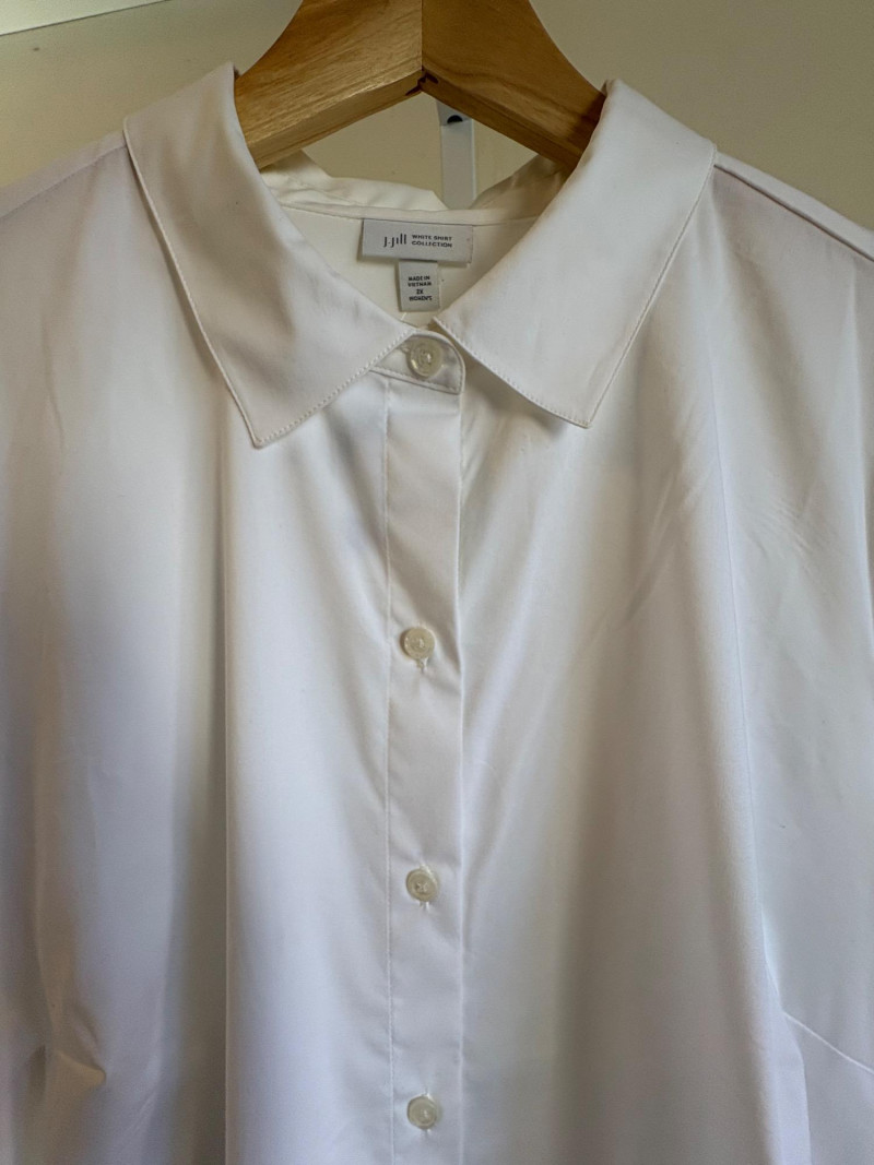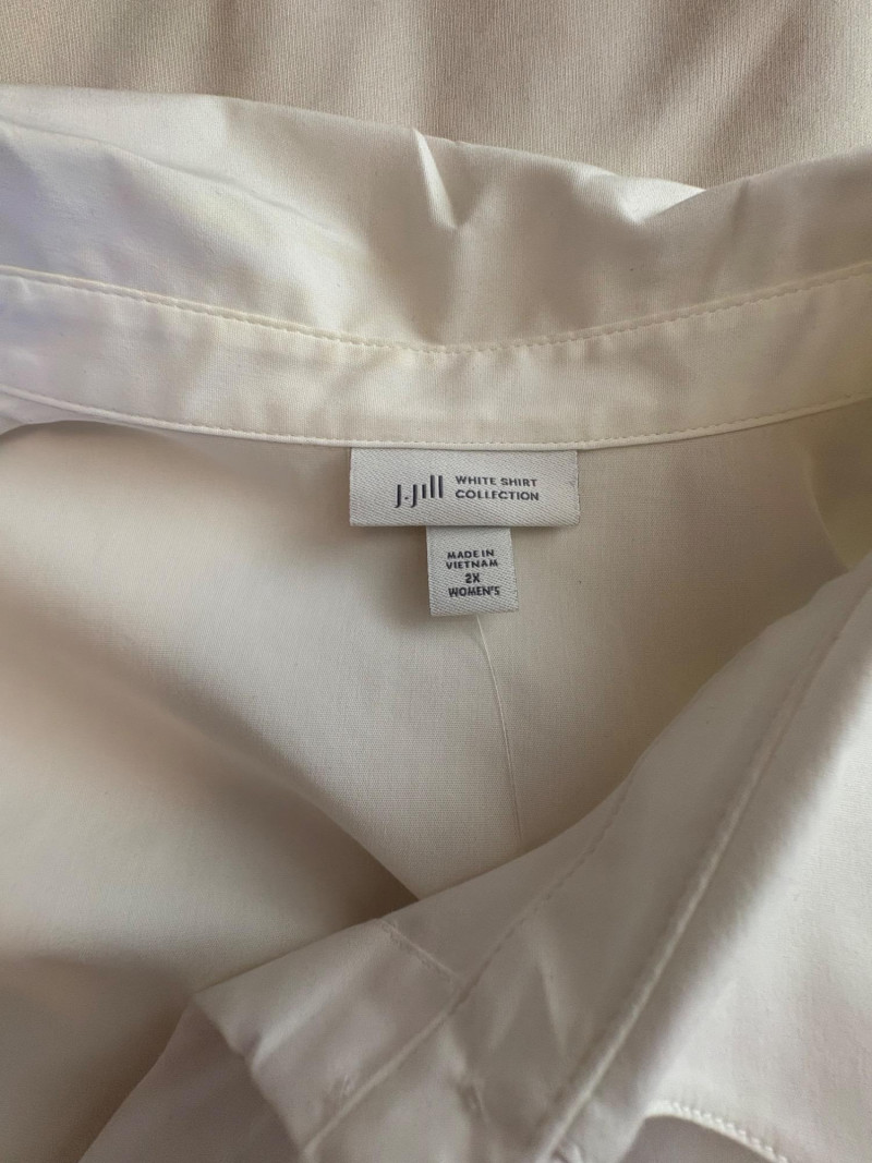 Basic pants & shirt set with subtle details from J. Jill. Both pieces are new with tag. Crisp pure white shirt from J. Jill's classic shirt collection. Shirt has front button closure, bust darts, pleated cuffs with placket and single button closure along with a finished split hem. Back hem is approx. 3" longer than front. 61% cotton with 31% polyester and 5% spandex. Measures 25.5" pit to pit and 31.5" from back neck seam to bottom of back hem. Size tag says 2X. Black pants have subtle stretch to them and a slim cut - perfect for under larger tops like this shirt or sweaters. Front zip fly closure with slides and inside button. Set-in side front pockets and flat waistband with stretch. There is seaming down center front of legs for a more tailored fit. 55% cotton with 41% rayon and 4% spandex. Measures 19.5" side to side at waist with 27" inseam. Size tag says 18.