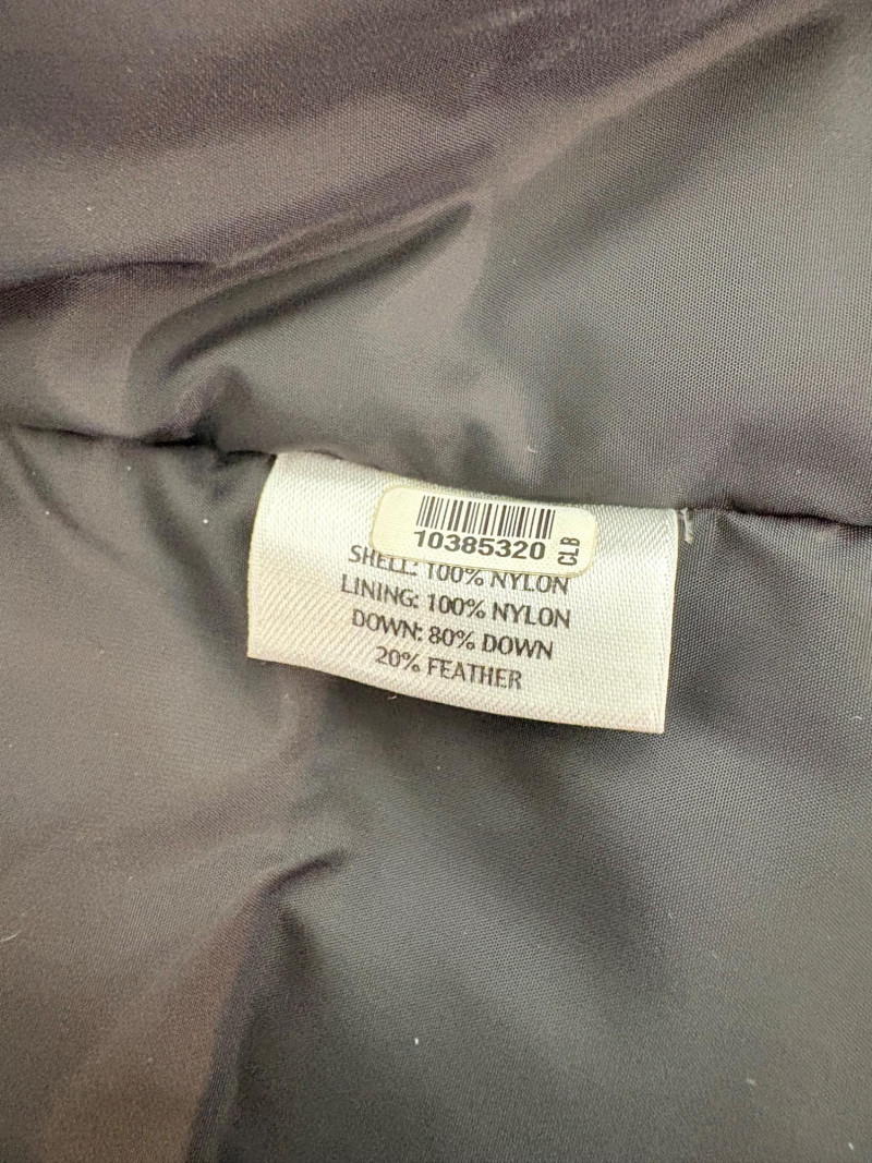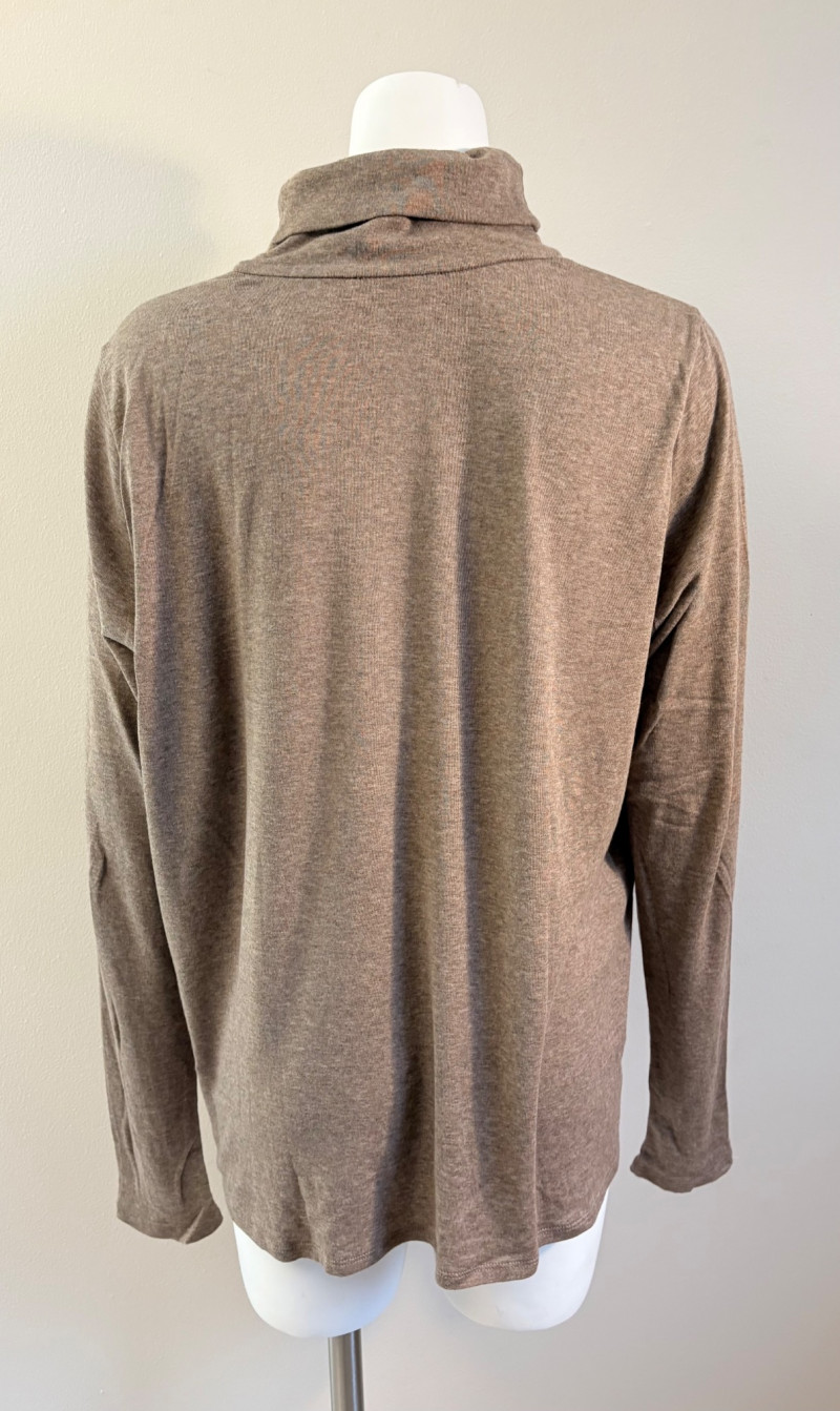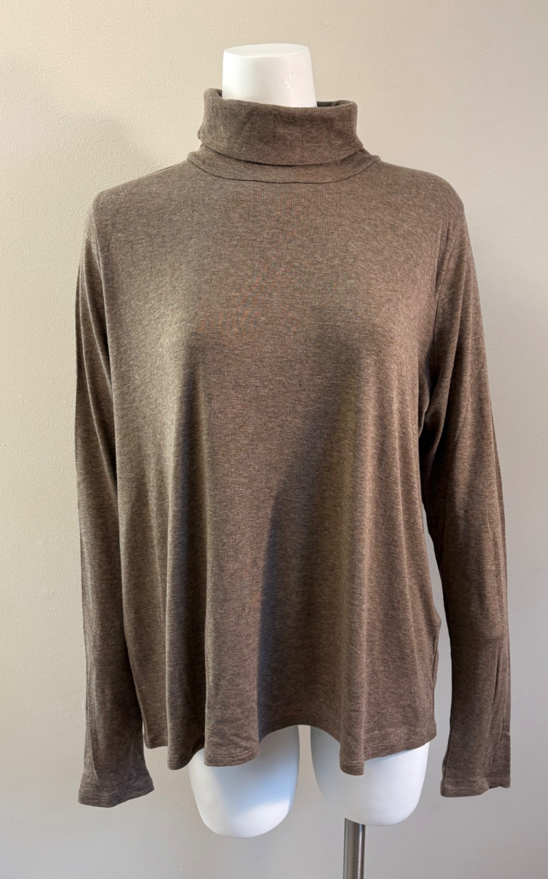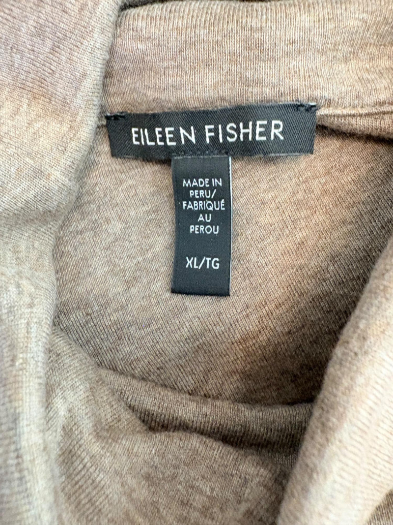 Great duo from Eileen Fisher for cooler weather. Black vest has front two-way zip closure with snaps at top and bottom, zip closure in-seam pockets on front, and funnel style collar. Armholes and hem are top-stitched as is the front placket. In excellent condition. Shell is 100% nylon while filling is 80% down and 20% feathers. Measures 24" pit to pit and 25" from center back neck seam to back hemline. Size tag says XL. Brown knit turtleneck has long sleeves, is smooth in texture, and very stretchy. In excellent condition. 50% organic cotton with 50% Lyocell. Measures 23.5" pit to pit and 24" from center back neck seam to back hemline. Size tag says XL.