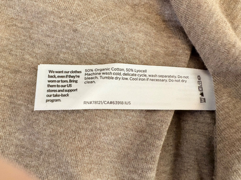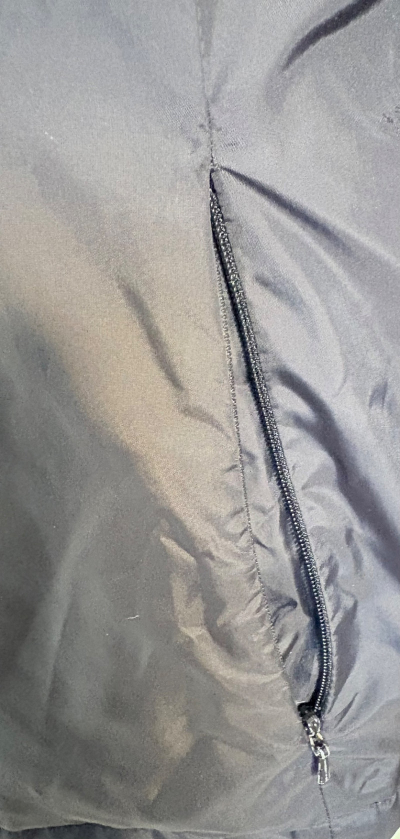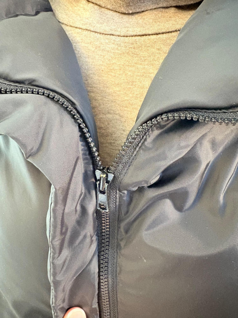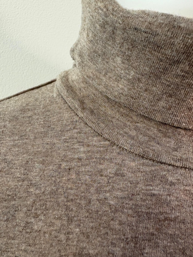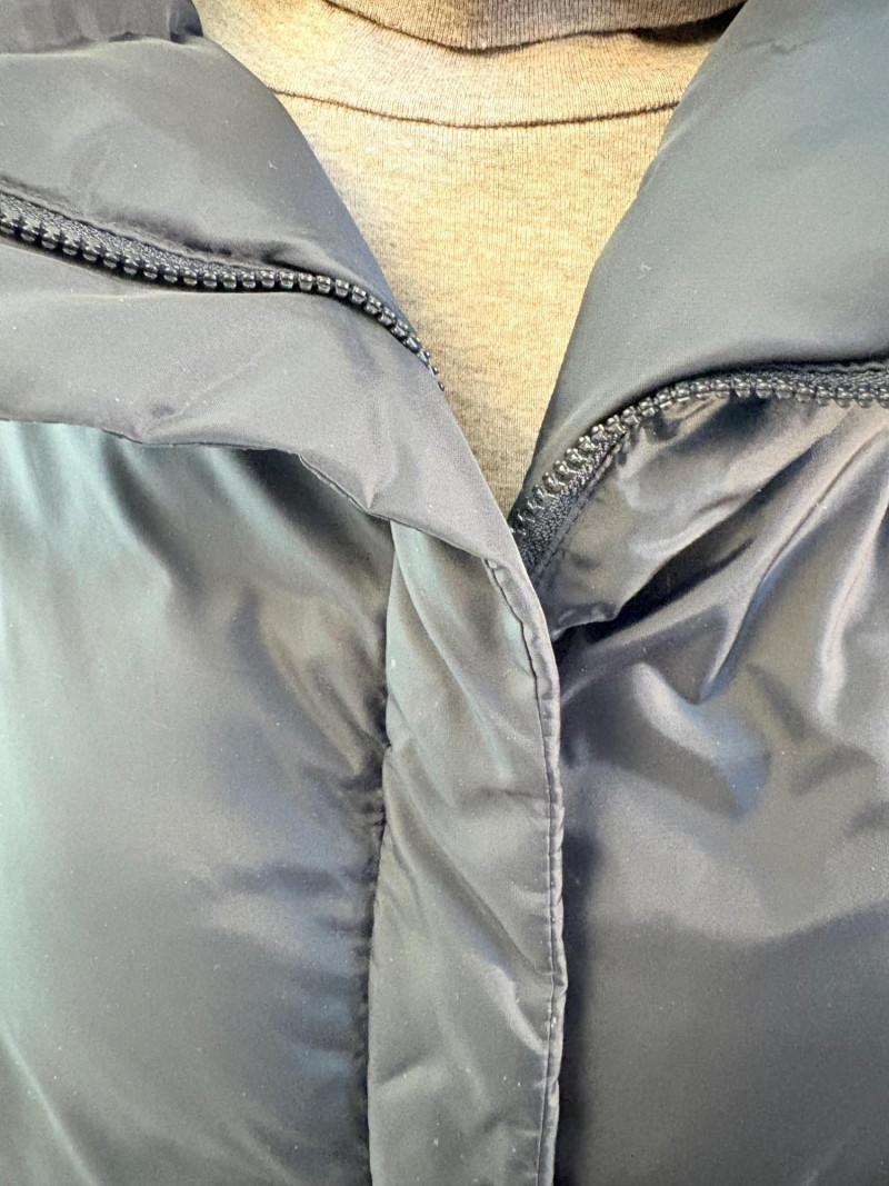 Great duo from Eileen Fisher for cooler weather. Black vest has front two-way zip closure with snaps at top and bottom, zip closure in-seam pockets on front, and funnel style collar. Armholes and hem are top-stitched as is the front placket. In excellent condition. Shell is 100% nylon while filling is 80% down and 20% feathers. Measures 24" pit to pit and 25" from center back neck seam to back hemline. Size tag says XL. Brown knit turtleneck has long sleeves, is smooth in texture, and very stretchy. In excellent condition. 50% organic cotton with 50% Lyocell. Measures 23.5" pit to pit and 24" from center back neck seam to back hemline. Size tag says XL.