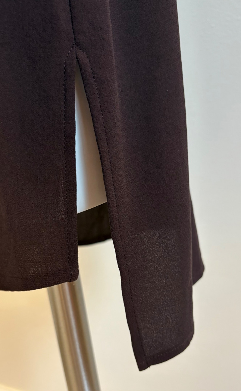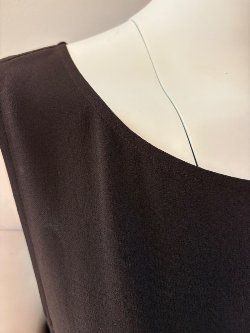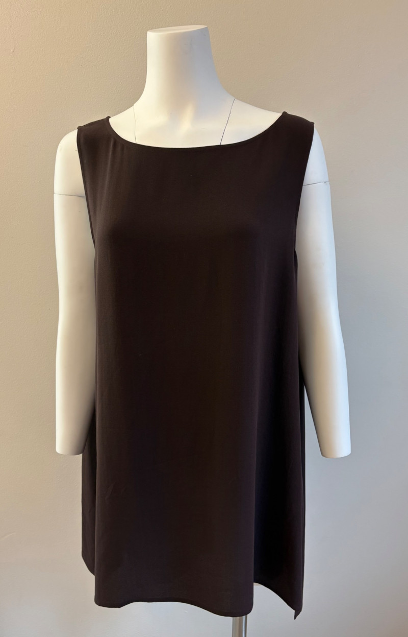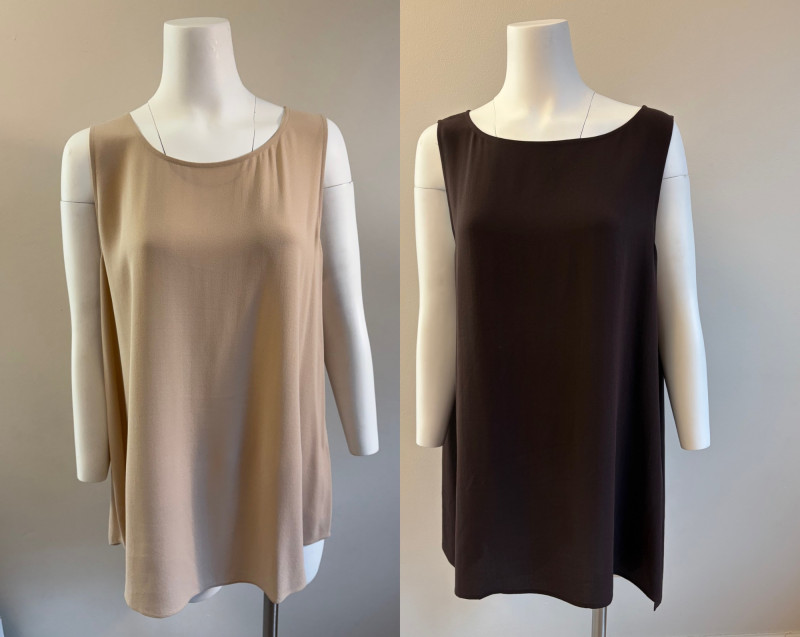 Pair of slightly different silk shells/tunics from Eileen Fisher in deep brown and beige. Brown shell has a top-stitched neck & armholes along with a split hem. Back hem is approximately 3" longer than front hem. In excellent condition. 100% silk. Measures 23.5" pit to pit and approximately 31" from center of back neckline to bottom of back hem. Size tag says XL. Beige shell has top-stitched neck, armhole, and gently curving hem. Back hem is approximately 1" longer than front hem. In excellent condition. 100% silk. Measures 23.5" pit to pit and approximately 29" from center of back neckline to bottom of back hem. Size tag says XL.