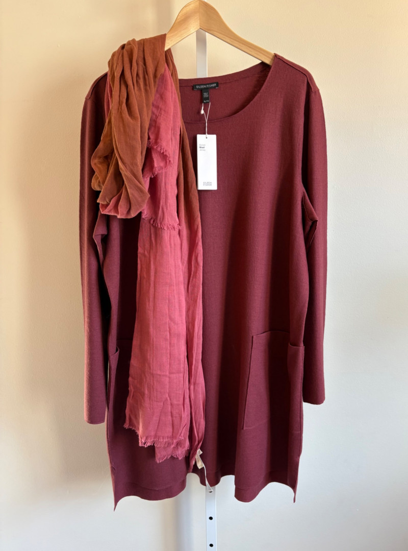 Two coordinating pieces from Eileen Fisher. Lovely, red-brick straight-cut boiled wool jersey dress has top stitching around cuffs, neckline and front patch pockets. Split hem with back hem approximately 2" longer than front hem. Lovely weight and body to the fabric with lapped seams typical of boiled wool. New with tag. 100% wool. Measures 24.5" pit to pit and 35" from center back neck seam to back hemline. Size tag says XL. Matching ombre scarf moves from an orange-brick to a pinkish red color providing a great contrast with the dress. Scarf is approximately 27" x 72" with fringe on the short ends. 100% organic cotton. In excellent shape.