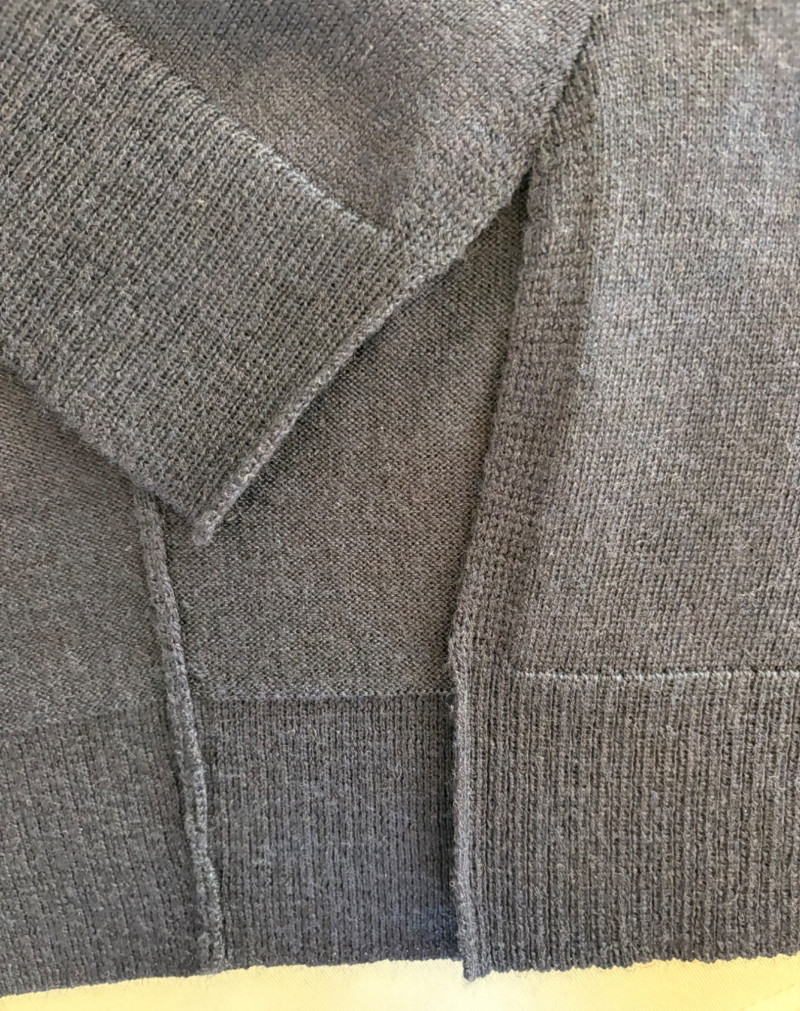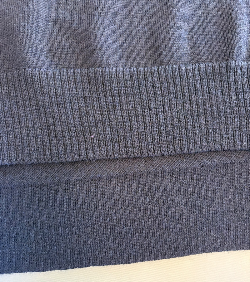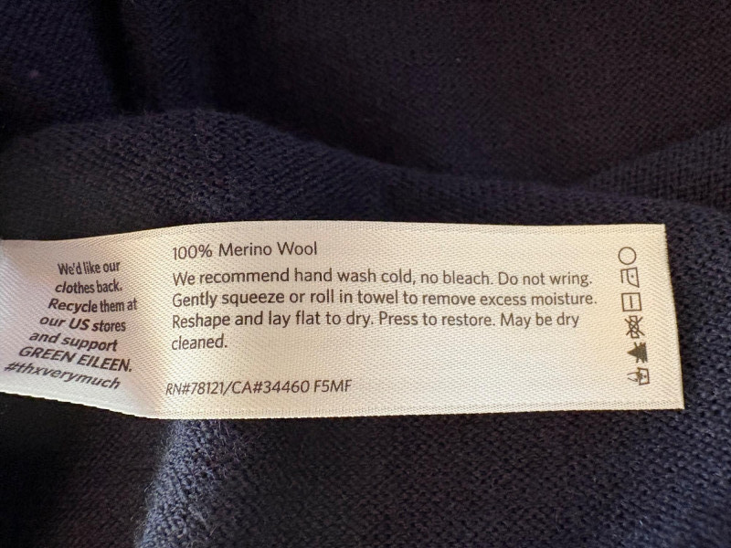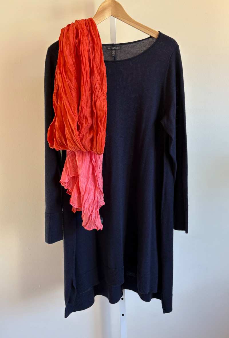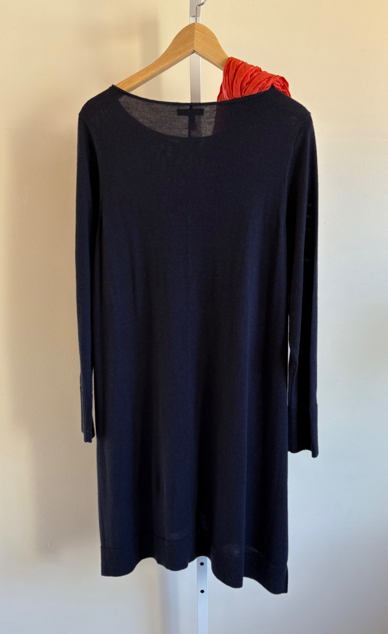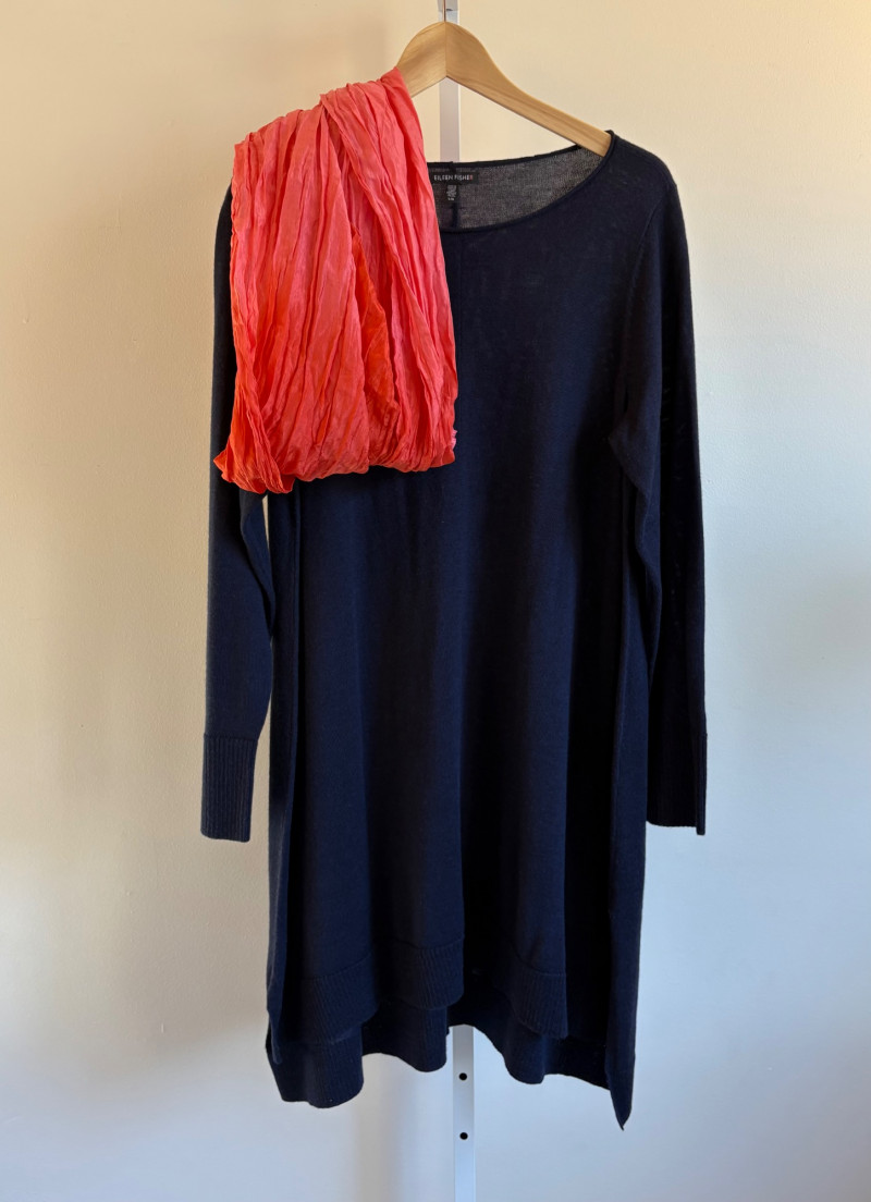 Knit dress and contrasting cotton scarf from Eileen Fisher. Gorgeous navy blue sweater dress has rolled neck, ribbed cuffs, center front & back seaming, and ribbed split hemline. Back hem approximately 3" longer than front hem. In excellent condition. 100% merino wool. Measures 20" pit to pit and 36" from center back neck seam to back hemline. Size tag says L/G.