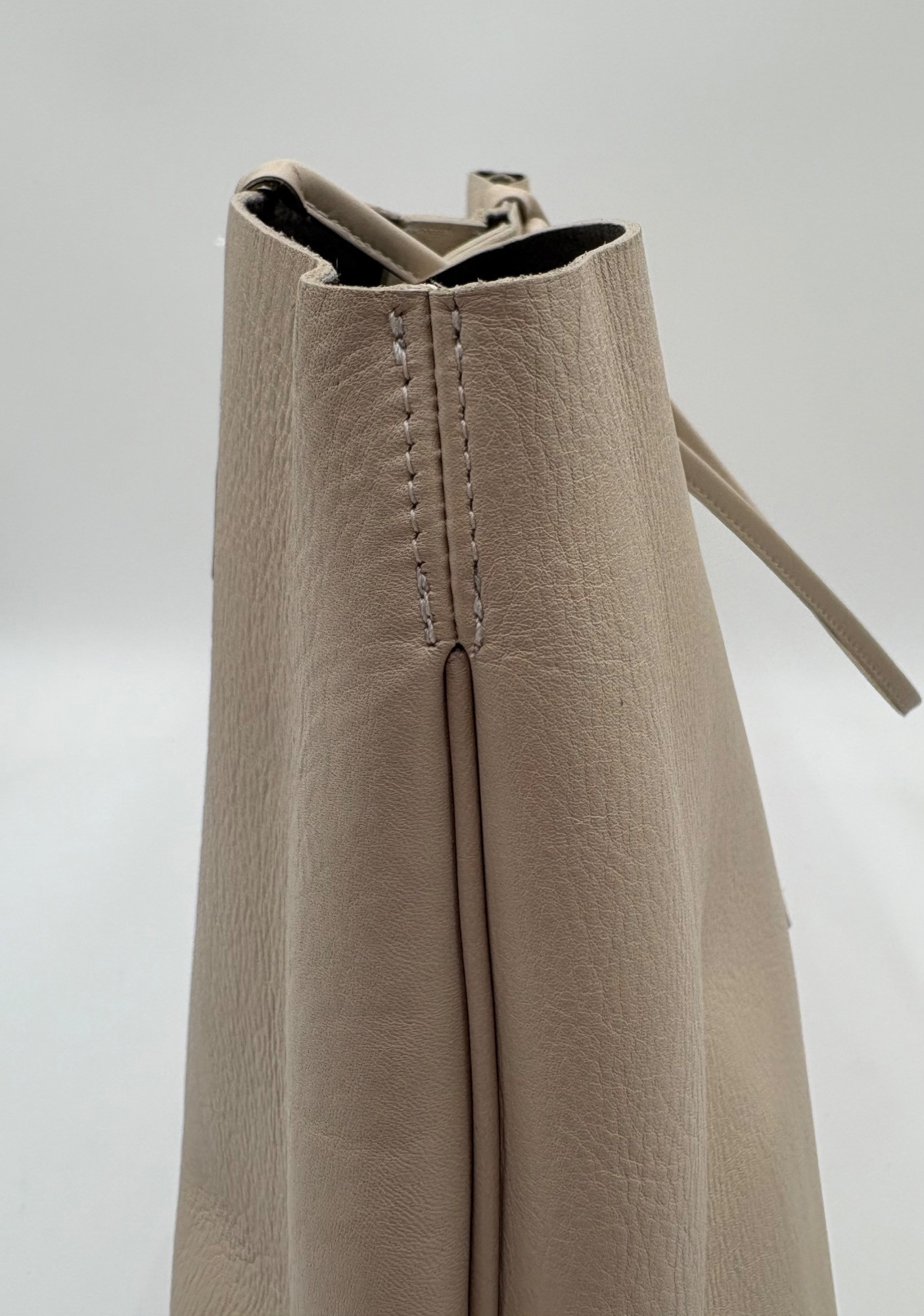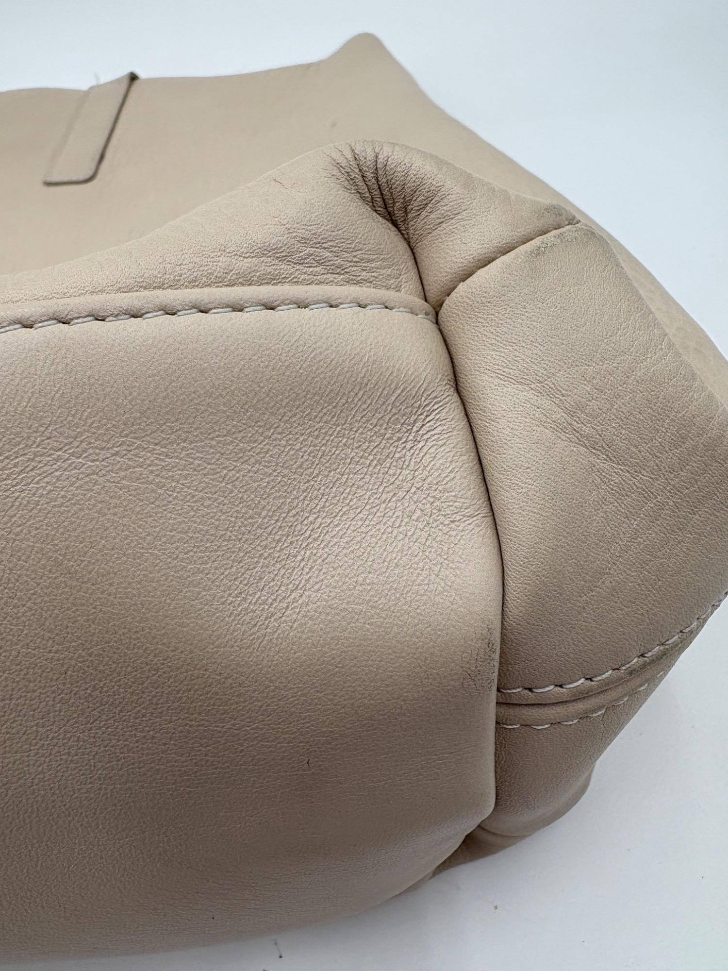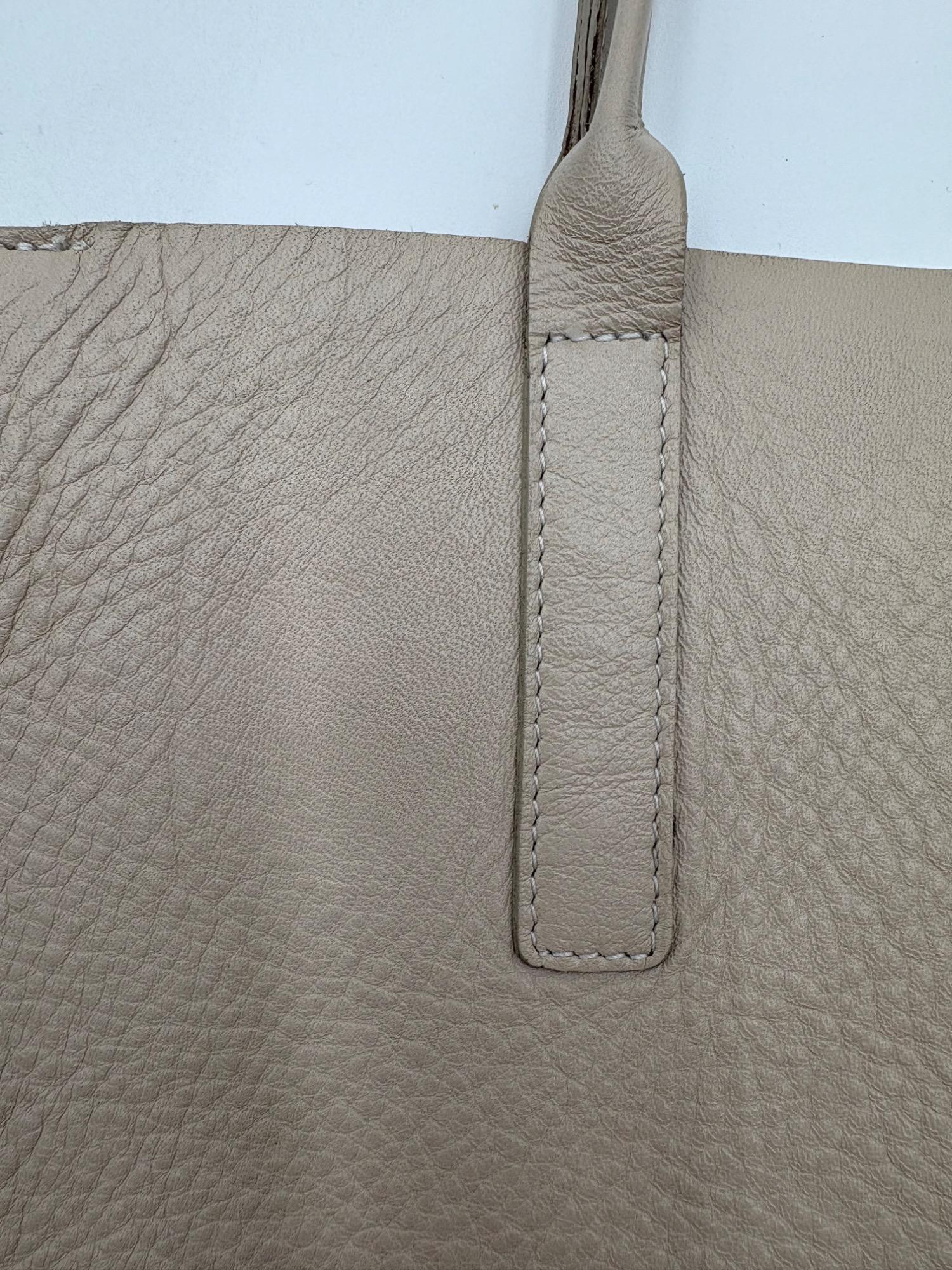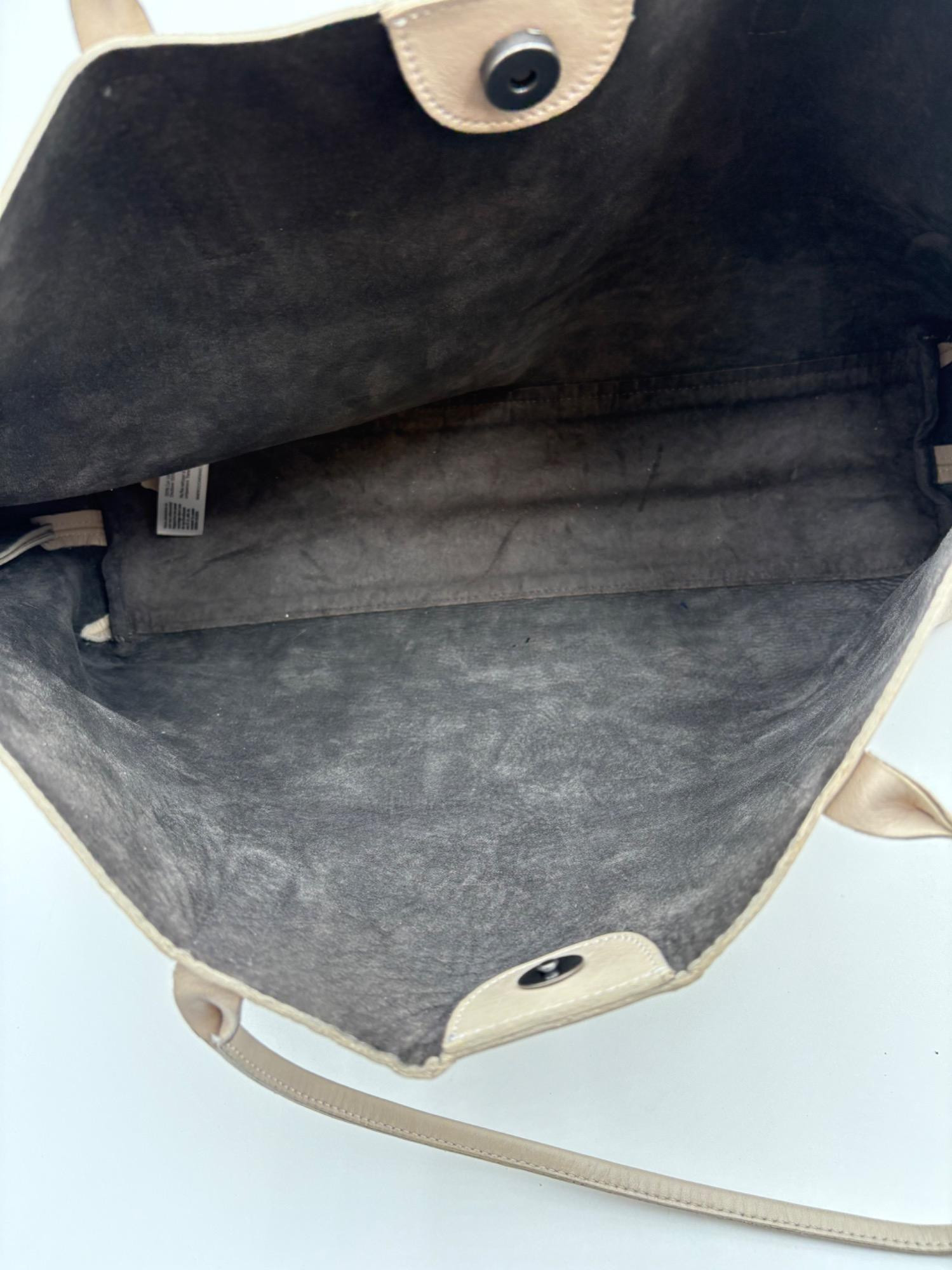 Understated leather tote from Eileen Fisher. This tote is in supple beige/cream leather on the exterior with a dark brown suede internal finish; very minimalist in style. Magnetic top closure, rounded straps, and no interior pockets. Two small subtle details stand out - a small run of piping down the side seams, and topstitching on the upper portion of those seams as the piping ends. Super neutral hue that will go with any outfit. In excellent used condition - only a few very small flaws noticed upon doing close-up photos - see last photo. Measures 12" H x 16" W with 12" drop from top of straps to top center of bag.