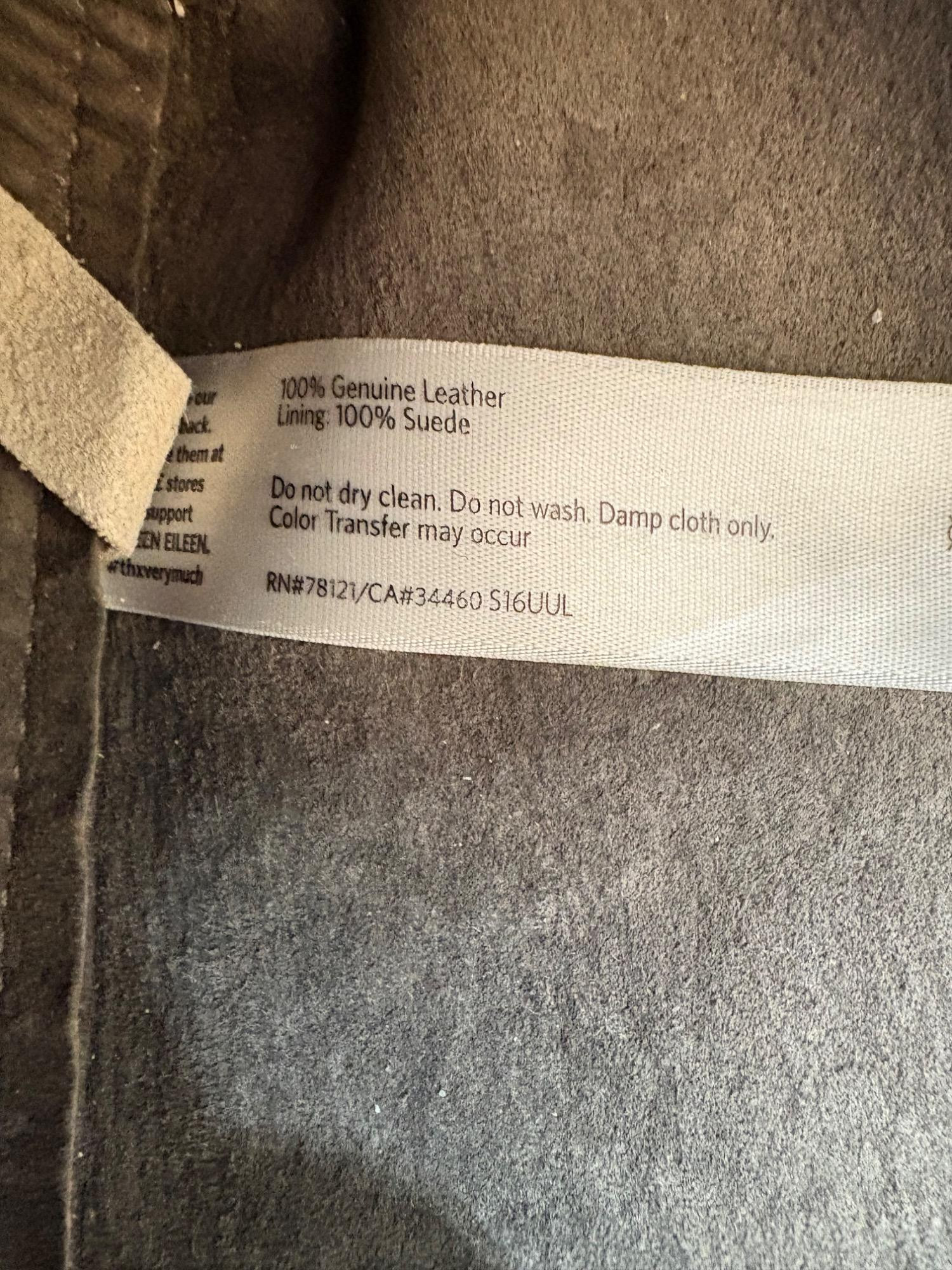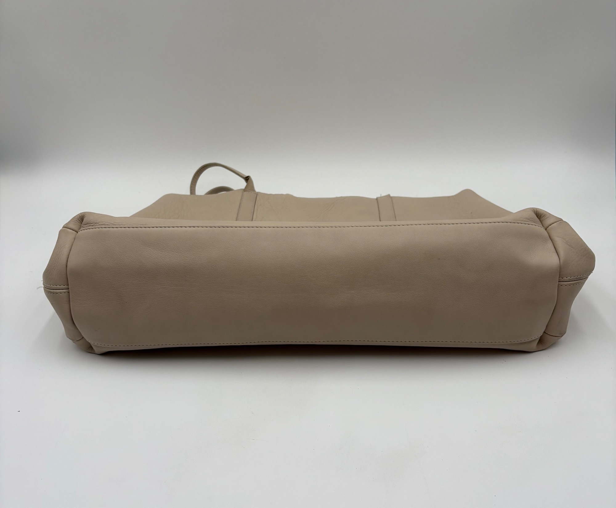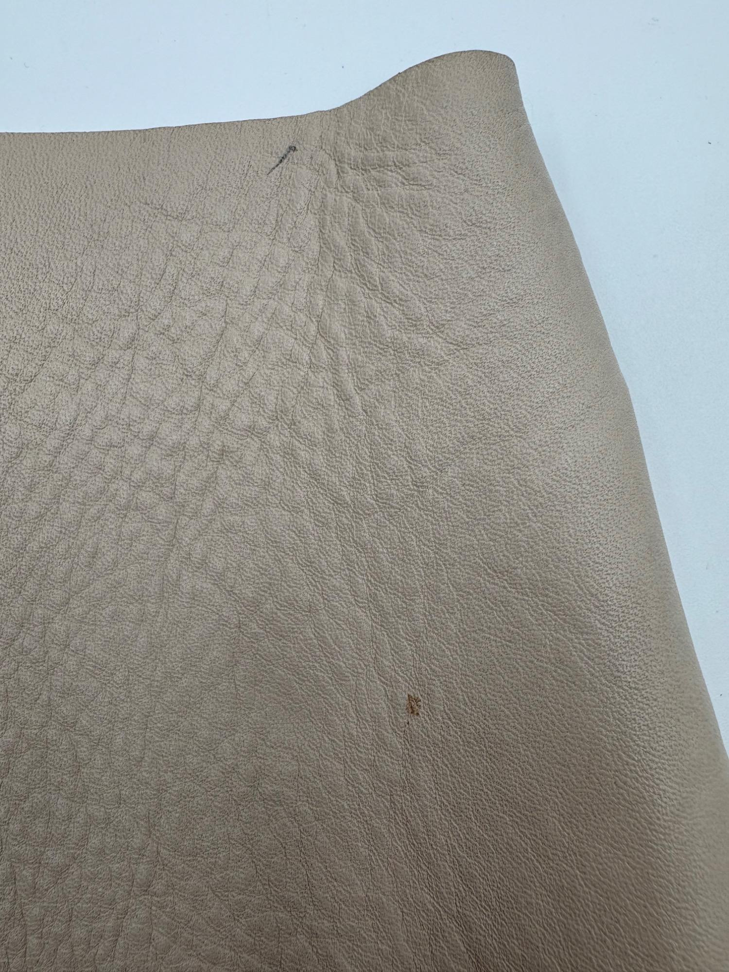 Understated leather tote from Eileen Fisher. This tote is in supple beige/cream leather on the exterior with a dark brown suede internal finish; very minimalist in style. Magnetic top closure, rounded straps, and no interior pockets. Two small subtle details stand out - a small run of piping down the side seams, and topstitching on the upper portion of those seams as the piping ends. Super neutral hue that will go with any outfit. In excellent used condition - only a few very small flaws noticed upon doing close-up photos - see last photo. Measures 12" H x 16" W with 12" drop from top of straps to top center of bag.