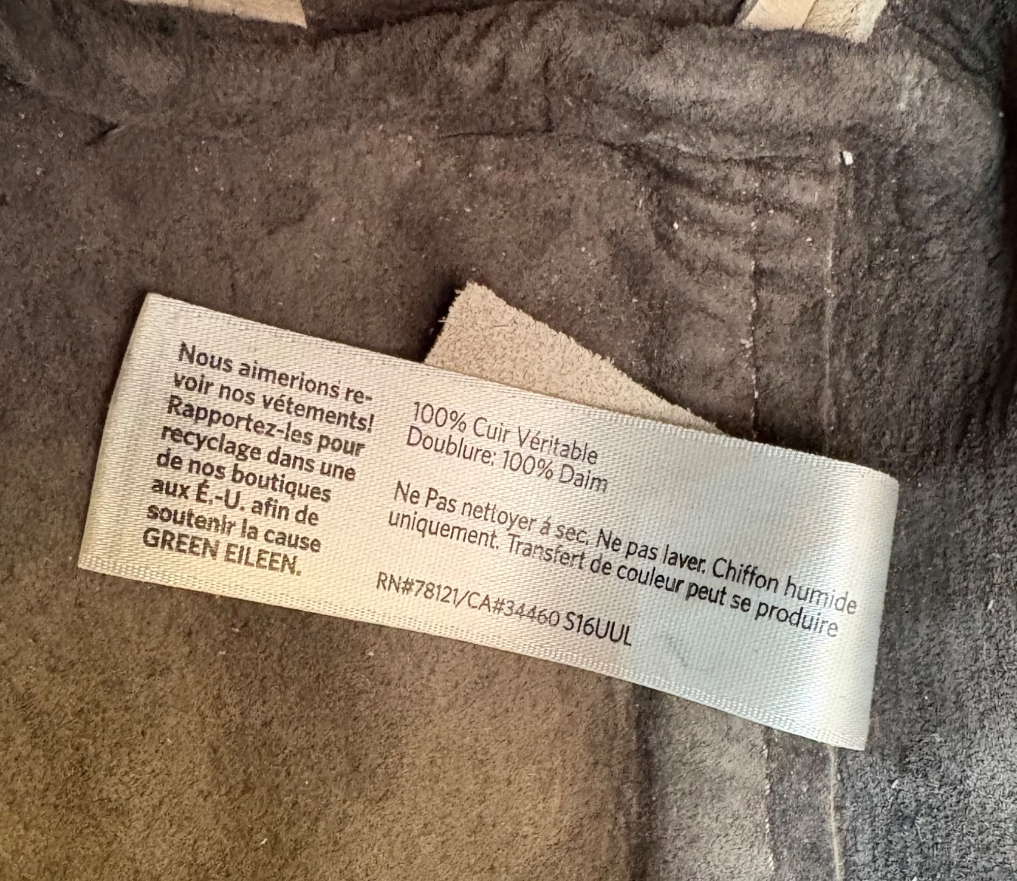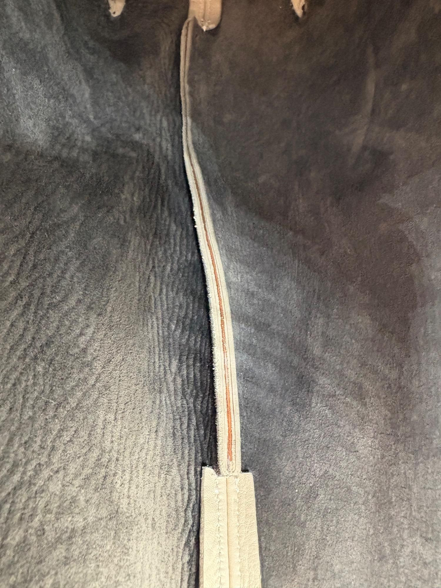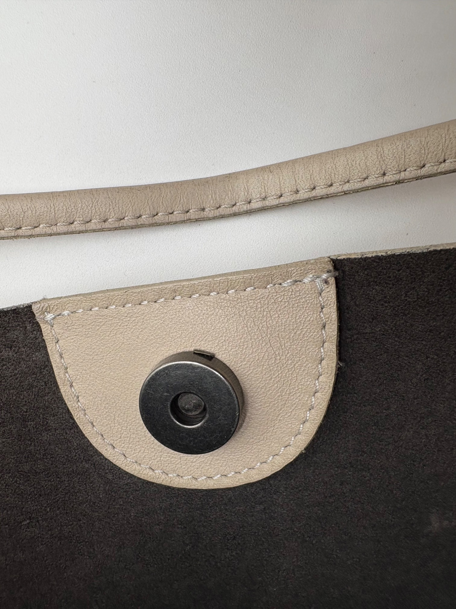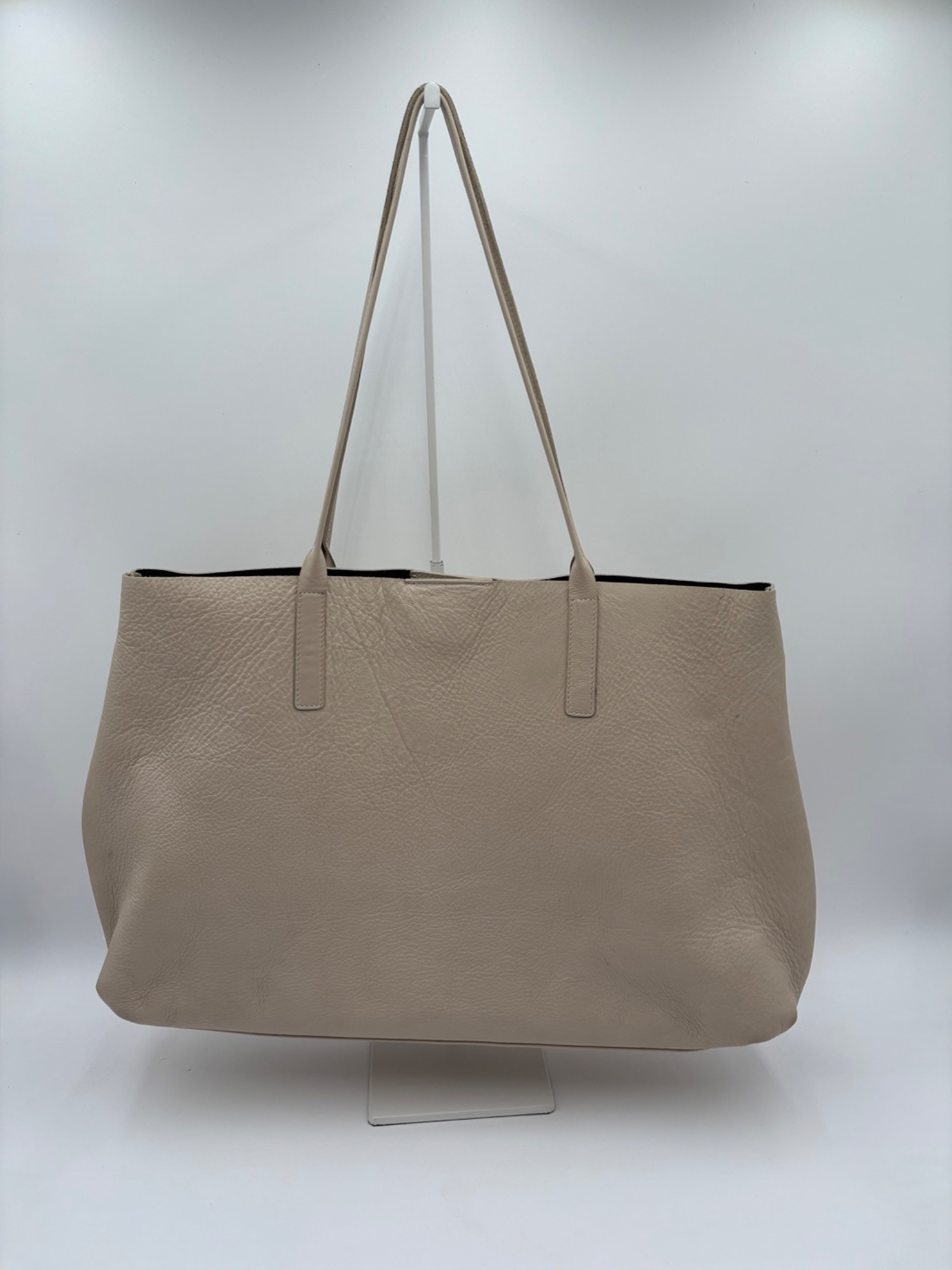 Understated leather tote from Eileen Fisher. This tote is in supple beige/cream leather on the exterior with a dark brown suede internal finish; very minimalist in style. Magnetic top closure, rounded straps, and no interior pockets. Two small subtle details stand out - a small run of piping down the side seams, and topstitching on the upper portion of those seams as the piping ends. Super neutral hue that will go with any outfit. In excellent used condition - only a few very small flaws noticed upon doing close-up photos - see last photo. Measures 12" H x 16" W with 12" drop from top of straps to top center of bag.