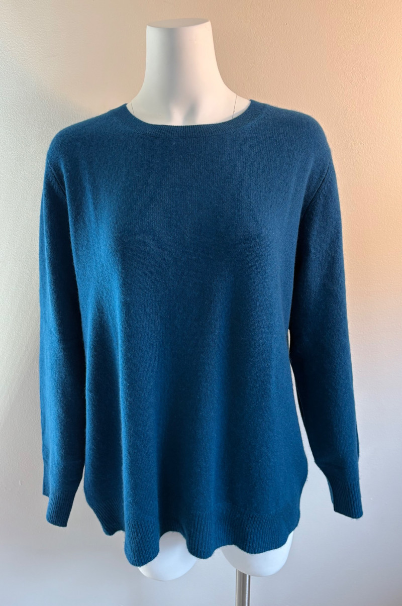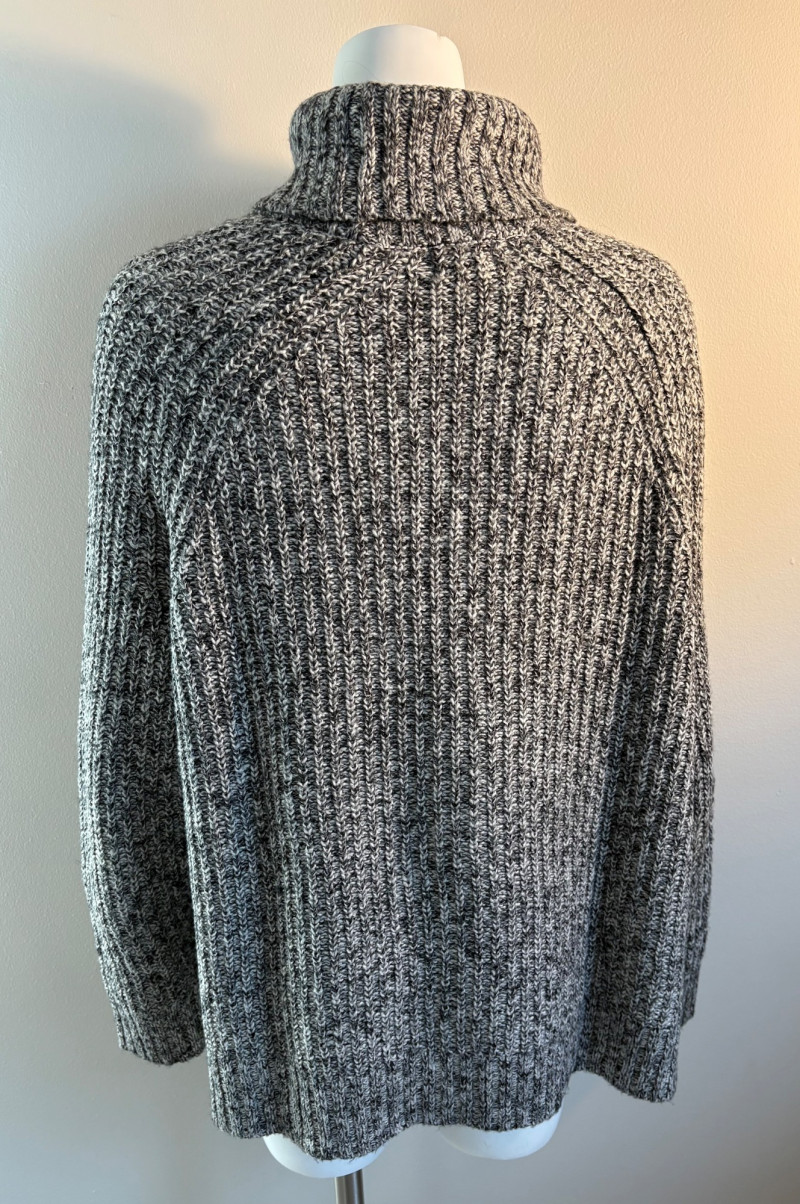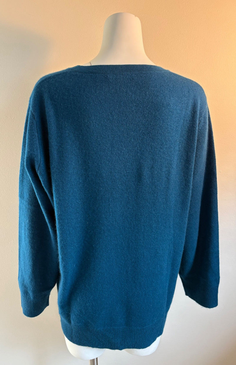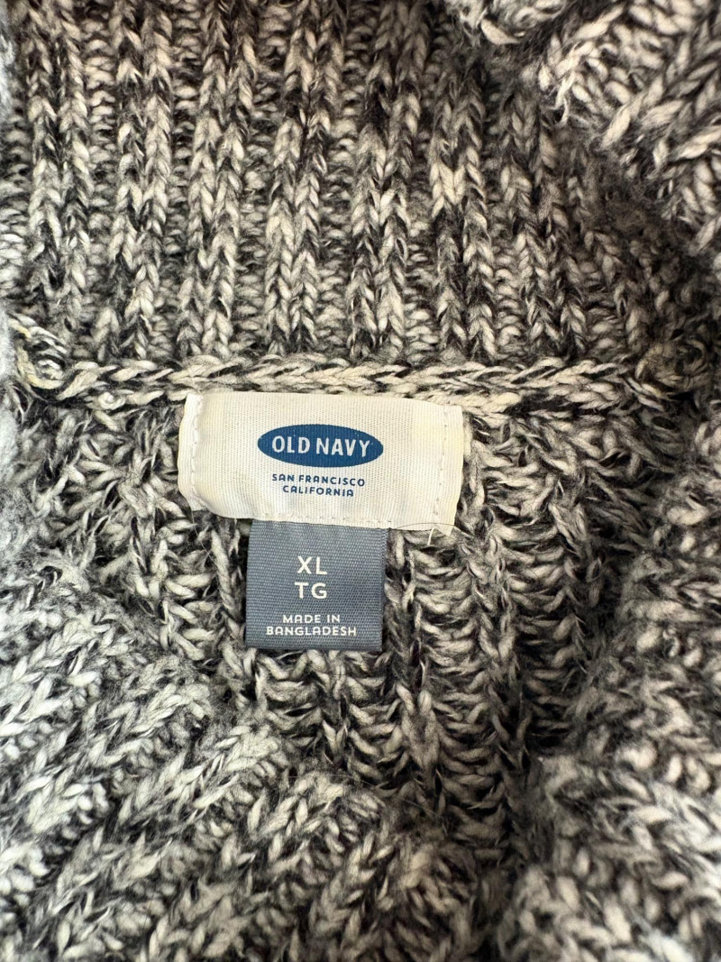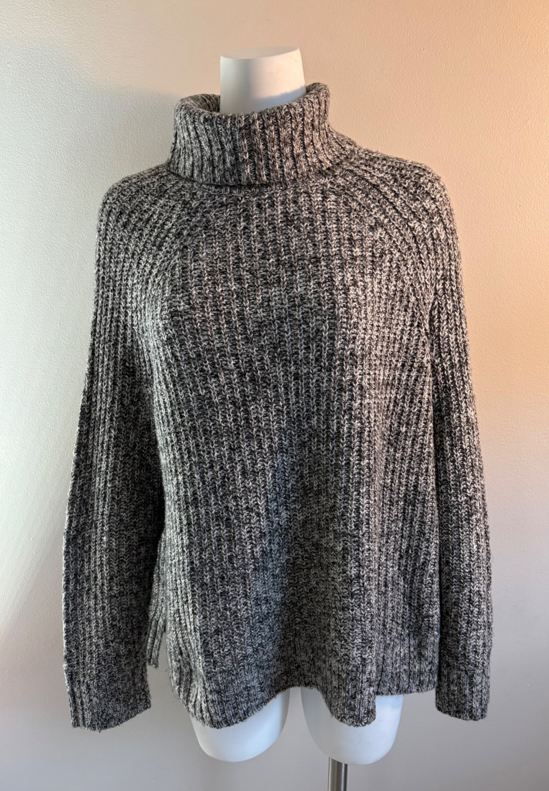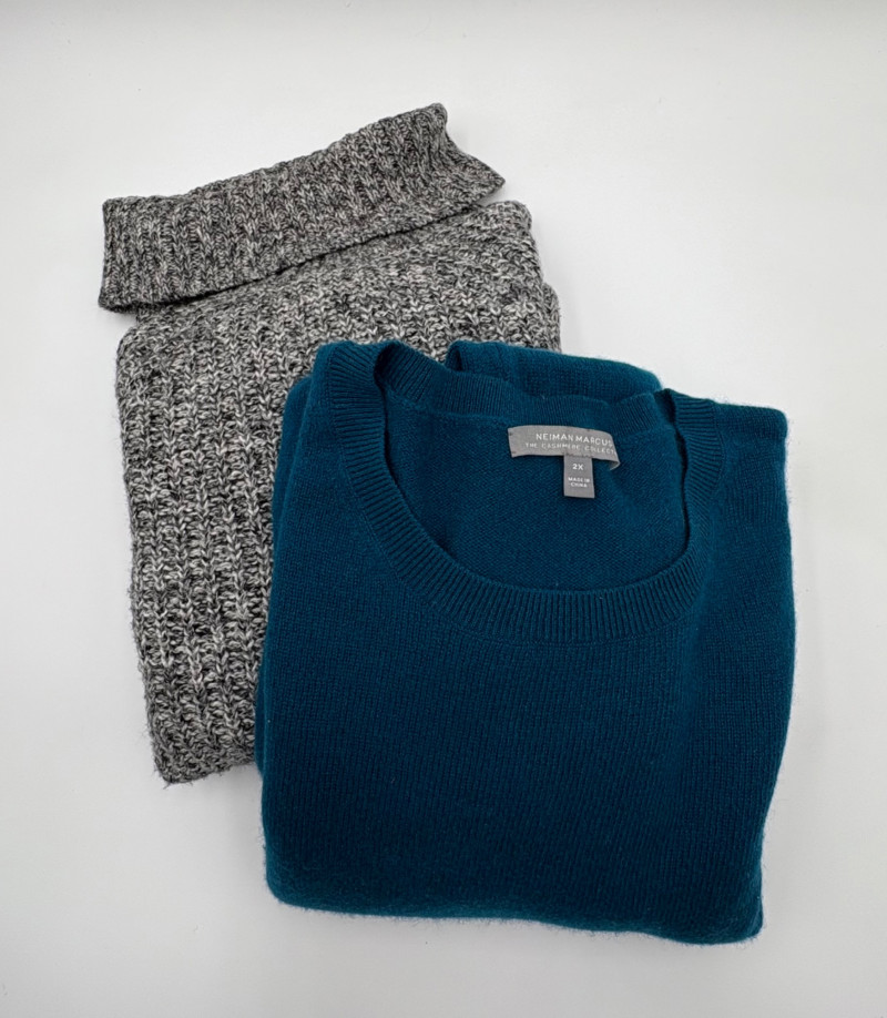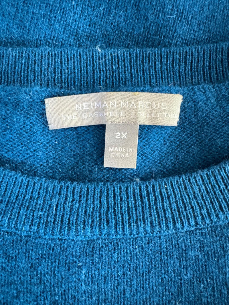 Pair of contrasting weight sweaters from Neiman-Marcus & Old Navy. Saturated teal crewneck sweater from Neiman-Marcus has ribbing around the neckline, cuffs, and hemline. In excellent condition. 100% cashmere. Measures 24" pit to pit and 27" from center back neck seam to back hemline. Size tag says 2X. Marled grey & white sweater from Old Navy has turtleneck, raglan sleeves, and ribbing on turtleneck, cuffs, and split hemline. Back hem is approx. 2" longer than front. In excellent condition. 61% cotton with 39% acrylic. Measures 24.5" pit to pit and 24.5" from center back neck seam to back hemline. Size tag says XL.