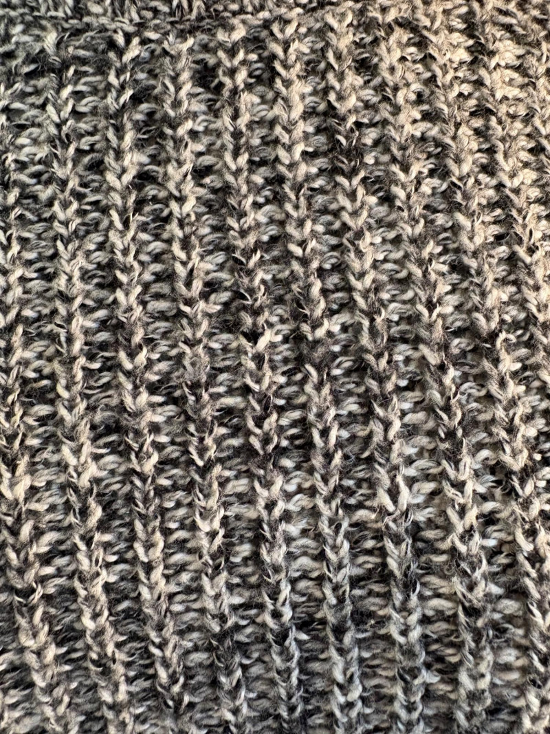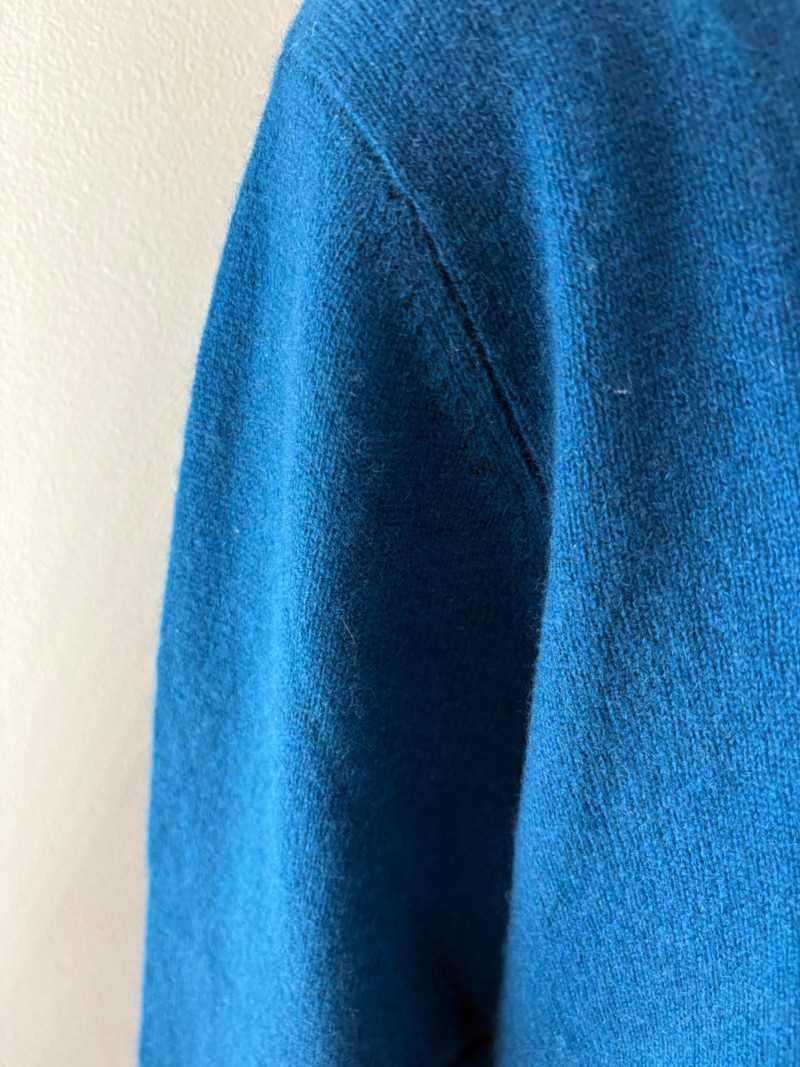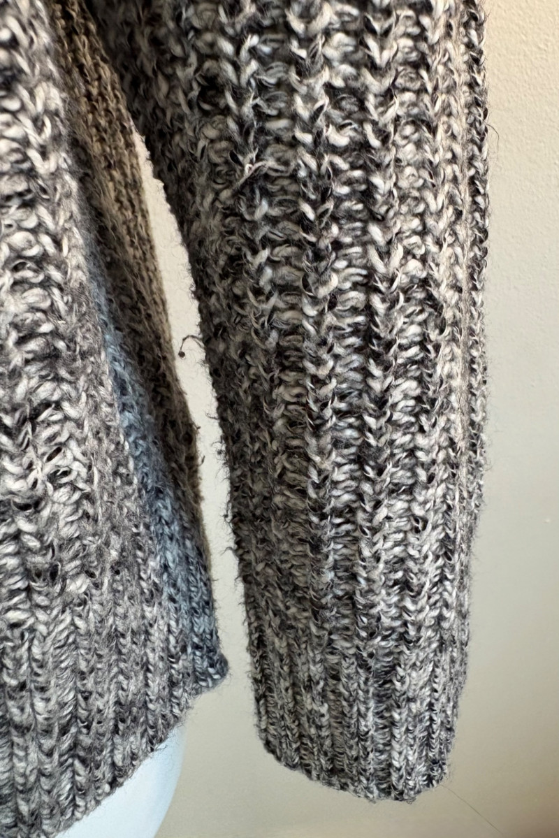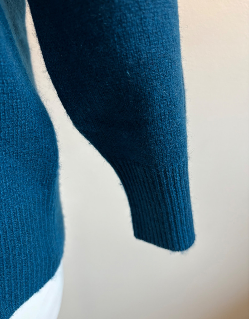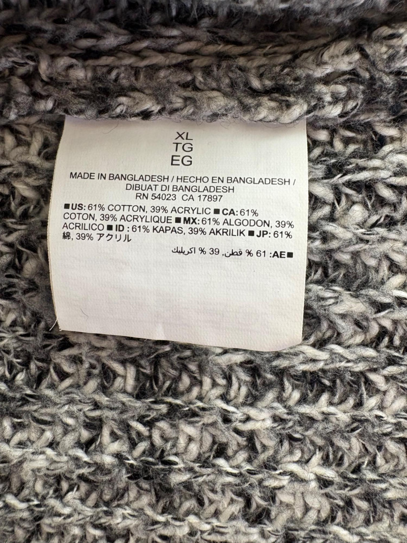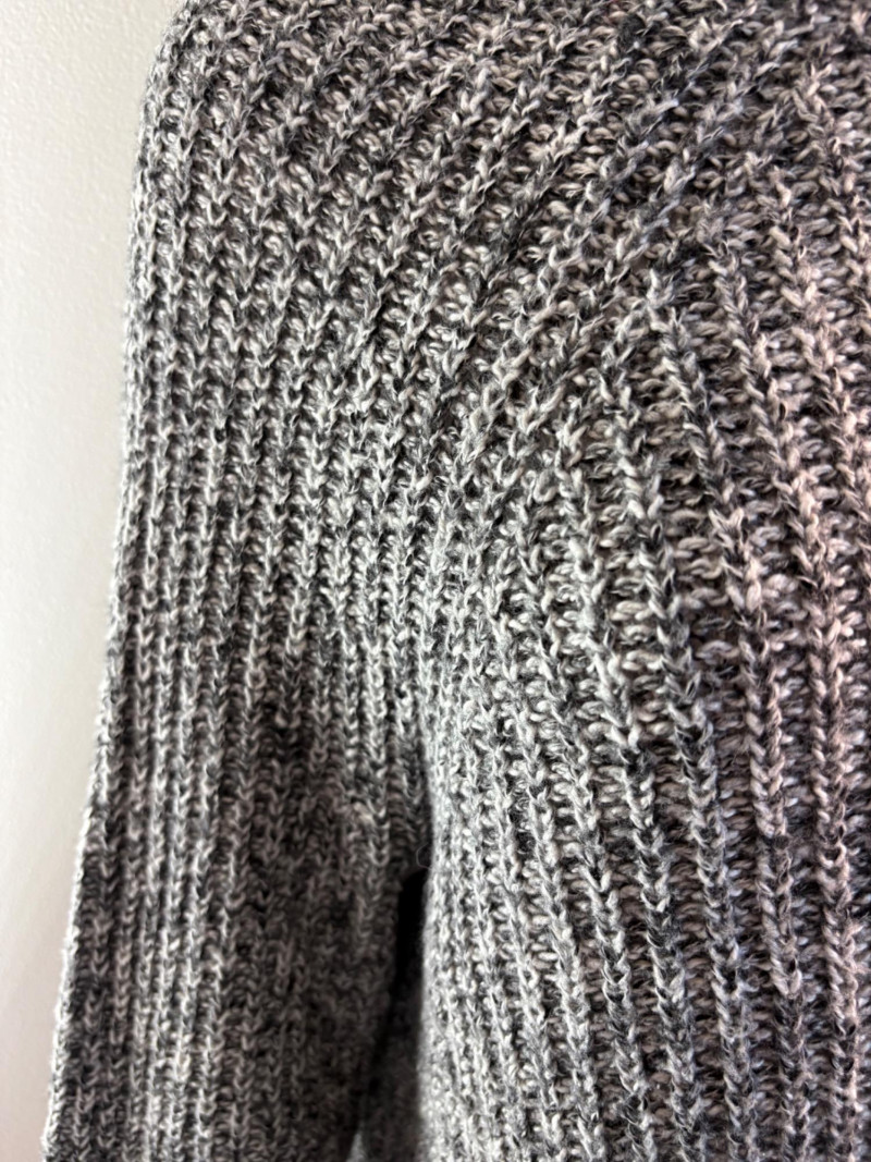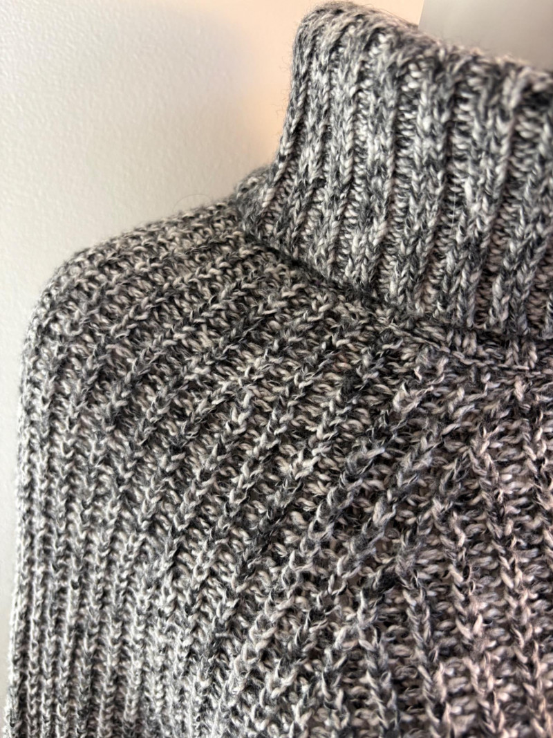 Pair of contrasting weight sweaters from Neiman-Marcus & Old Navy. Saturated teal crewneck sweater from Neiman-Marcus has ribbing around the neckline, cuffs, and hemline. In excellent condition. 100% cashmere. Measures 24" pit to pit and 27" from center back neck seam to back hemline. Size tag says 2X. Marled grey & white sweater from Old Navy has turtleneck, raglan sleeves, and ribbing on turtleneck, cuffs, and split hemline. Back hem is approx. 2" longer than front. In excellent condition. 61% cotton with 39% acrylic. Measures 24.5" pit to pit and 24.5" from center back neck seam to back hemline. Size tag says XL.