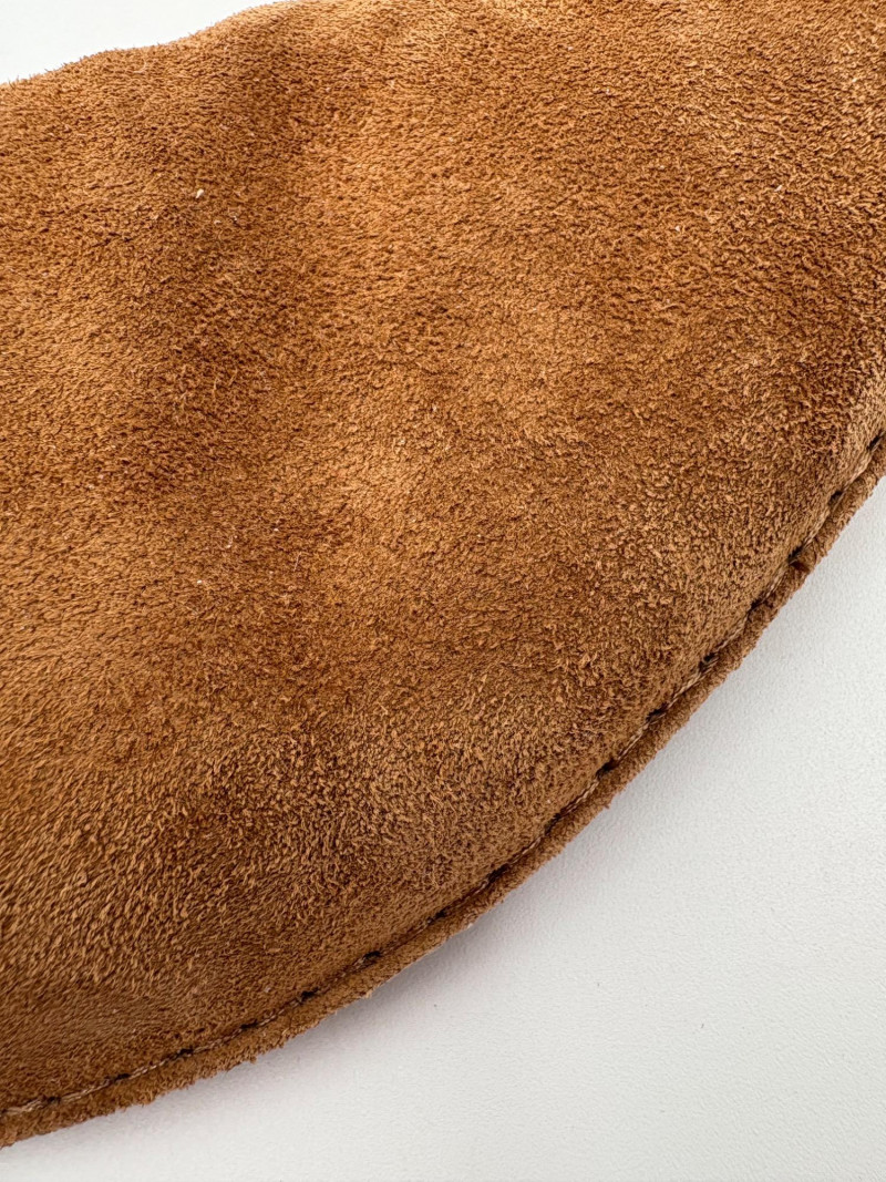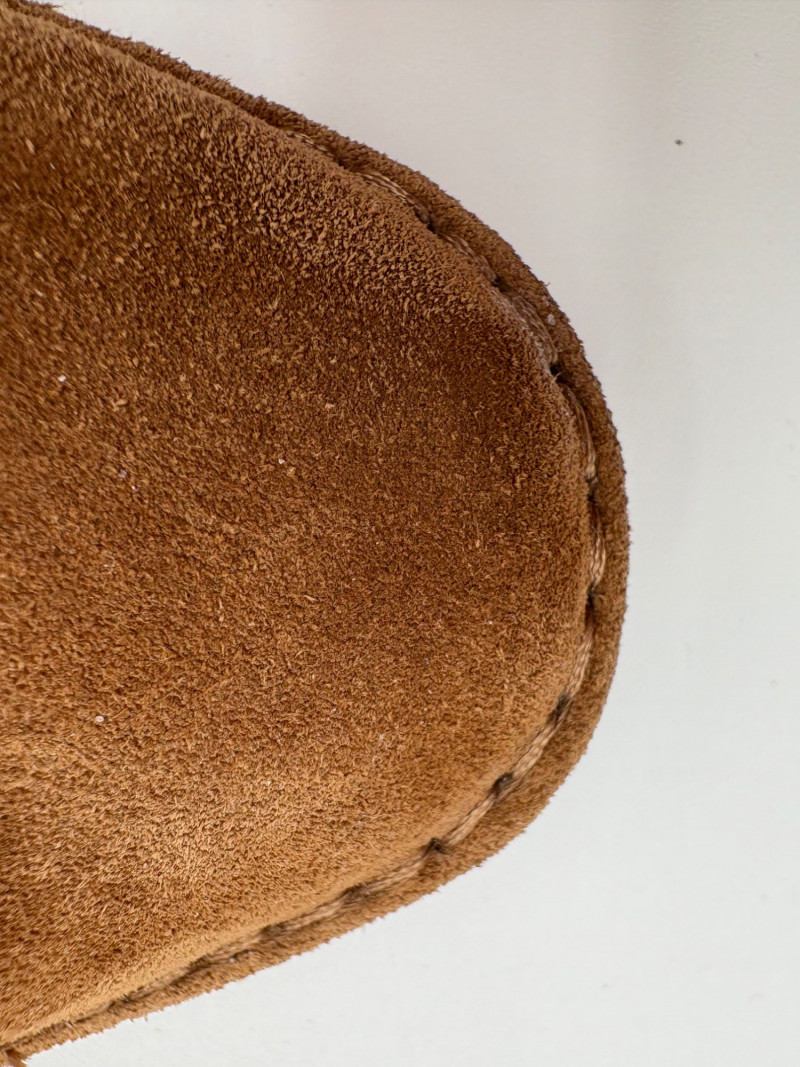 Exquisite brown suede shoes with a minimalist design from Vince. These sleek modern shoes are typical Vince - small details done as part of an understated whole. There is topstitching round the outer sole and edges of the suede uppers with a deep ankle dip. They have non-slip rubber soles and pair well with easy flowing clothes of natural fibers like like Eileen Fisher or Oska. In great used condition. Size 7.5