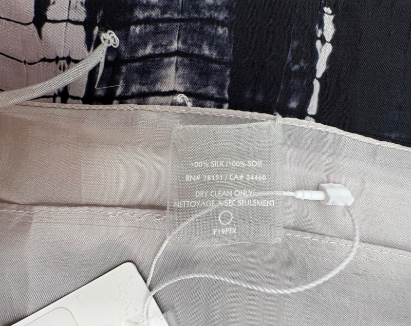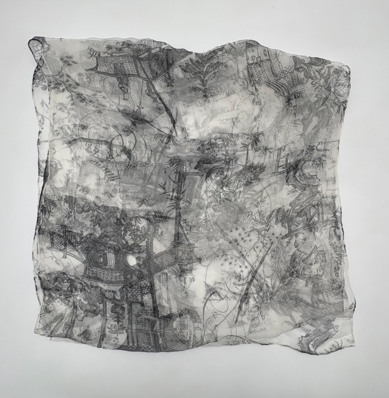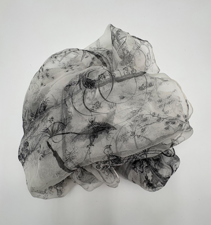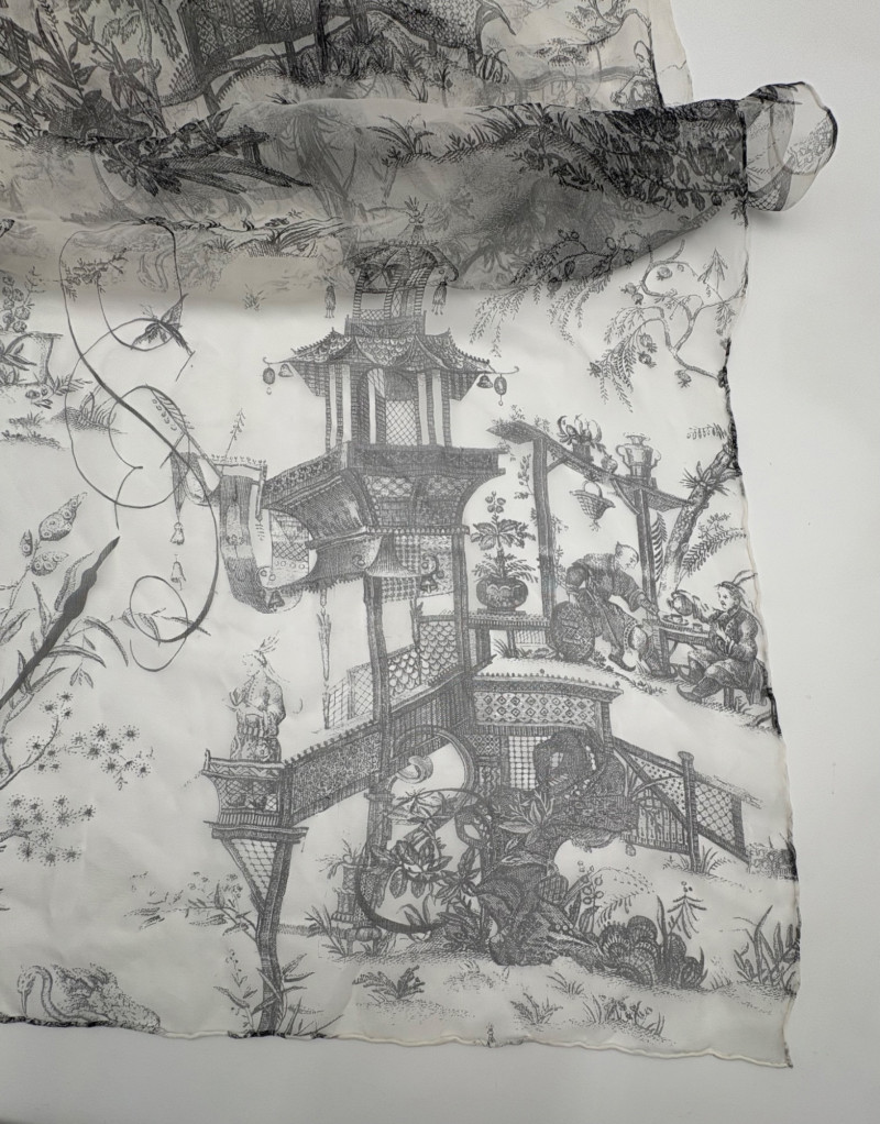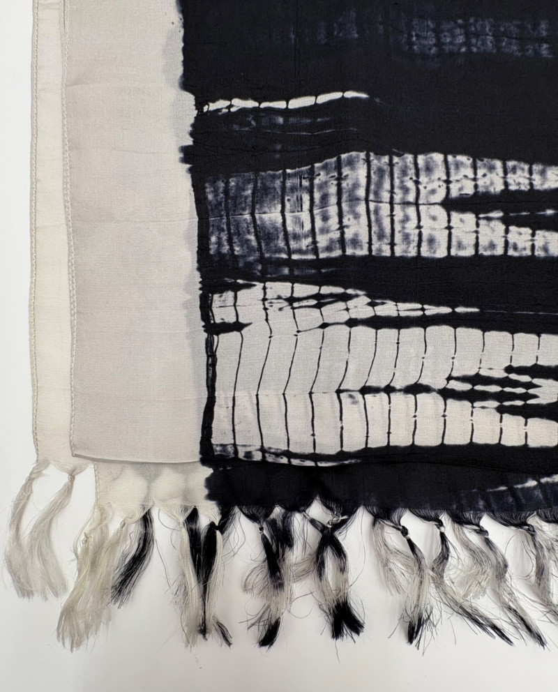 Two very different scarves in black & white from Eileen Fisher and an unknown maker. Black and white batik-patterned scarf from Eileen Fisher has fringe on short ends with a white border. 100% shibori silk. New with tag. Measures approx. 22" x 70". Filmy black & white toile print has rolled edge. No maker or fabric tag, but feels vintage. Measures approx. 20" x 70".
