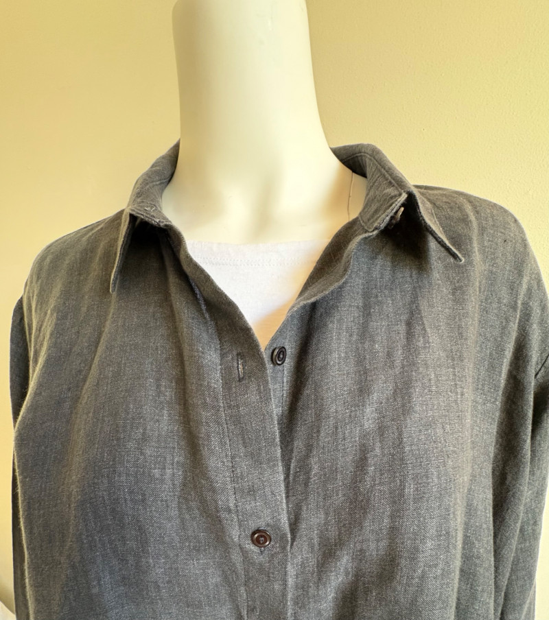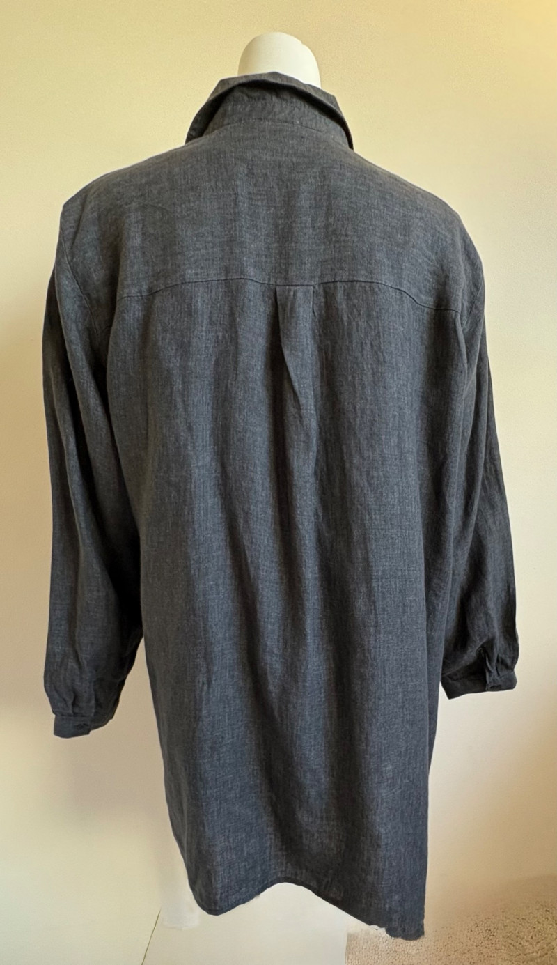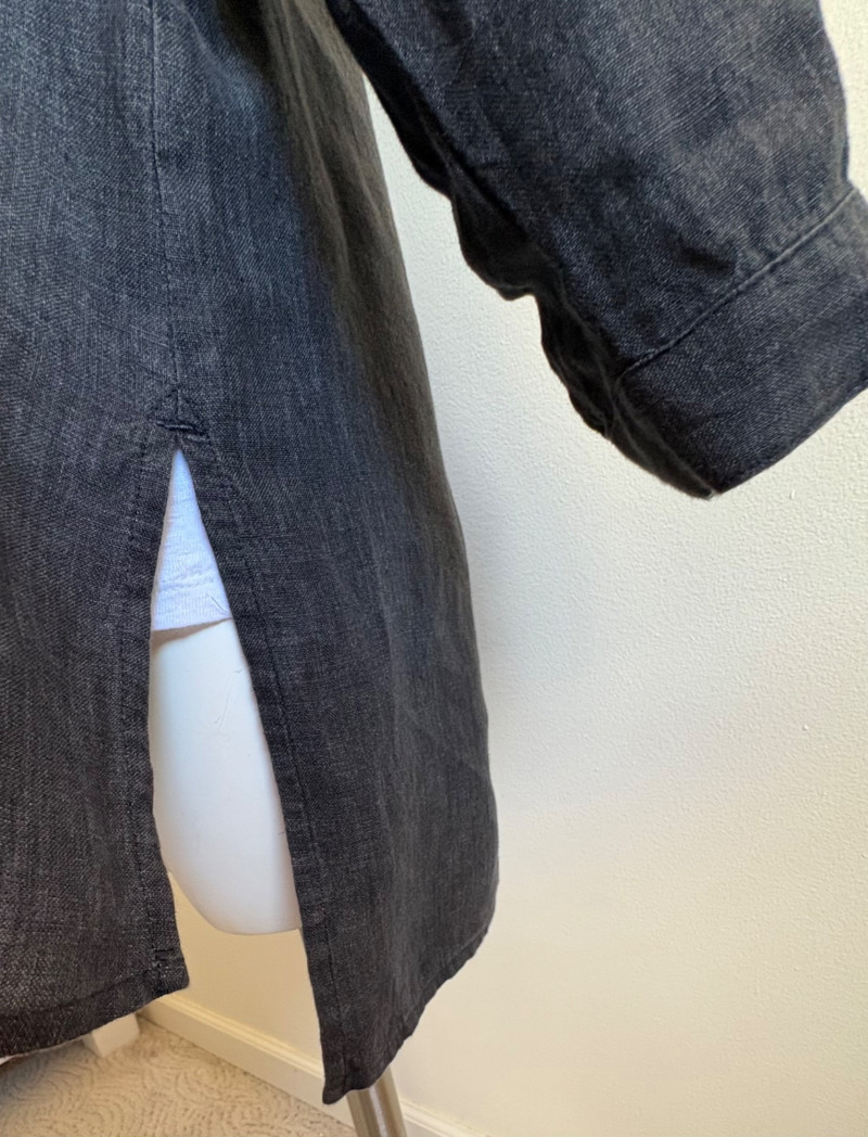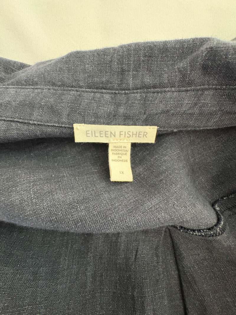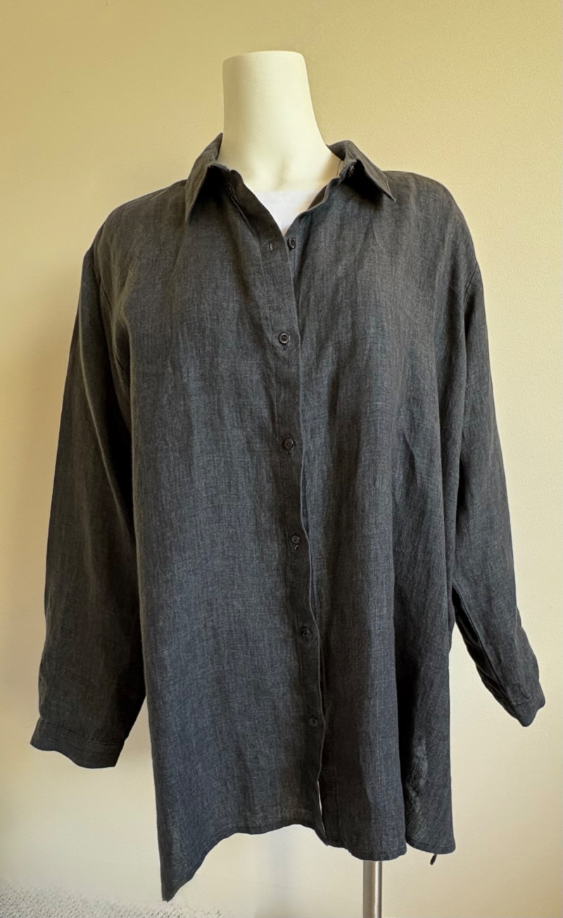 Linen separates from Eileen Fisher. Both 100% linen. Charcoal grey-black linen A-line overshirt with button front closure, button close cuffs, back yoke, and split hem. Back hem is approx. 2" longer than front hem. In excellent condition. Measures 26.5" pit to pit and 32" from center back neck seam to back hemline. Size tag says 1X. White cap sleeve t-shirt is in excellent condition. Measures 23" pit to pit and 26" from center back neckline to bottom of back hem. Size tag has faded out.