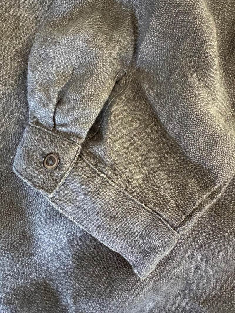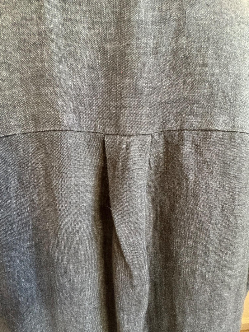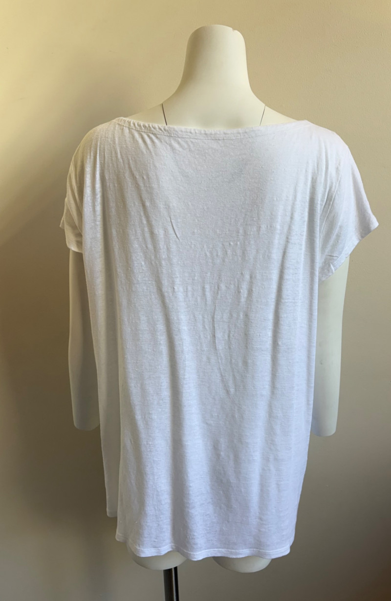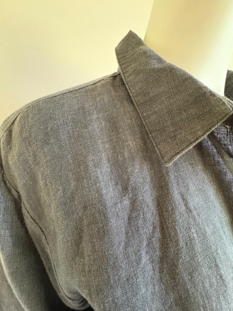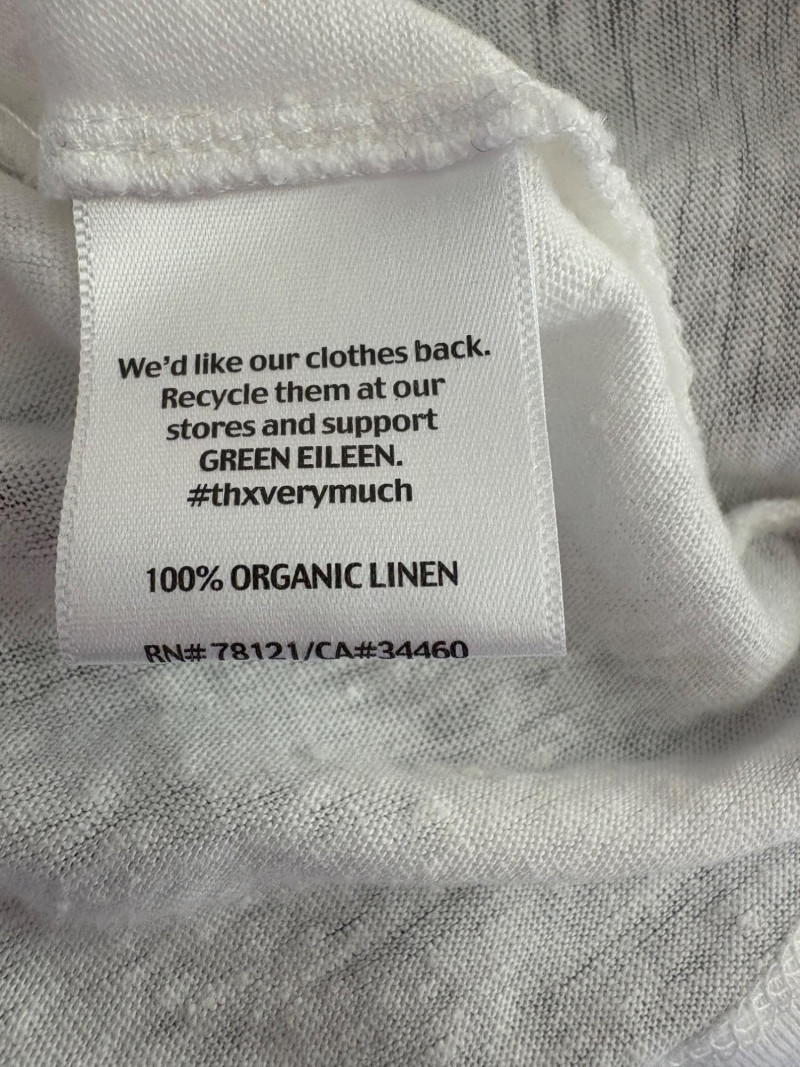 Linen separates from Eileen Fisher. Both 100% linen. Charcoal grey-black linen A-line overshirt with button front closure, button close cuffs, back yoke, and split hem. Back hem is approx. 2" longer than front hem. In excellent condition. Measures 26.5" pit to pit and 32" from center back neck seam to back hemline. Size tag says 1X. White cap sleeve t-shirt is in excellent condition. Measures 23" pit to pit and 26" from center back neckline to bottom of back hem. Size tag has faded out.