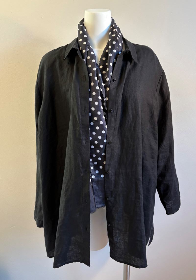 Great linen pieces with matching scarf from Eileen Fisher & Esprit. White sleeveless t-shirt from Eileen Fisher has high curved neckline and split hem. In excellent condition. 100% linen. Measures 25" pit to pit and 23" from back neckline to bottom back hem. Size tag says XL. Black overshirt from Eileen Fisher has traditional collar with front button closure, single button pleated cuff closure, split hem, and back yoke with center pleat. In excellent condition. 100% linen. Measures 26.5" pit to pit and 33" from back neckline to center back hemline. Size tag says 1X. Black & white scarf from Esprit has white polka dots on black and short edge fringe. Fabric tag is missing, but we believe it is 100% silk given the feel and the print pattern on the wrong side. Measures approx.14" x 56".