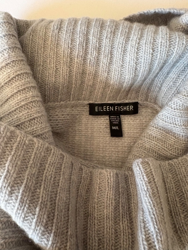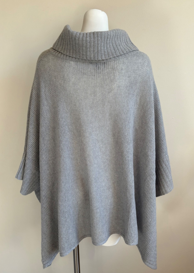Super soft poncho wrap from Eileen Fisher. Basically a large rectangle with collared neck hole in the center, it is made of 80% merino wool with 20% cashmere for a luxurious feel as well as unexpected insulation from such a lightweight knit. Collar is ribbed as are edges along arms (there is stitching in ribbing to make "cuffs" so it doesn't slide off). In excellent condition. One size.
