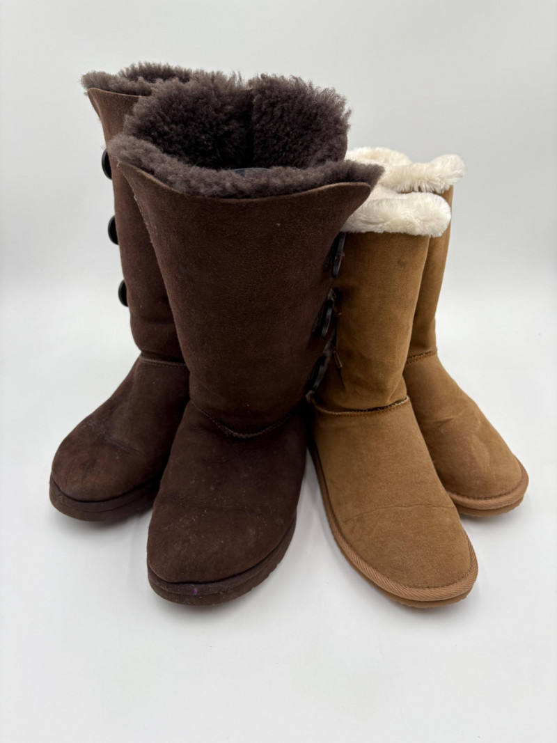 Two similar style casual boots at the high end and the low end of the scale. The dark brown suede leather boots are from the maker that made this style of boot famous: UGG of Australia. Sheepskin lining, elasticated buttons, and rubber sole. In good used condition with some wear on toes and shaft - see last photo - but a suede brush would really perk them up. Size 7. Pale pair is all synthetic materials from Old Navy and considerably lighter in weight. Has most of the features of the more expensive pair, but not the quality materials. In good used condition. Size 7.