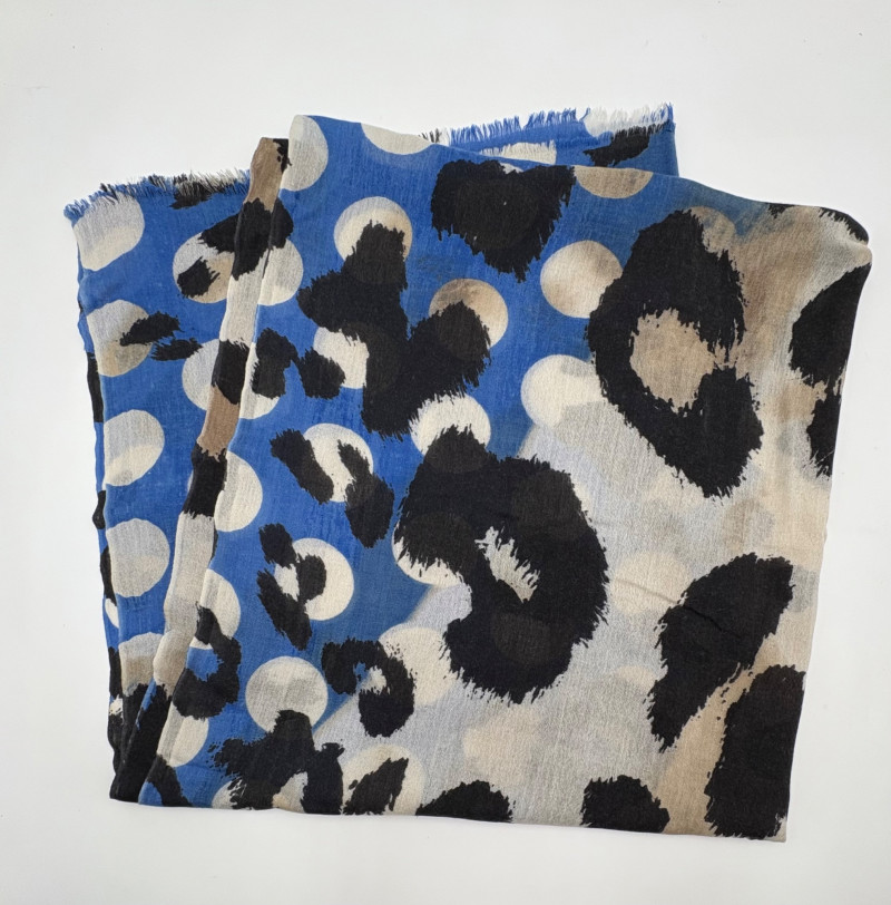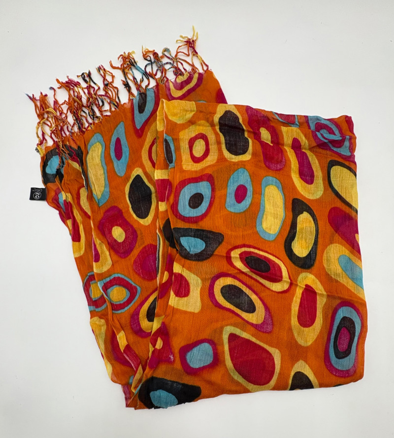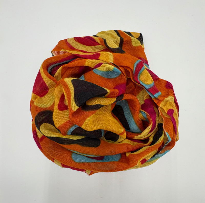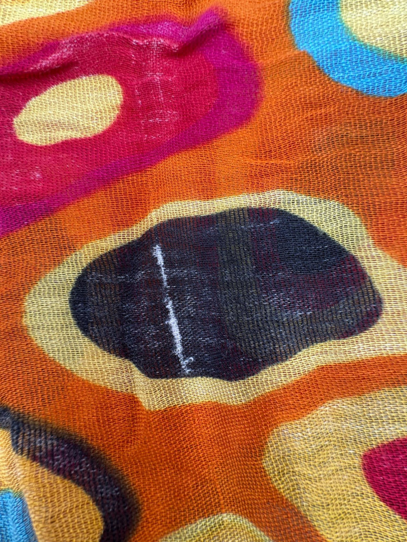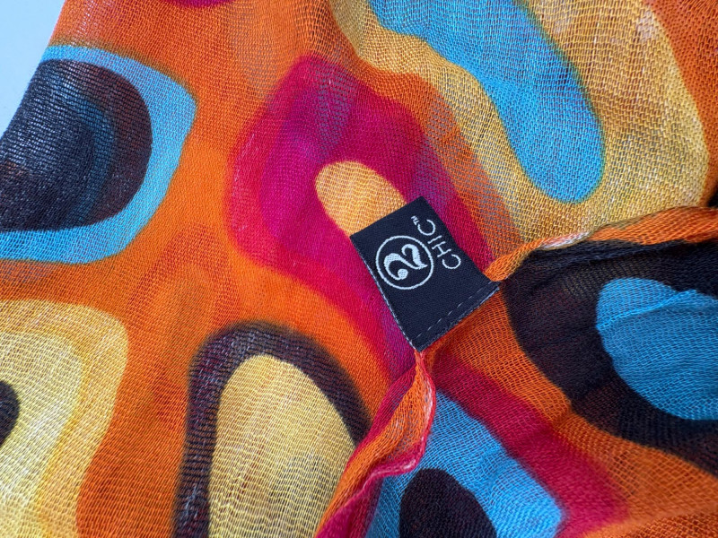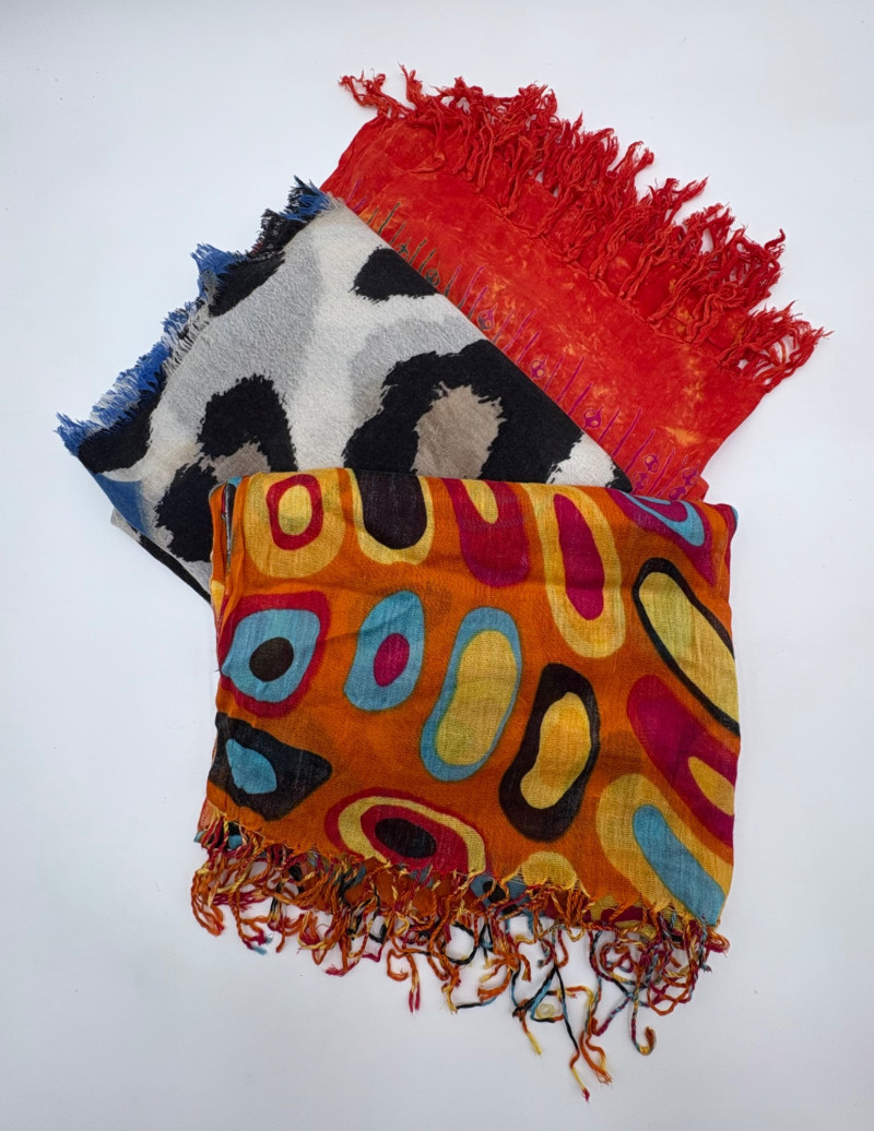Scarf with dark orange background has fringe on short ends and a batik-like print in purple, green, blue, and yellow. No maker or fabric tag - feels like a cotton blend. Measures approx. 54“ x 44“. Scarf with medium orange background from 2 Chic has abstract circles blue, red, black, yellow, and fringe on the short ends. 100% cotton.* Measures approx. 24" x 70". Scarf with blue/beige background from Yarnz has animal print in black & beige with blue and white polka dots. 70% cashmere with 30% silk. Fringe on short ends. Measures approx. 80" x 36“. * this scarf appear to have been printed by sublimation which means there are spots of white that the printing didn't color; the spots are not flaws - last photo is one of the most noticeable sections.