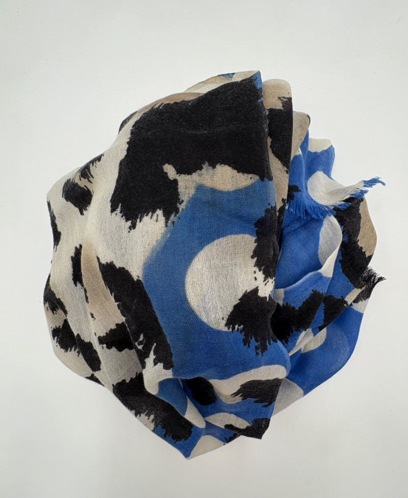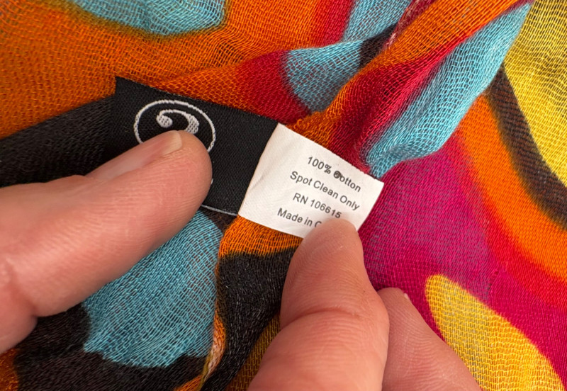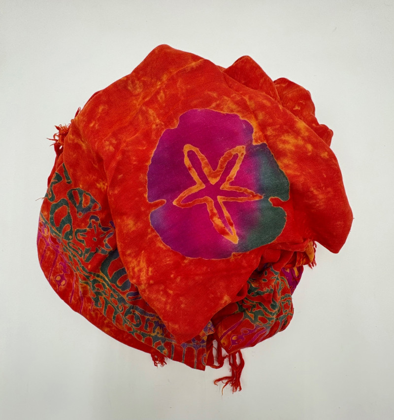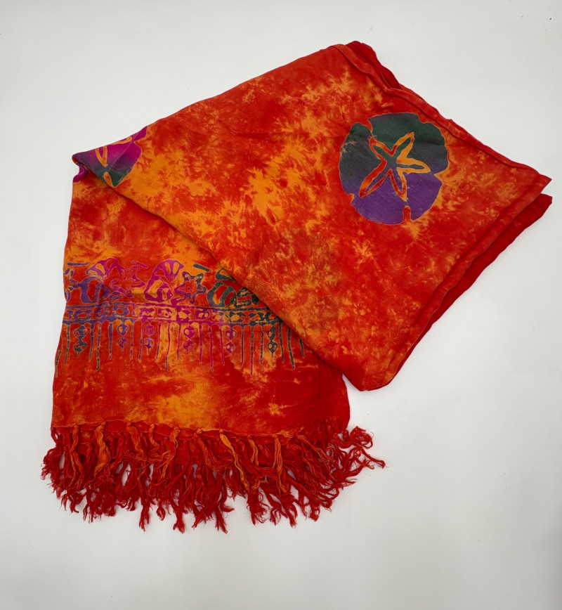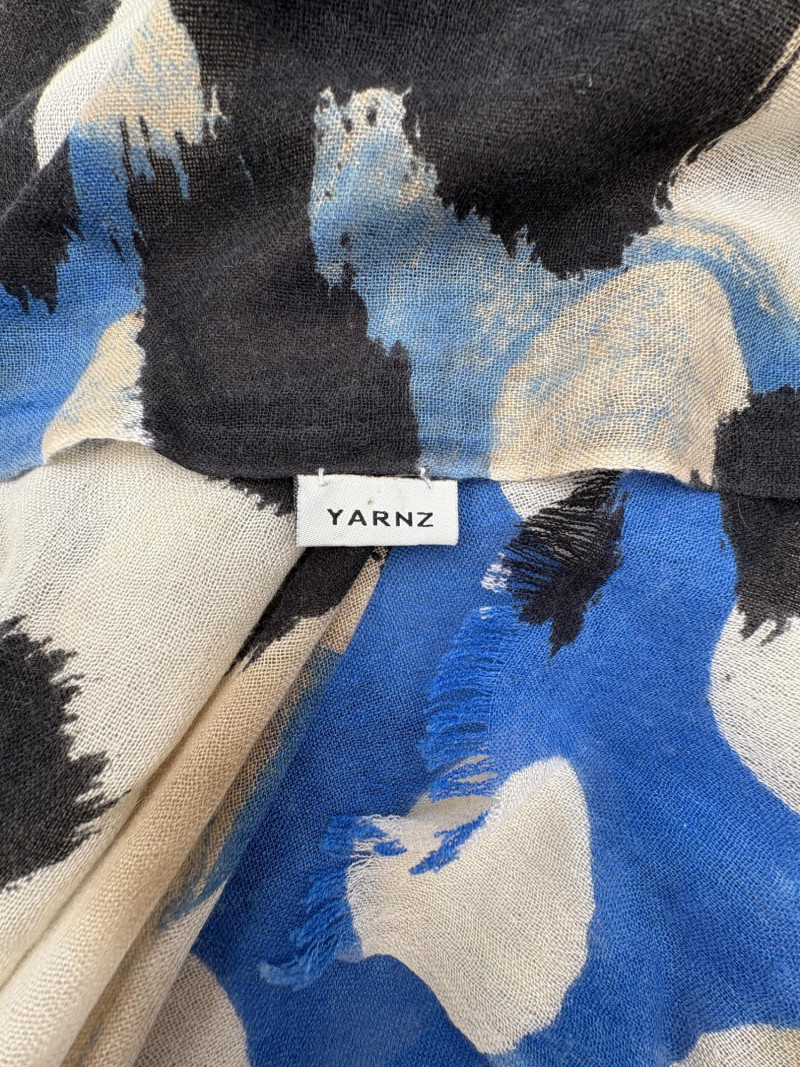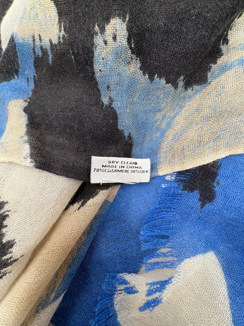 Scarf with dark orange background has fringe on short ends and a batik-like print in purple, green, blue, and yellow. No maker or fabric tag - feels like a cotton blend. Measures approx. 54“ x 44“. Scarf with medium orange background from 2 Chic has abstract circles blue, red, black, yellow, and fringe on the short ends. 100% cotton.* Measures approx. 24" x 70". Scarf with blue/beige background from Yarnz has animal print in black & beige with blue and white polka dots. 70% cashmere with 30% silk. Fringe on short ends. Measures approx. 80" x 36“. * this scarf appear to have been printed by sublimation which means there are spots of white that the printing didn't color; the spots are not flaws - last photo is one of the most noticeable sections.