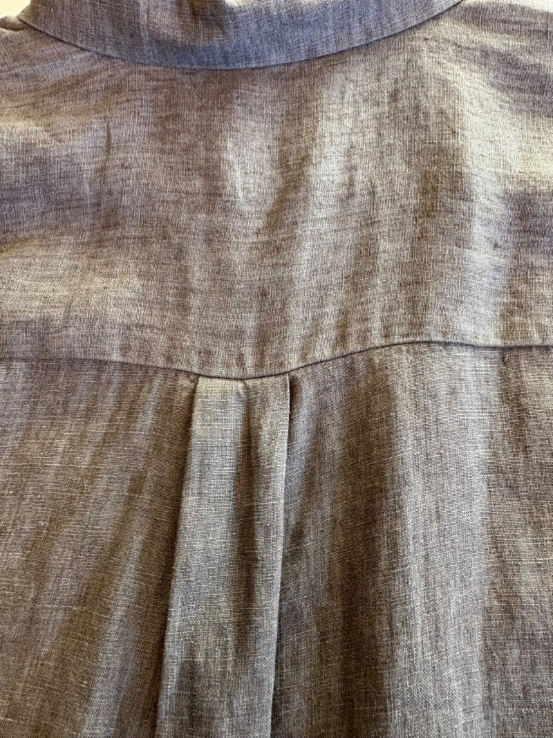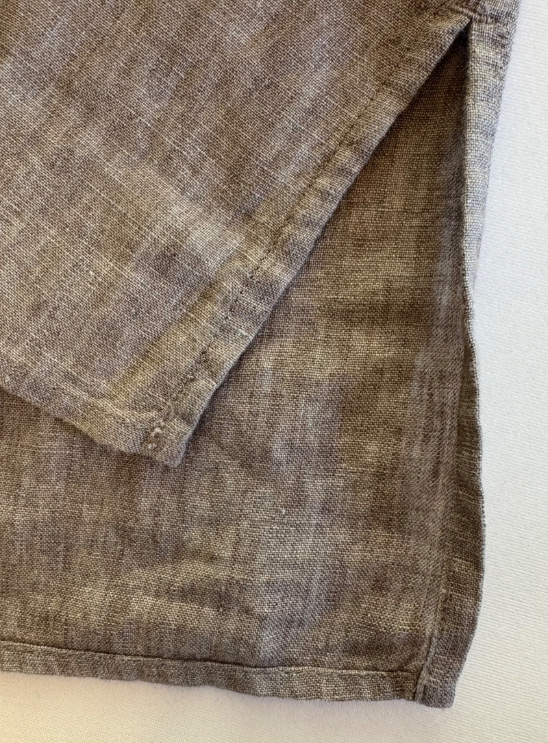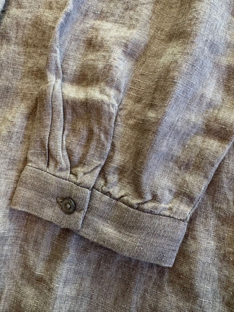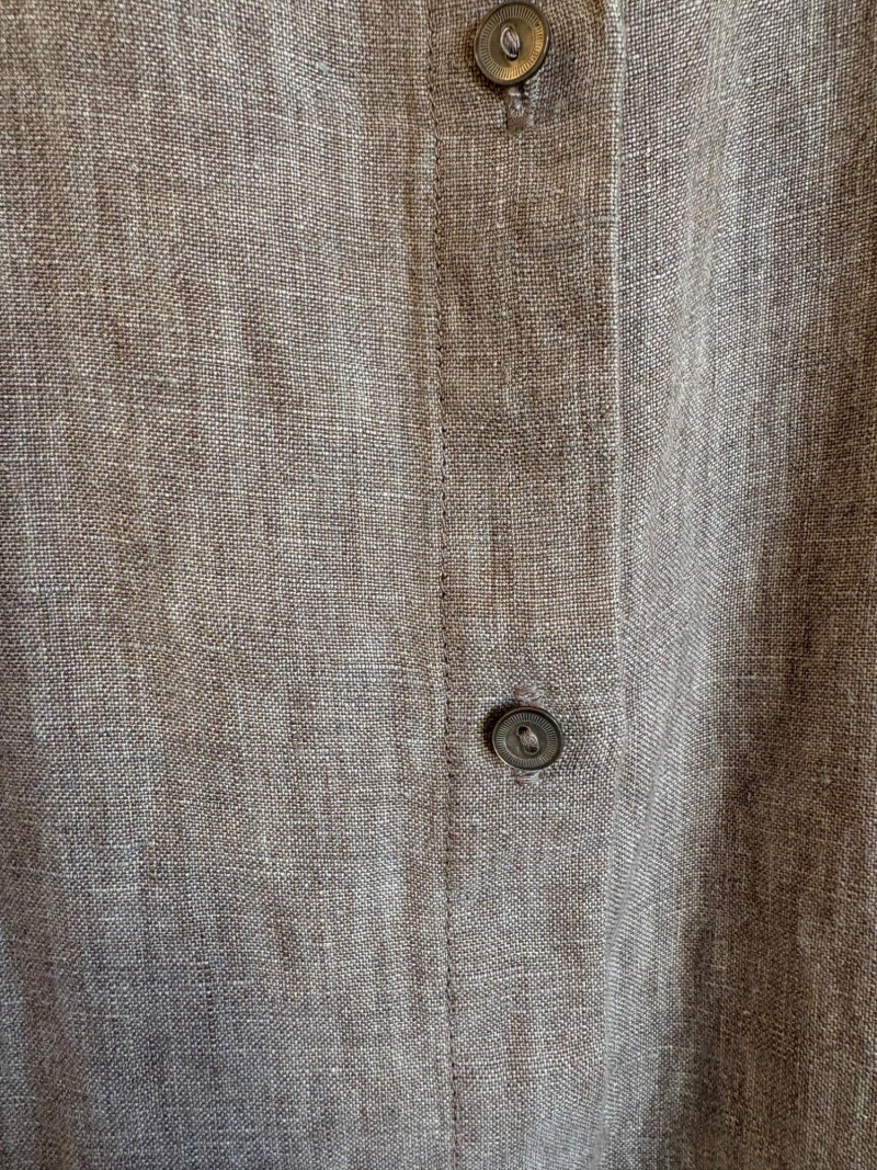 Classic linen shirt in beautiful pale brown. Button front closure with collar, single-button pleated cuffs, yoke with center back pleat, and split hem. New with tag. 100% organic linen. Measures 24.5" pit to pit and 31" from center back neck seam to back hemline. Size tag says XL.