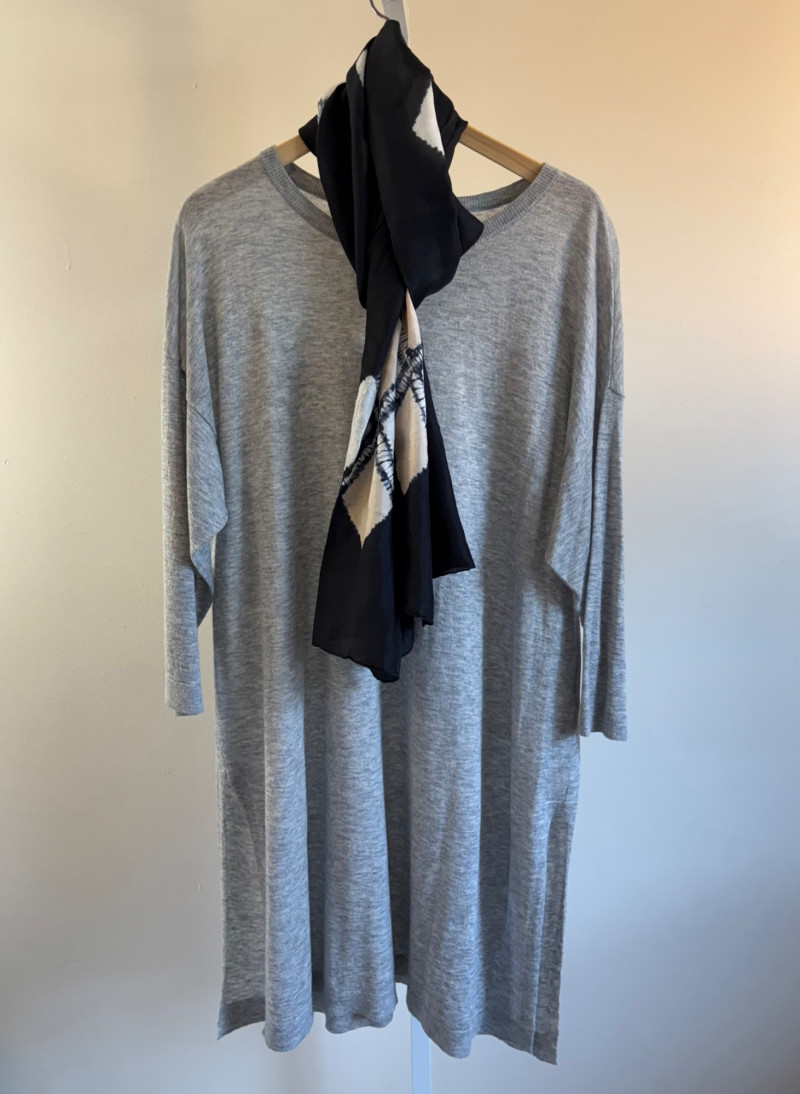 Knit dress and contrasting scarf from Eileen Fisher. Gorgeous flowing grey sweater dress/tunic from Eileen Fisher. Ribbing at neckline, cuffs, and split hemline. In excellent condition. 100% merino wool. Measures 23" pit to pit and 36" from center back neck to back hemline. Size tag says L/G. Black & beige scarf is in excellent condition. 100% silk. Measures approx. 15" x 72".