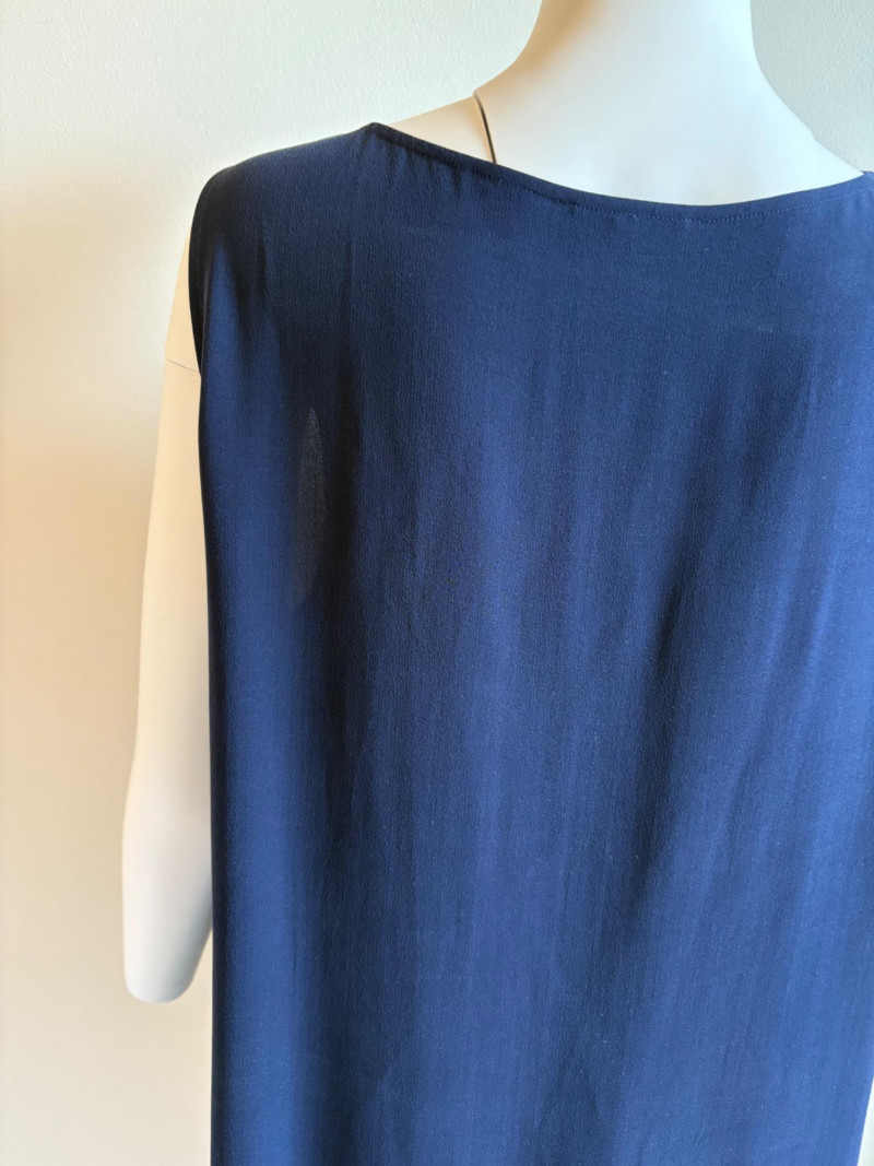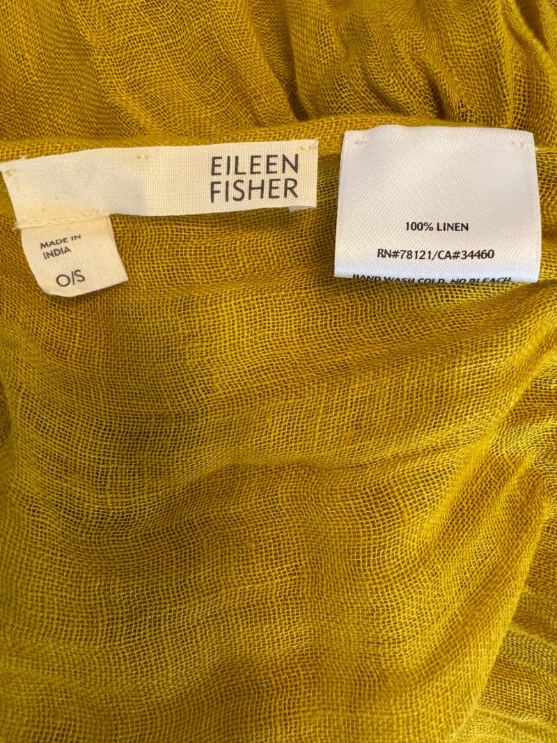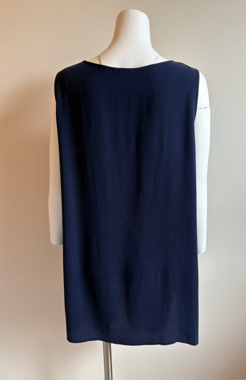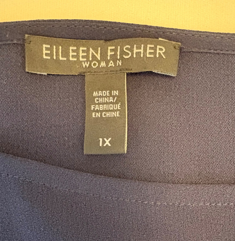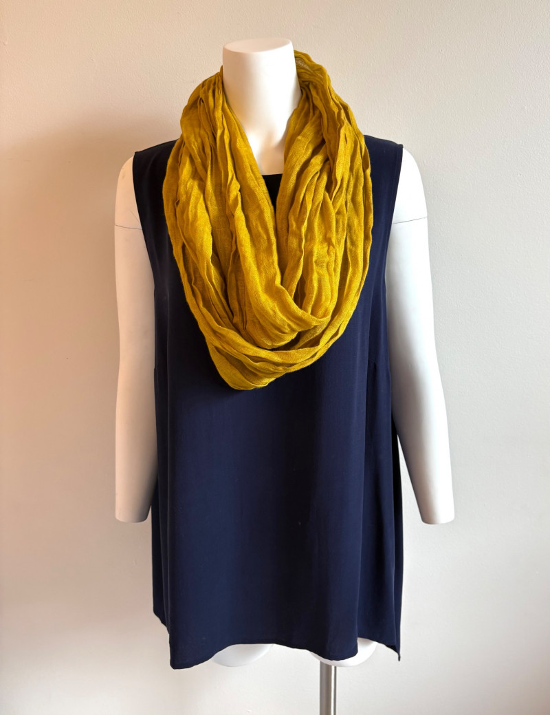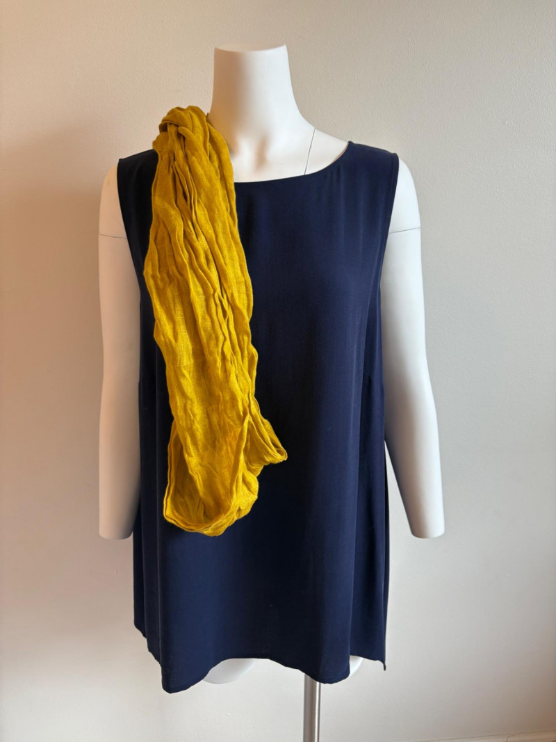 Great shirt & scarf color combo from Eileen Fisher. Navy blue shell has a top-stitched neck, arm holes, and hemline. It also has bust darts and split hem with the back hem approximately 3" longer than front hem. In excellent condition. 100% silk. Measures 23.5" pit to pit and approximately 31" from center back neckline to bottom of back hem. Size tag says 1X. Infinity scarf in acid yellow/gold. 100% linen. In great condition. Approx. 14" wide.