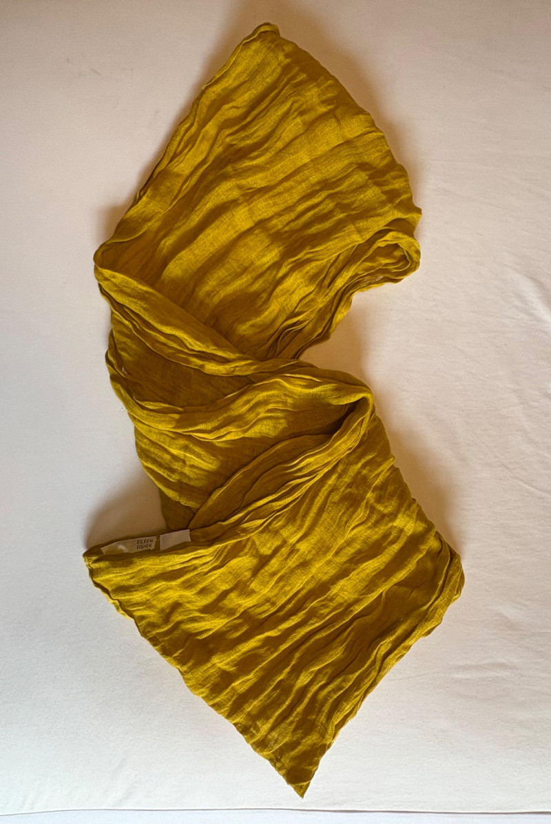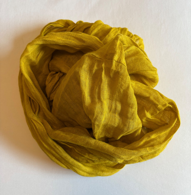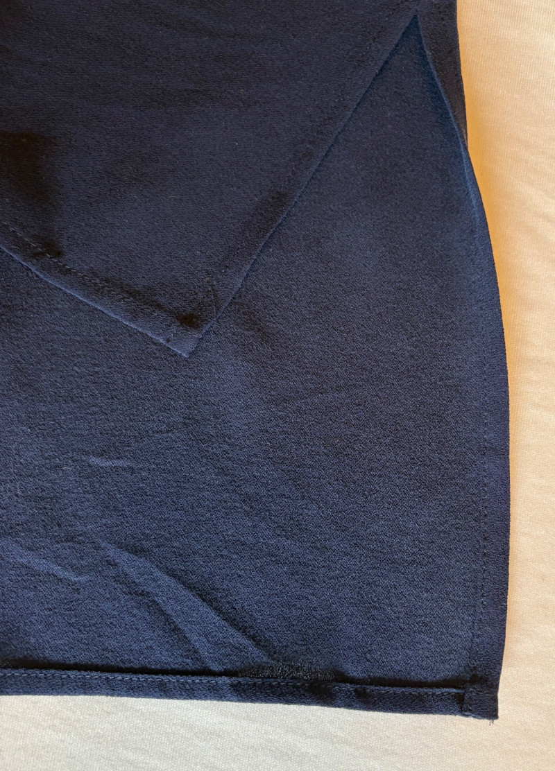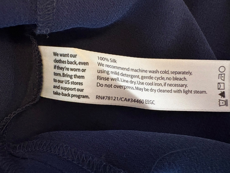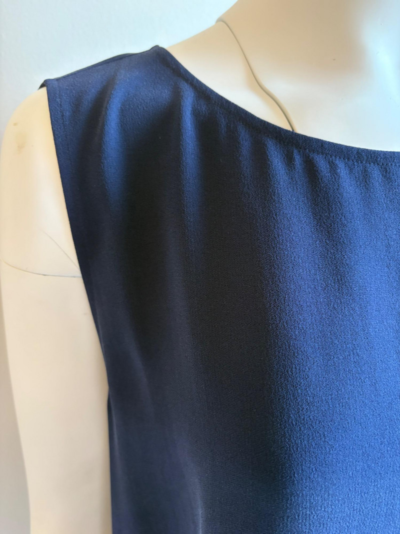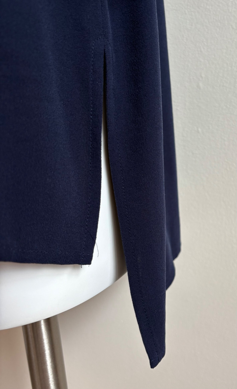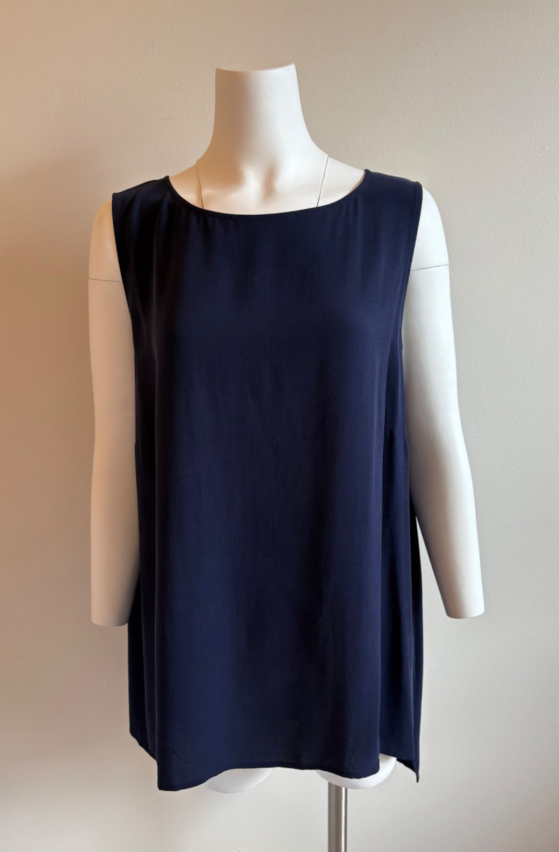 Great shirt & scarf color combo from Eileen Fisher. Navy blue shell has a top-stitched neck, arm holes, and hemline. It also has bust darts and split hem with the back hem approximately 3" longer than front hem. In excellent condition. 100% silk. Measures 23.5" pit to pit and approximately 31" from center back neckline to bottom of back hem. Size tag says 1X. Infinity scarf in acid yellow/gold. 100% linen. In great condition. Approx. 14" wide.