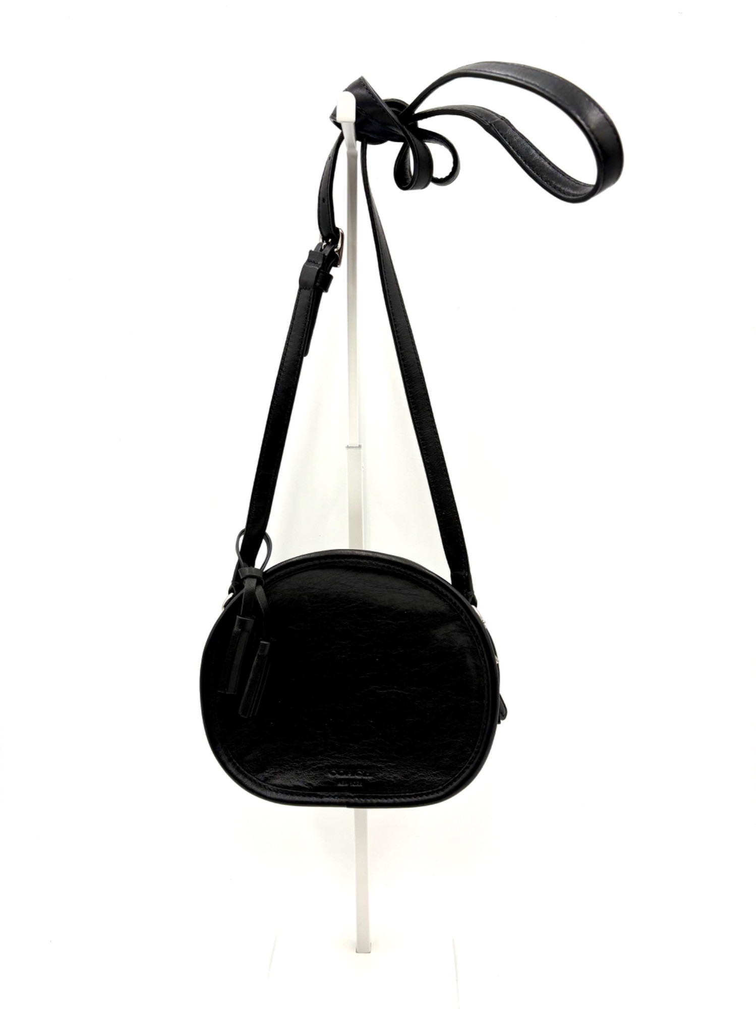 Small leather purse from Coach. Oval-shaped purse is black leather with a very simple zipper-closure on top and slender shoulder strap. There is a slide pocket on the back and the Coach label is embossed on the lower front near the base of the purse. The interior is lined in black fabric and has a single slide pocket. Only two small decorations on this one - a leather Coach hangtag on a silver chain and a double tassel on the shoulder strap. In excellent condition - shows very little signs of being used and we didn't notice any obvious flaws while photographing. Measures 6" H x 7" W with 24" drop from top of straps to top center of bag (adjustable).