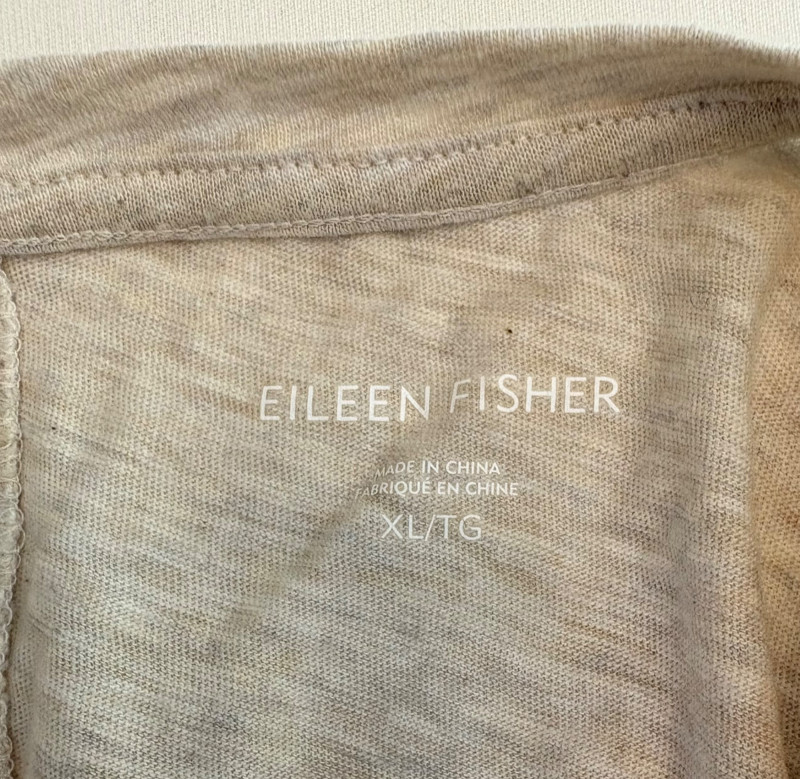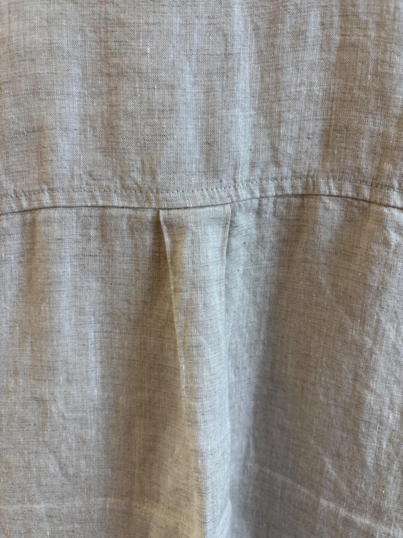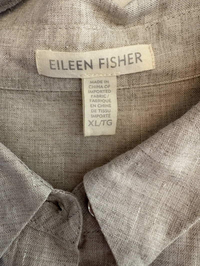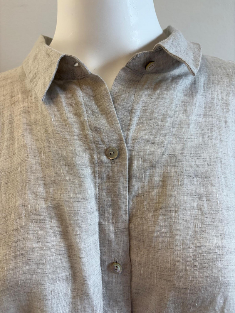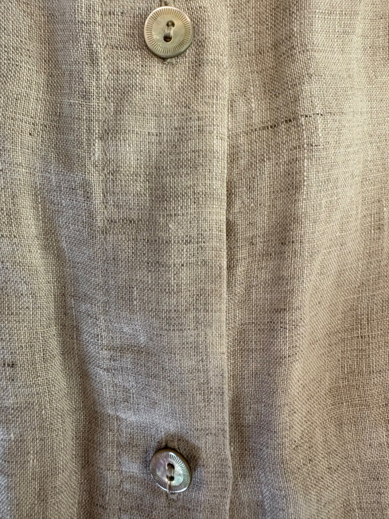 Beige t-shirt and beige linen shirt - perfect for summer from Eileen Fisher Linen over-shirt has small collar, button front closure, and 3-button placket/cuff with pleats. Back yoke with centered pleat and curved hemline. In excellent condition. 100% linen. Measures 25" pit to pit and 31.5" from center back neck seam to bottom back hemline. Size tag is XL Matching t-shirt has short sleeves and shallow scoop neck. 100% cotton. In good condition.* Measures 24.5" pit to pit and 25" from back neck edge to bottom back hem, Printed size tag has faded away, but probably an XL. * we noticed 2 very small discolorations as we were doing close-ups - barely noticeable until taking photos - see last photo.