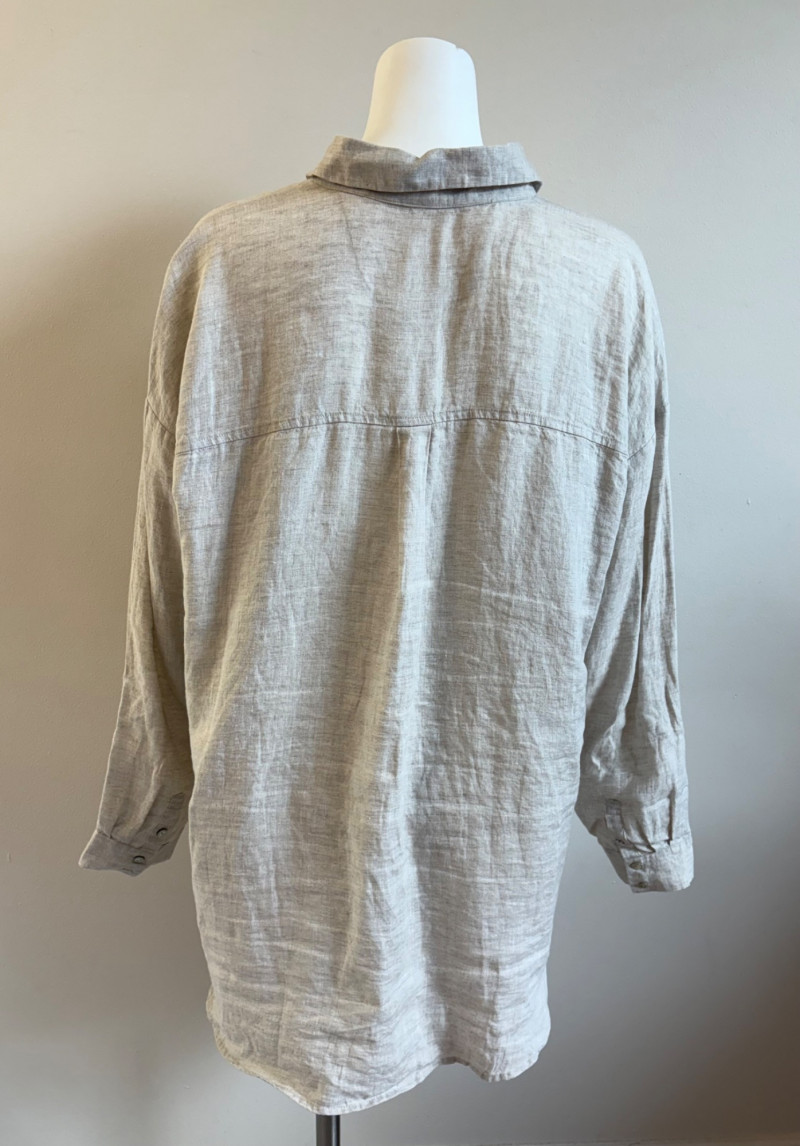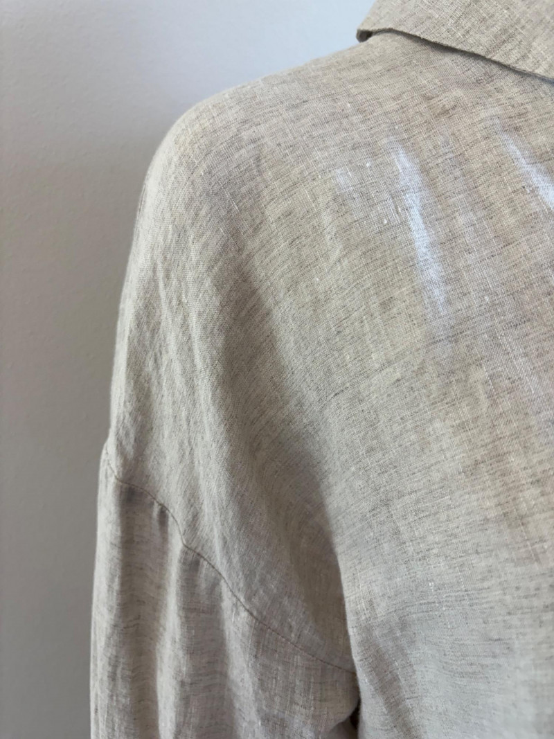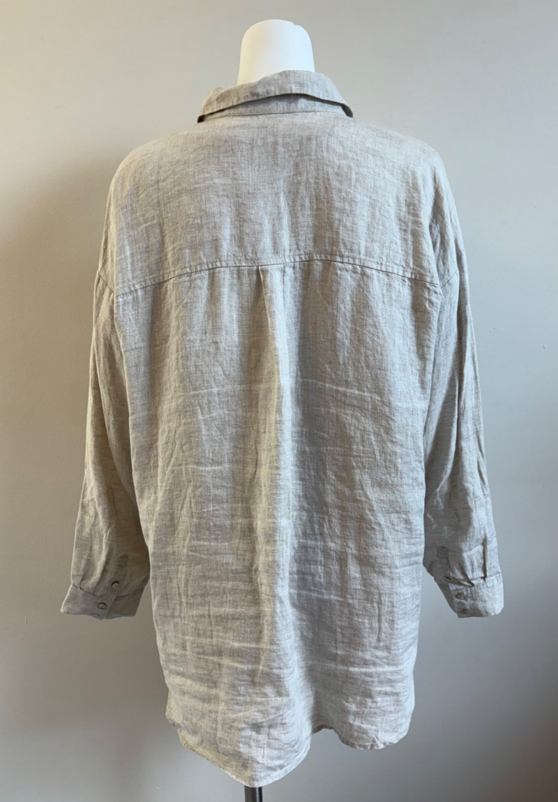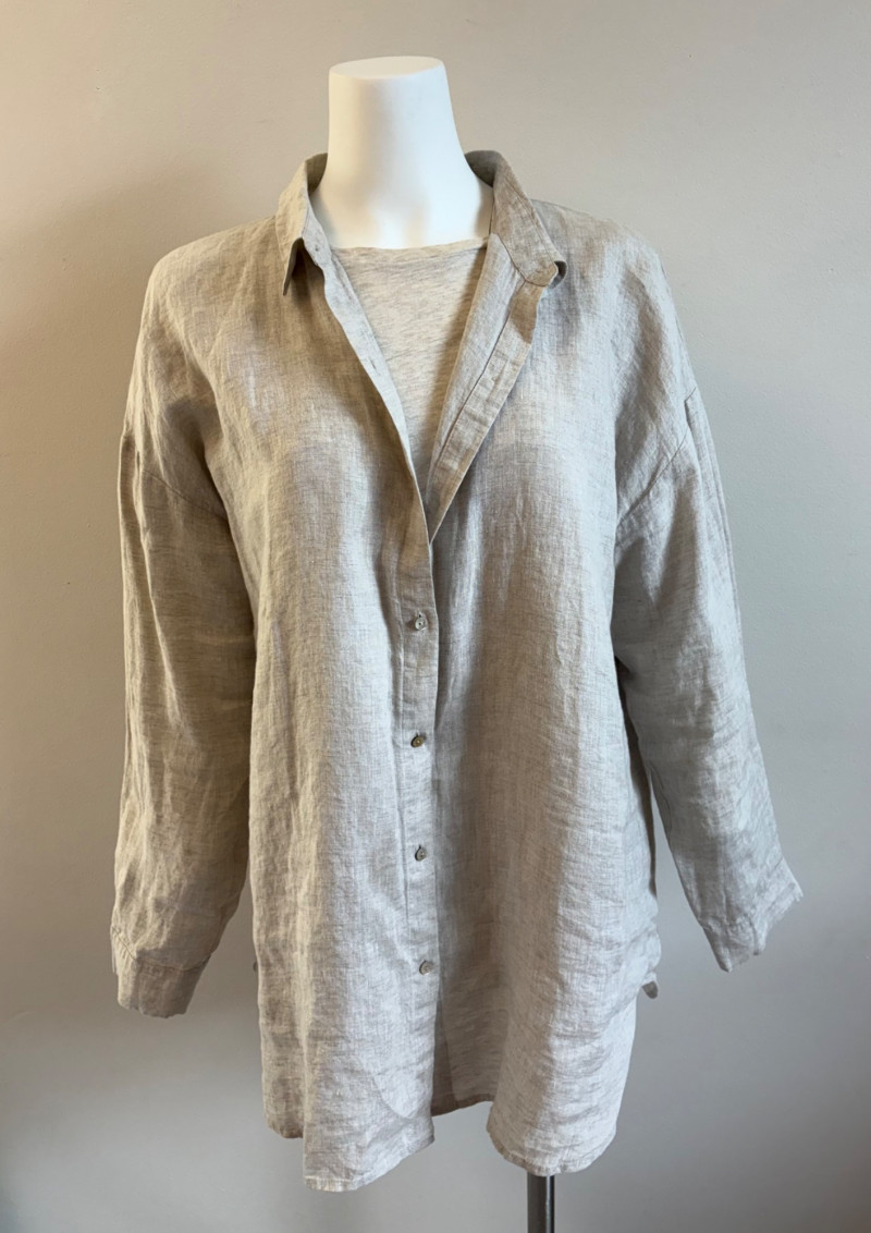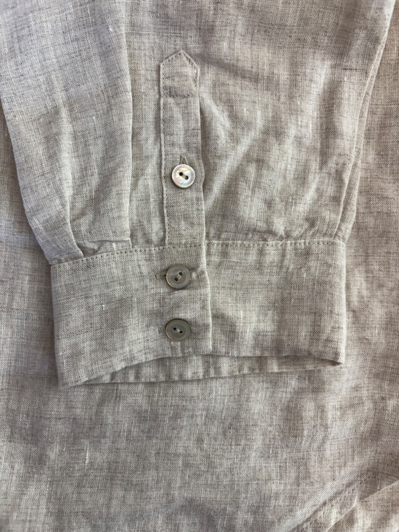 Beige t-shirt and beige linen shirt - perfect for summer from Eileen Fisher Linen over-shirt has small collar, button front closure, and 3-button placket/cuff with pleats. Back yoke with centered pleat and curved hemline. In excellent condition. 100% linen. Measures 25" pit to pit and 31.5" from center back neck seam to bottom back hemline. Size tag is XL Matching t-shirt has short sleeves and shallow scoop neck. 100% cotton. In good condition.* Measures 24.5" pit to pit and 25" from back neck edge to bottom back hem, Printed size tag has faded away, but probably an XL. * we noticed 2 very small discolorations as we were doing close-ups - barely noticeable until taking photos - see last photo.