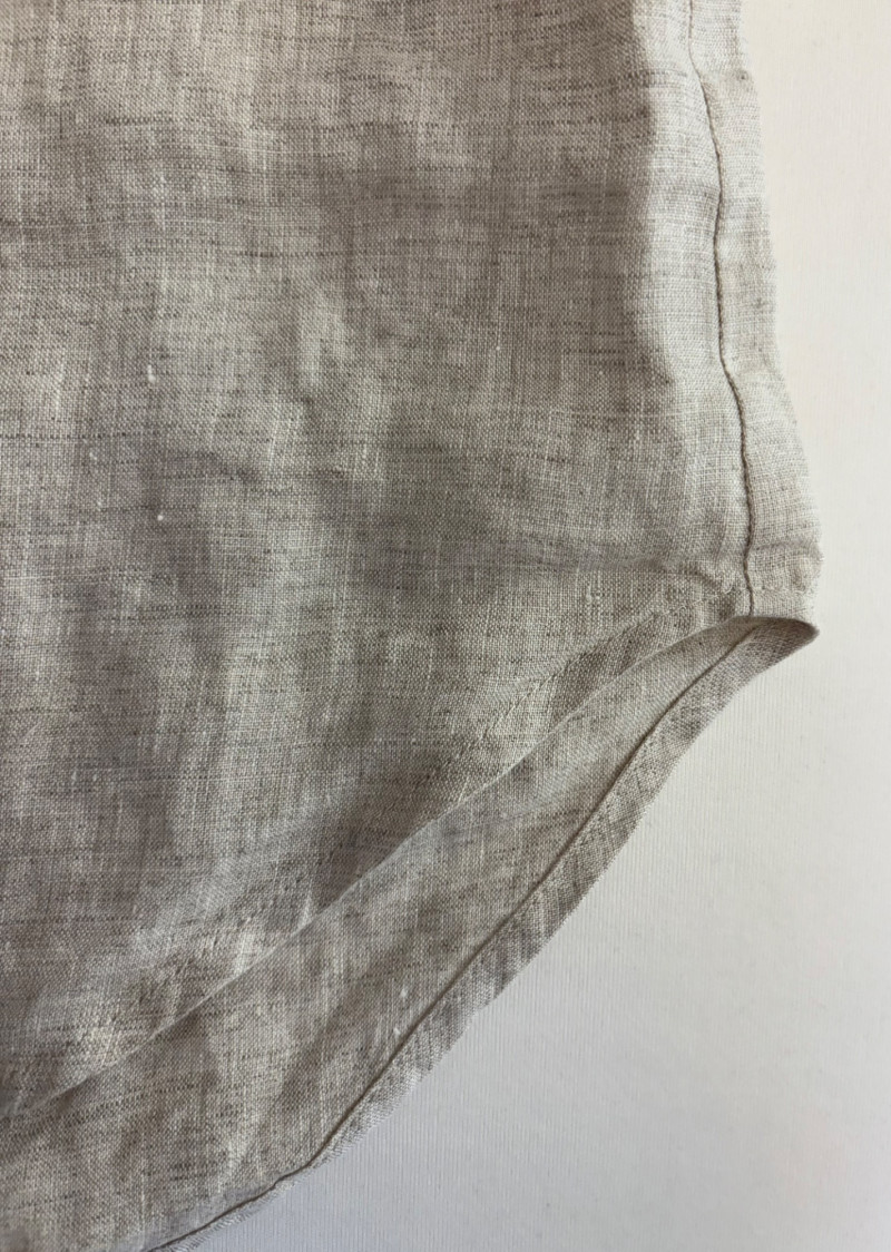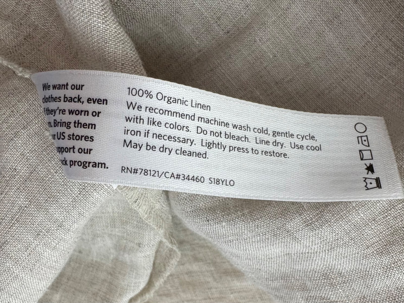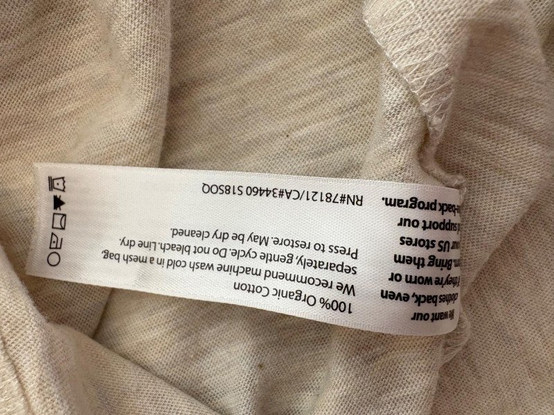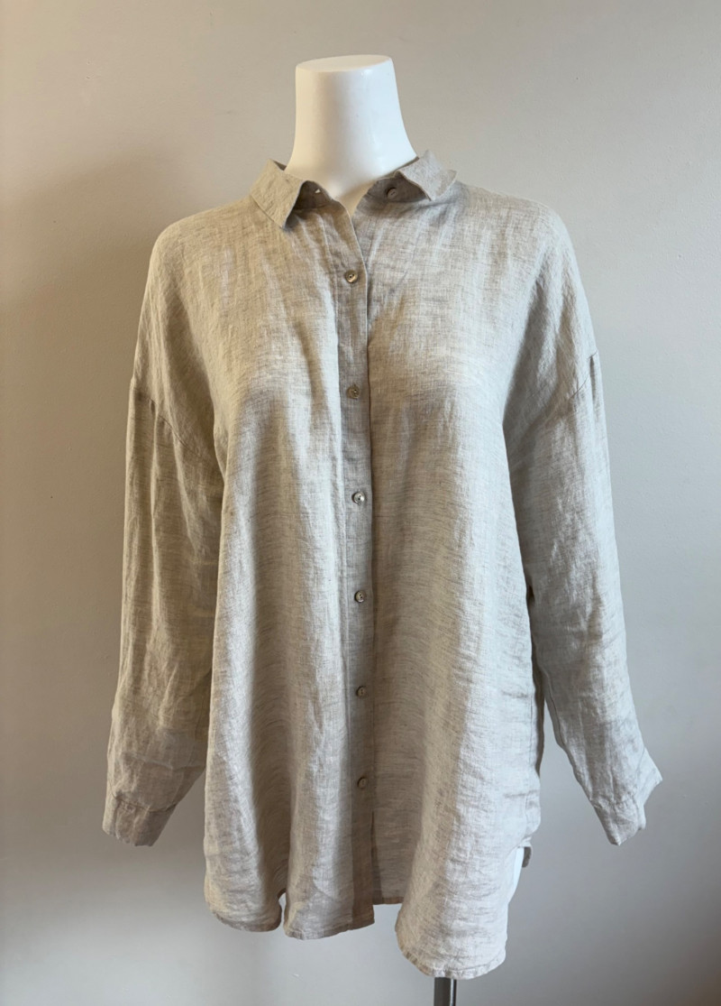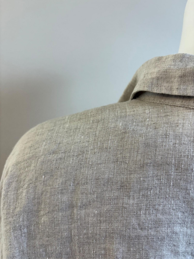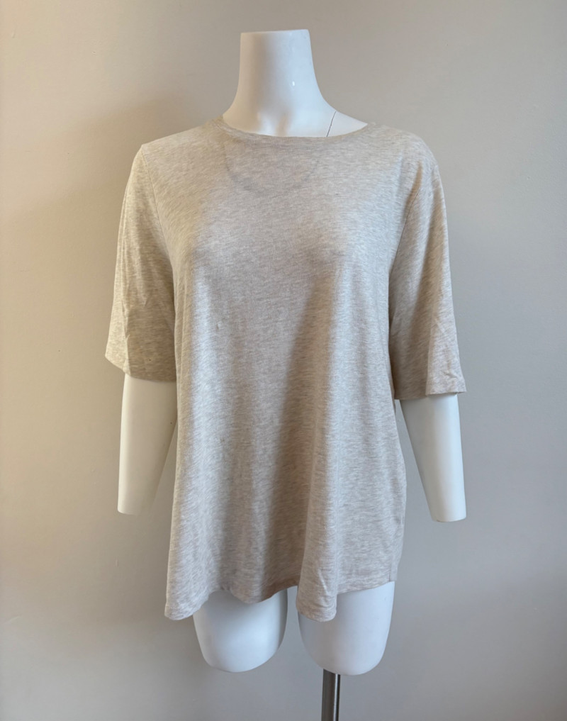Beige t-shirt and beige linen shirt - perfect for summer from Eileen Fisher Linen over-shirt has small collar, button front closure, and 3-button placket/cuff with pleats. Back yoke with centered pleat and curved hemline. In excellent condition. 100% linen. Measures 25" pit to pit and 31.5" from center back neck seam to bottom back hemline. Size tag is XL Matching t-shirt has short sleeves and shallow scoop neck. 100% cotton. In good condition.* Measures 24.5" pit to pit and 25" from back neck edge to bottom back hem, Printed size tag has faded away, but probably an XL. * we noticed 2 very small discolorations as we were doing close-ups - barely noticeable until taking photos - see last photo.