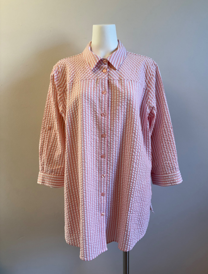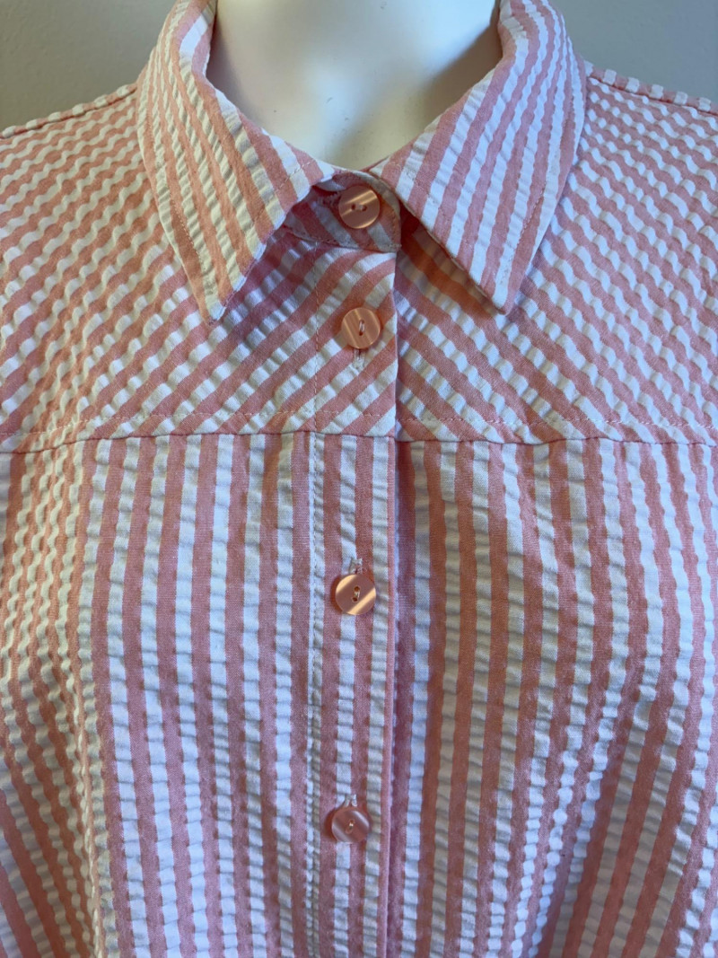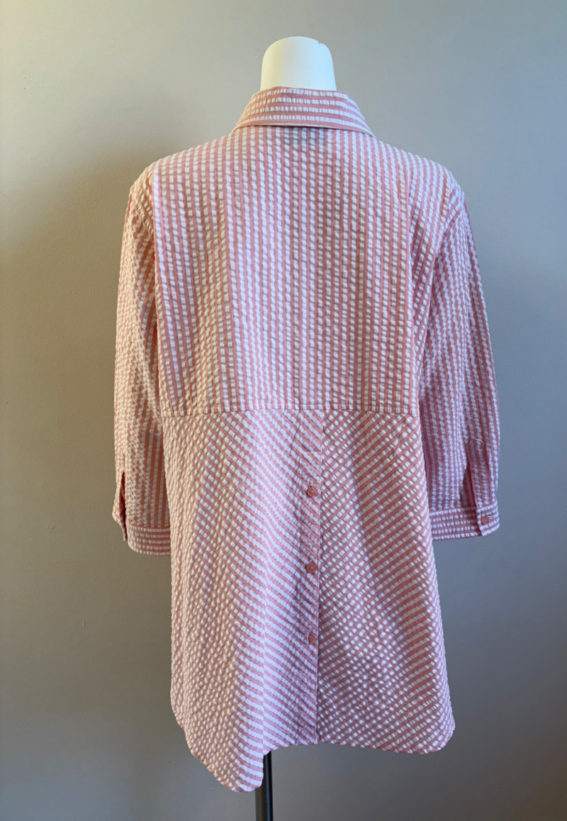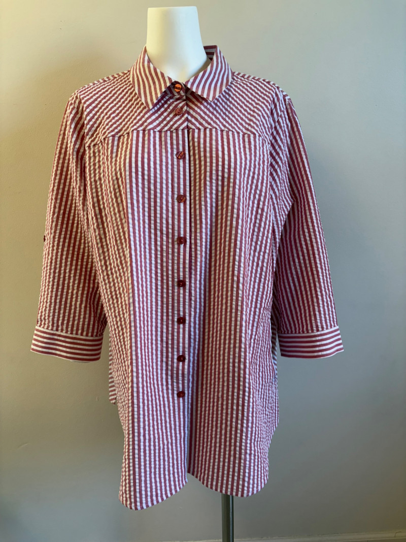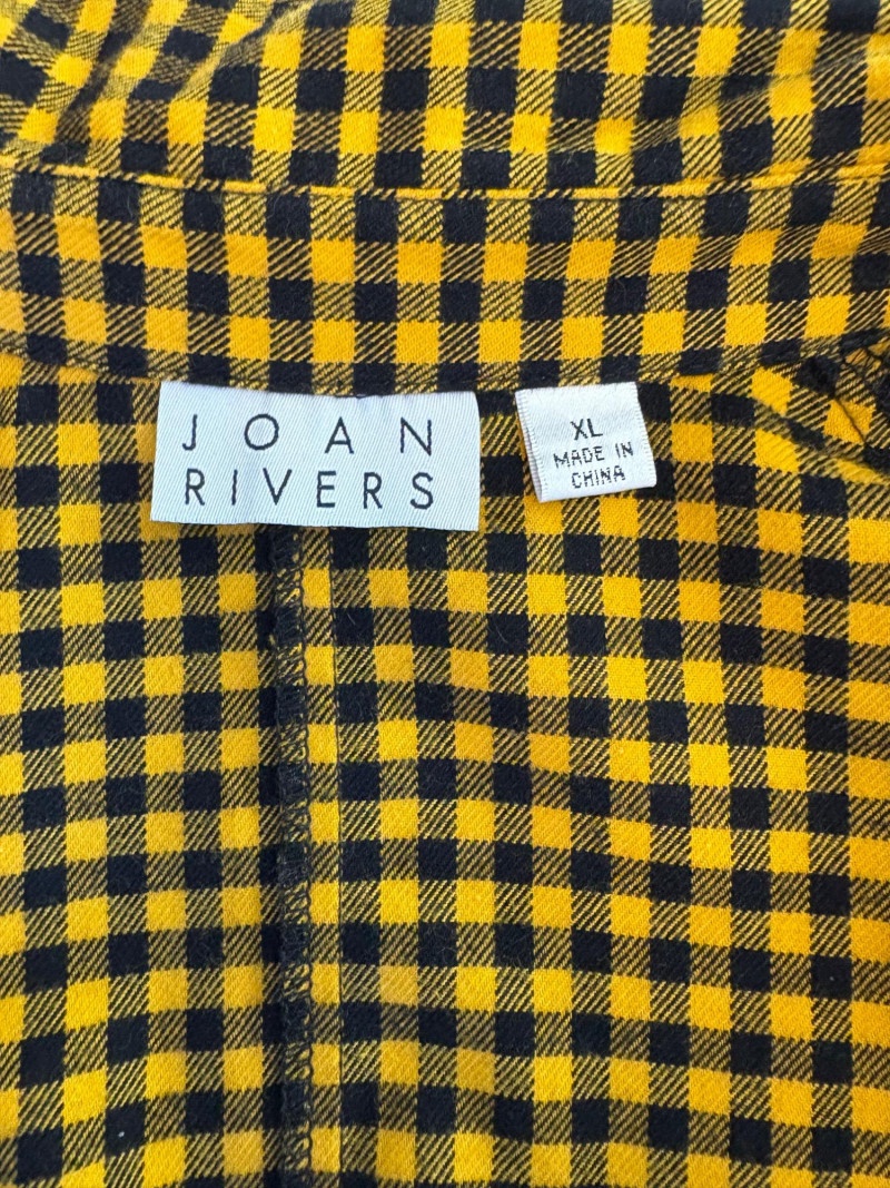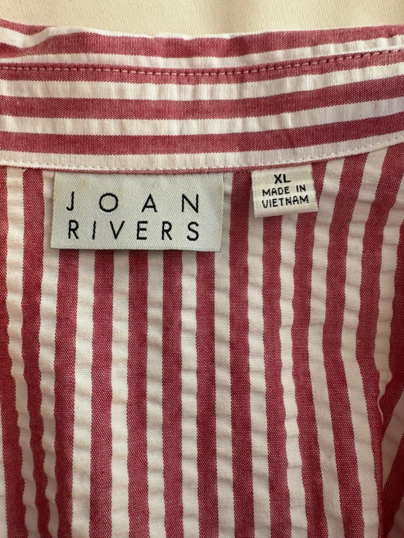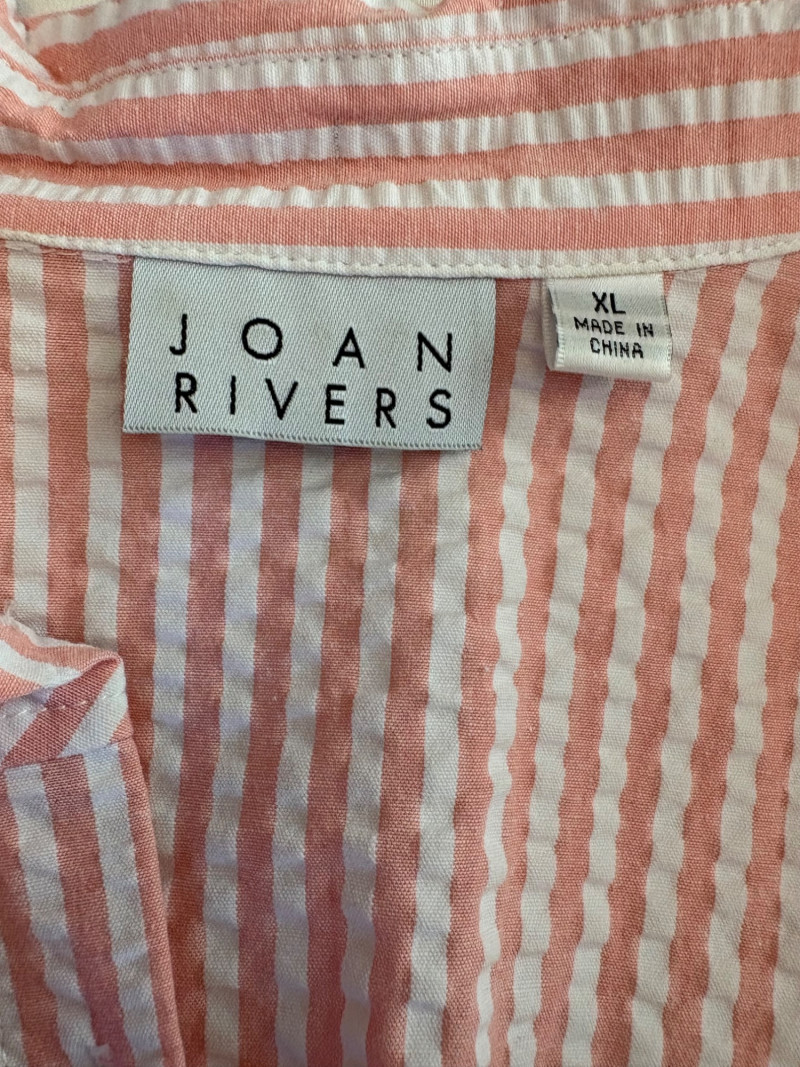 4 shirts with some great features/colors from Joan Rivers & Susan Graver. 2 striped seersucker shirts/shirt jackets from Joan Rivers - one in red & white stripe, the other in pink & white stripe. Both have button front closure, single button closure cuffs with plackets, curved hem, lower back button closure, and in-seam pockets at the hips. 77% cotton with 23% polyester. Both in excellent condition. Measure 25" pit to pit and 31" from center back neckline to back bottom hem. Size tags say XL. Black & gold checked flannel shirt from Joan Rivers has front button closure, pieced shoulder sections, single button closure on banded cuffs, and in-seam pockets at the hips. 100% cotton. Measures 25" pit to pit and 28" from back neckline to back bottom hem. Size tag says XL. Pinkish-beige solid shirt from Susan Graver hangs beautifully. Shirt has front button closure, 2-button cuff closure with placket & pleats, and split hem. In excellent condition. 97% polyester and 3% spandex. Measures 25" pit to pit and 29.5" from center back neckline to back hemline. Size tag says XL.