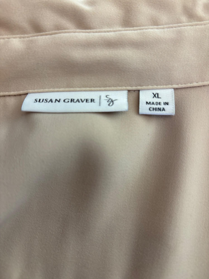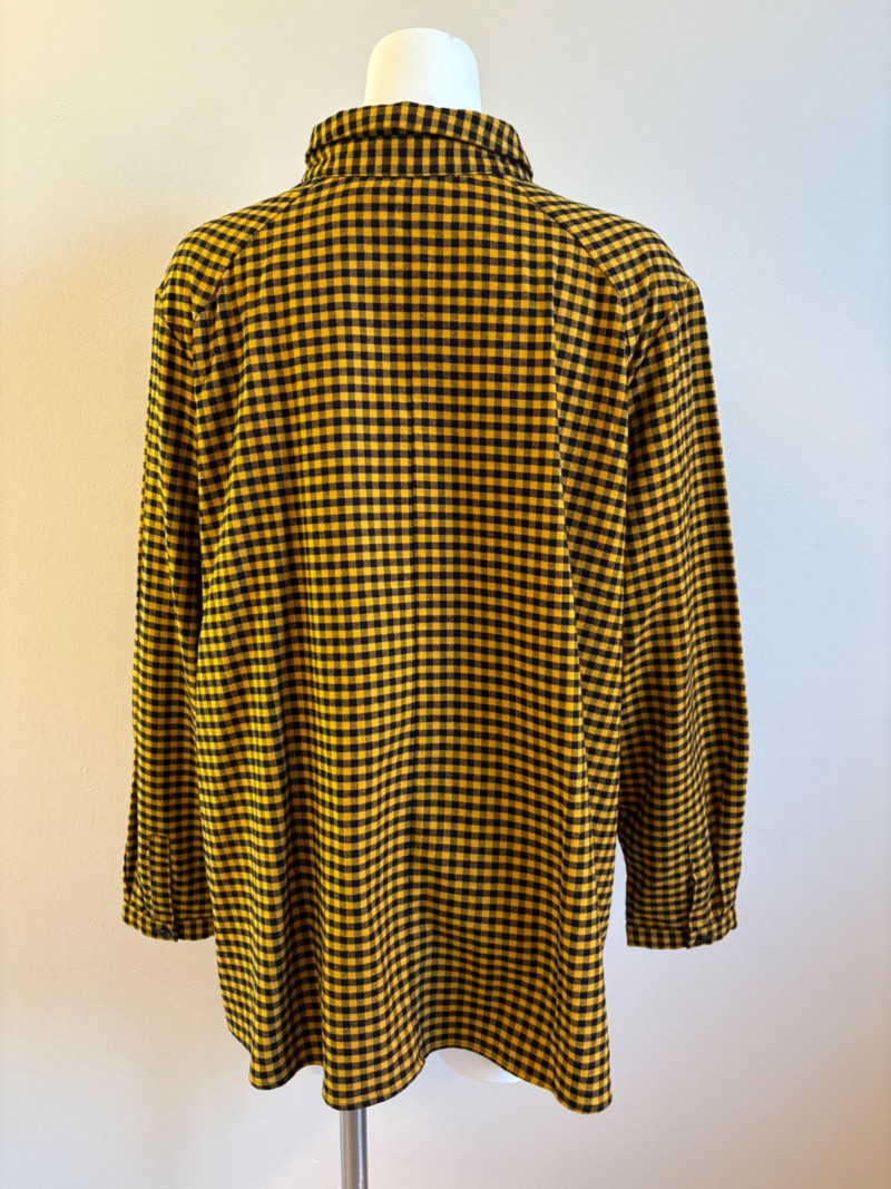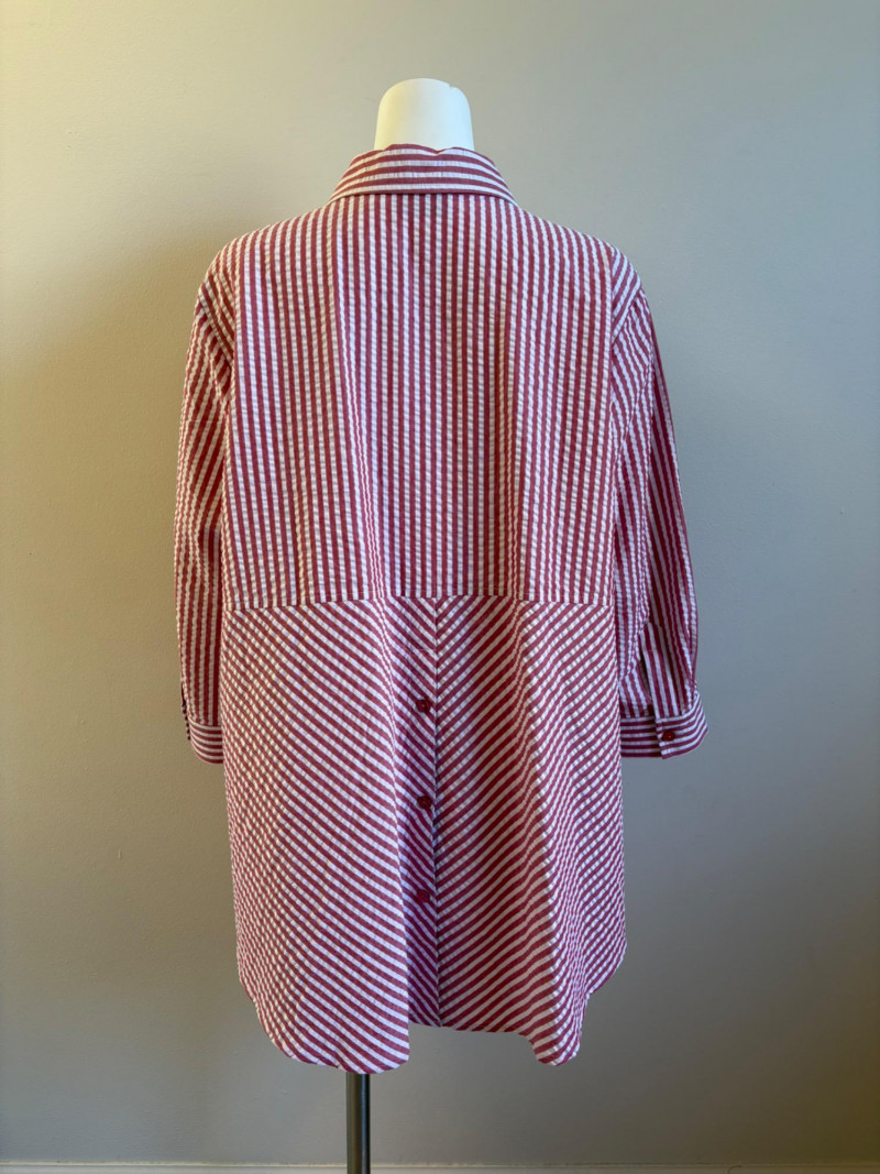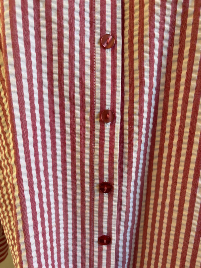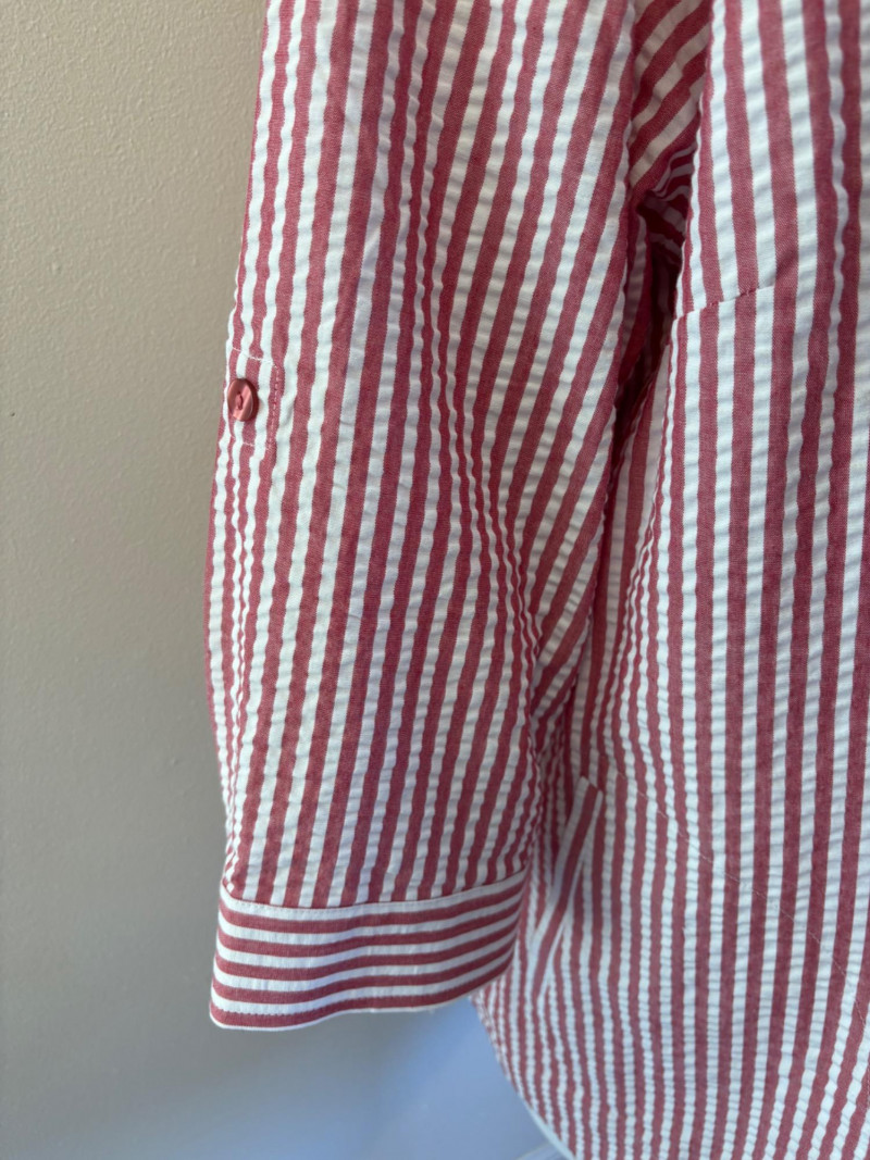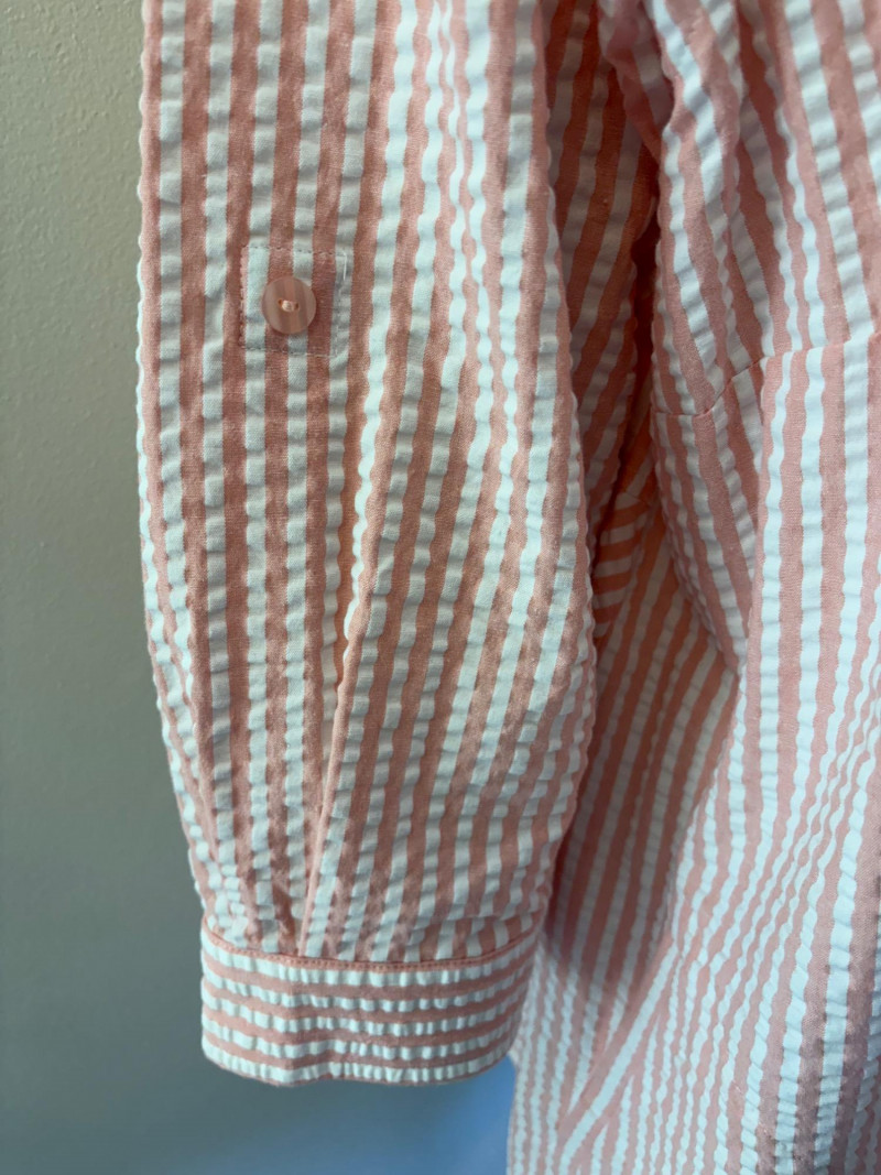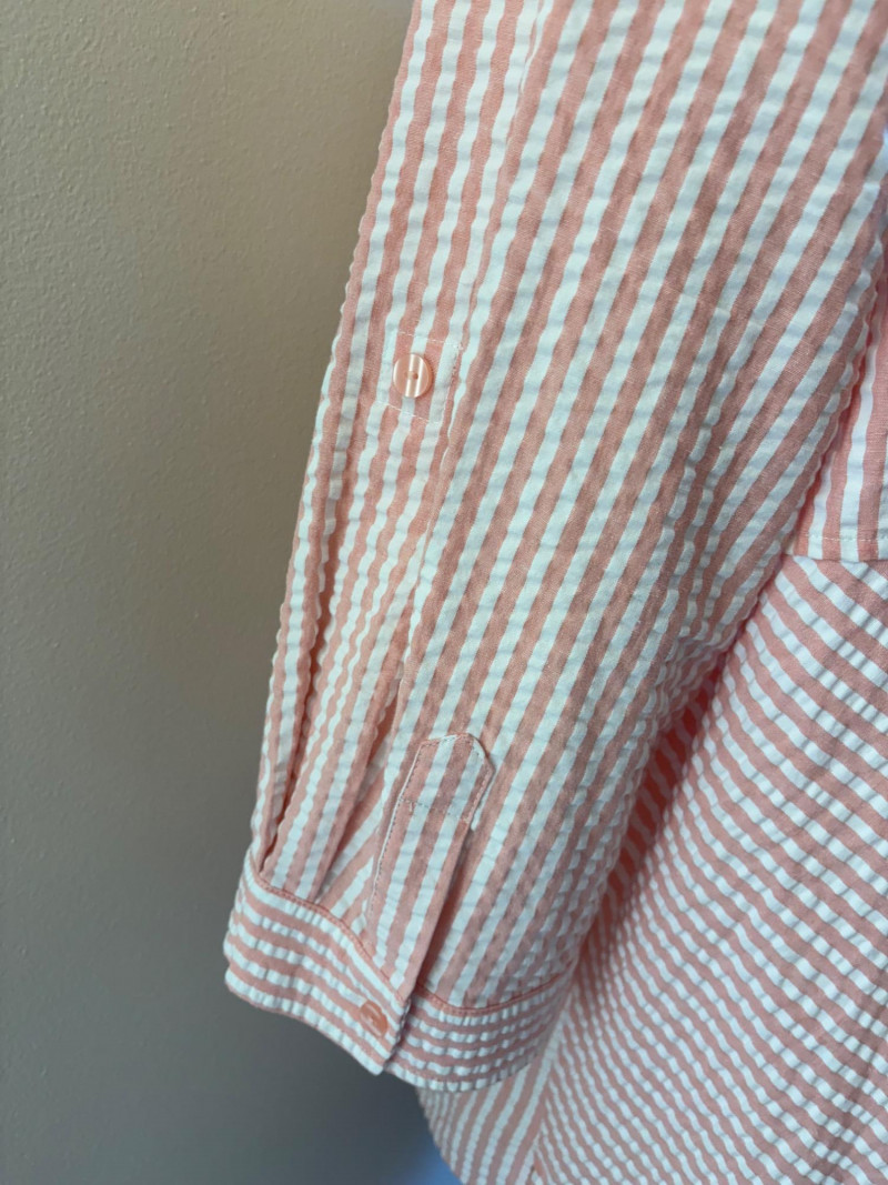 4 shirts with some great features/colors from Joan Rivers & Susan Graver. 2 striped seersucker shirts/shirt jackets from Joan Rivers - one in red & white stripe, the other in pink & white stripe. Both have button front closure, single button closure cuffs with plackets, curved hem, lower back button closure, and in-seam pockets at the hips. 77% cotton with 23% polyester. Both in excellent condition. Measure 25" pit to pit and 31" from center back neckline to back bottom hem. Size tags say XL. Black & gold checked flannel shirt from Joan Rivers has front button closure, pieced shoulder sections, single button closure on banded cuffs, and in-seam pockets at the hips. 100% cotton. Measures 25" pit to pit and 28" from back neckline to back bottom hem. Size tag says XL. Pinkish-beige solid shirt from Susan Graver hangs beautifully. Shirt has front button closure, 2-button cuff closure with placket & pleats, and split hem. In excellent condition. 97% polyester and 3% spandex. Measures 25" pit to pit and 29.5" from center back neckline to back hemline. Size tag says XL.